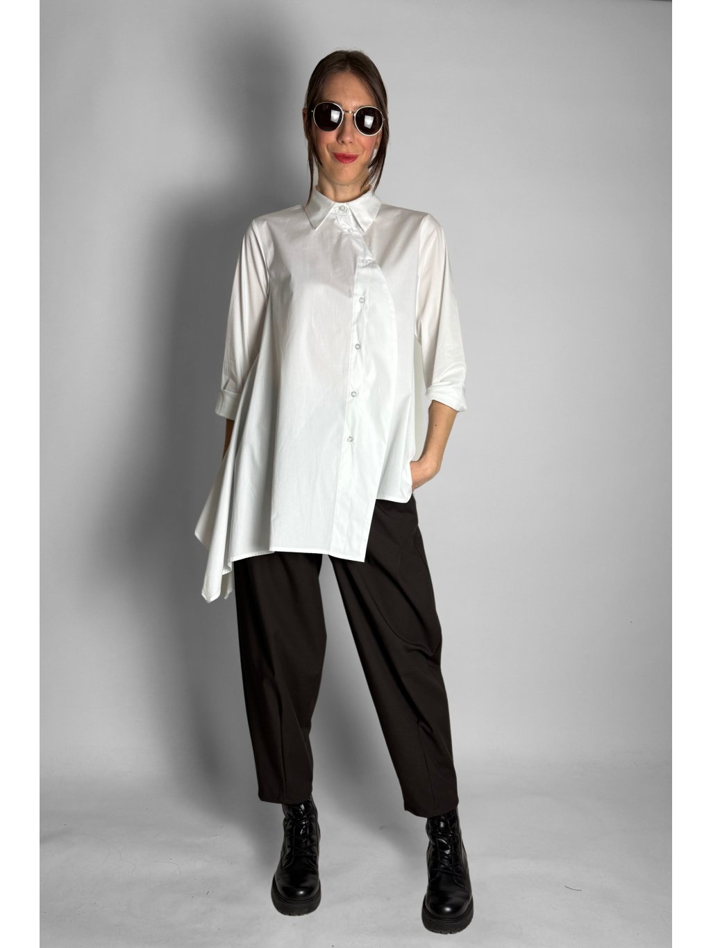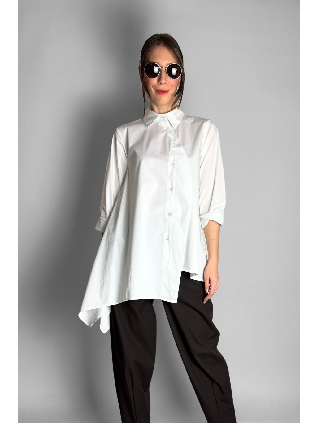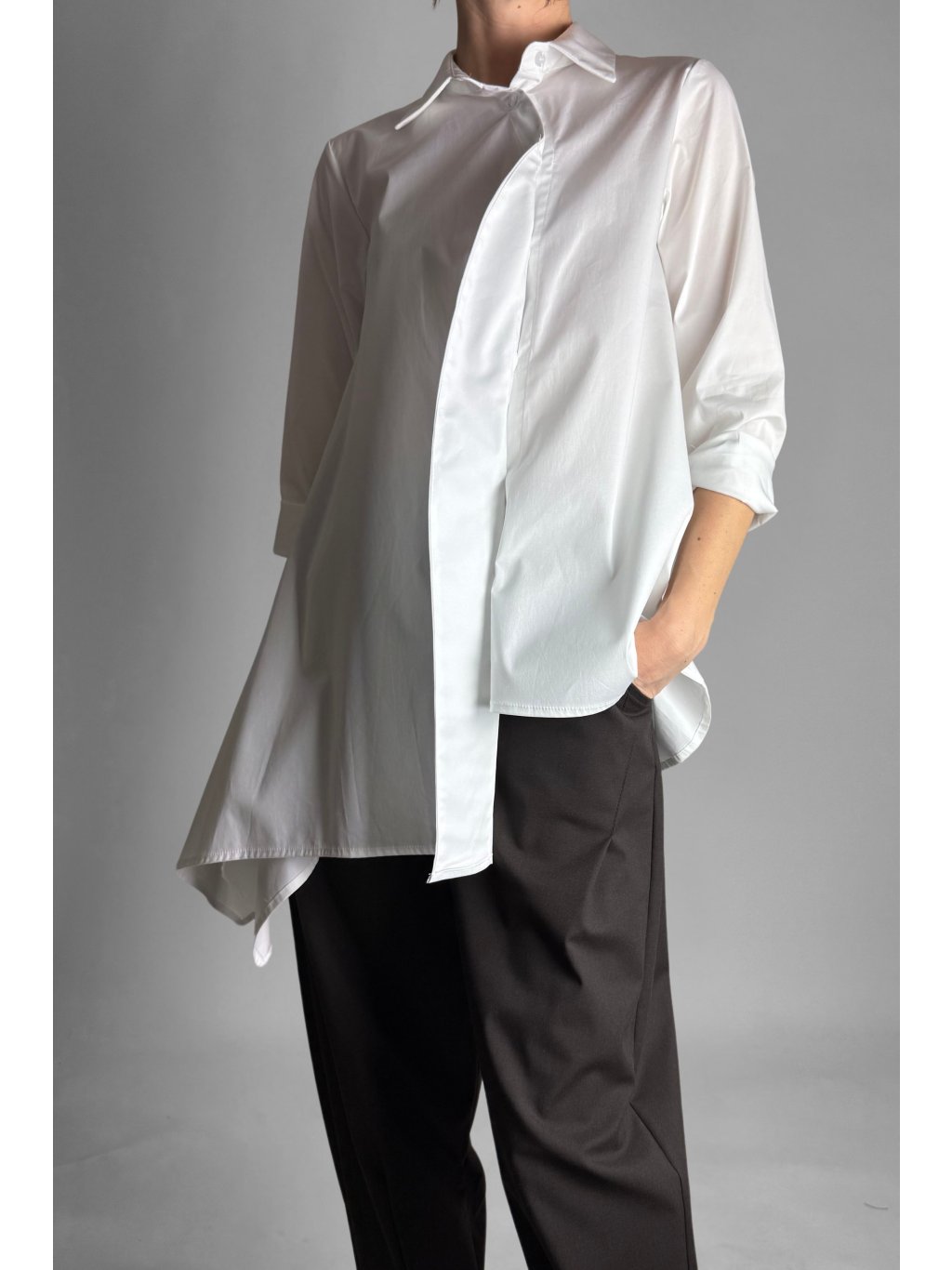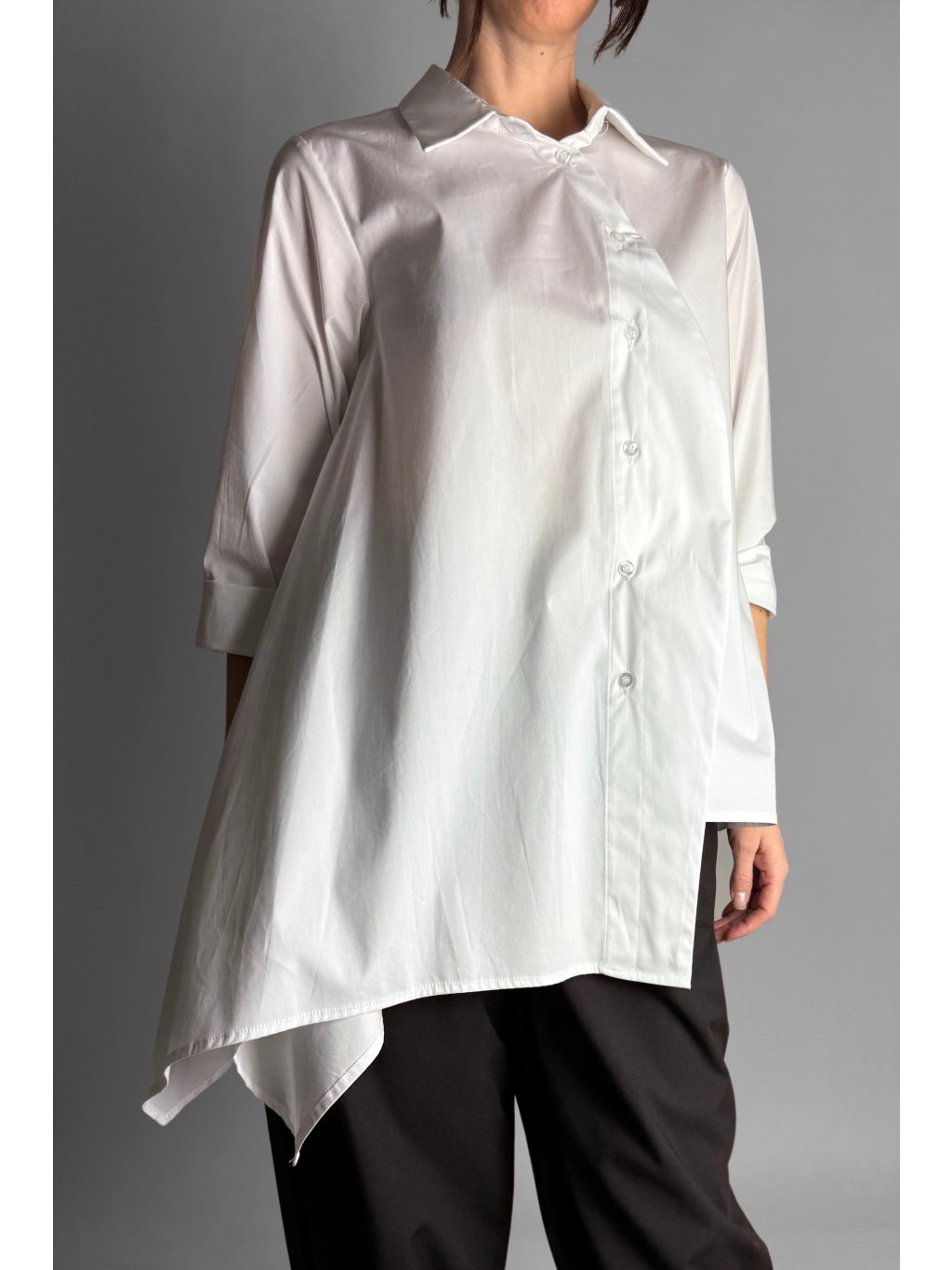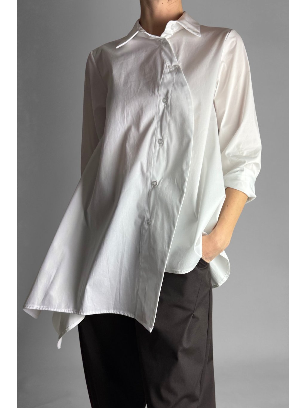 Elegantní asymetrická košile s klasickým límečkem a lehce šikmým zapínáním na knoflíky, které následně přechází rovně dolů. Linie zapínání působí jemně netradičně a podtrhuje moderní charakter modelu.