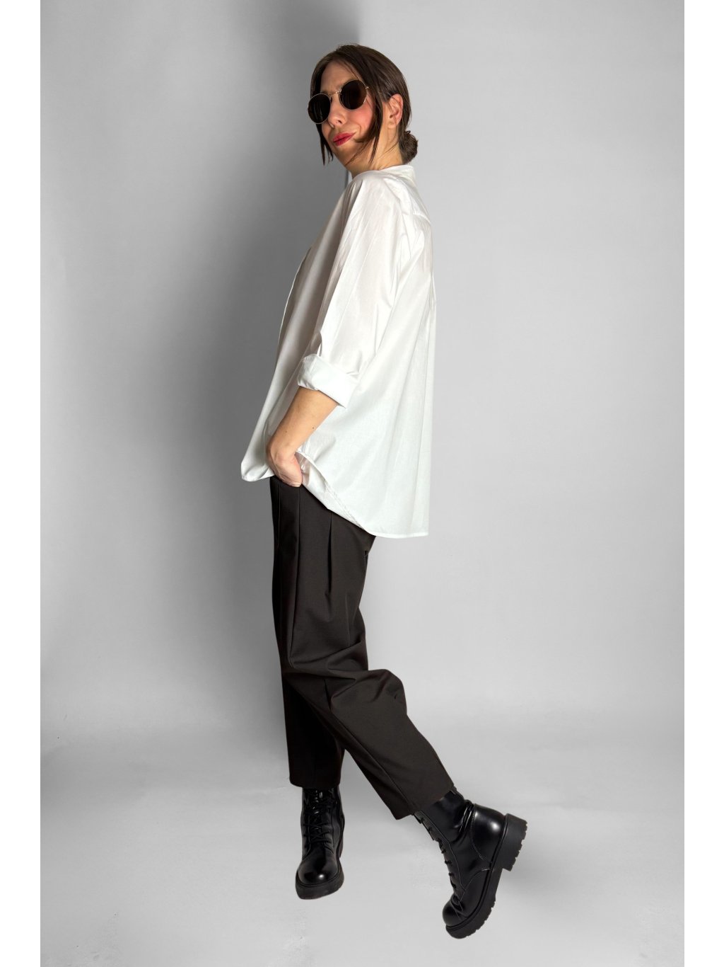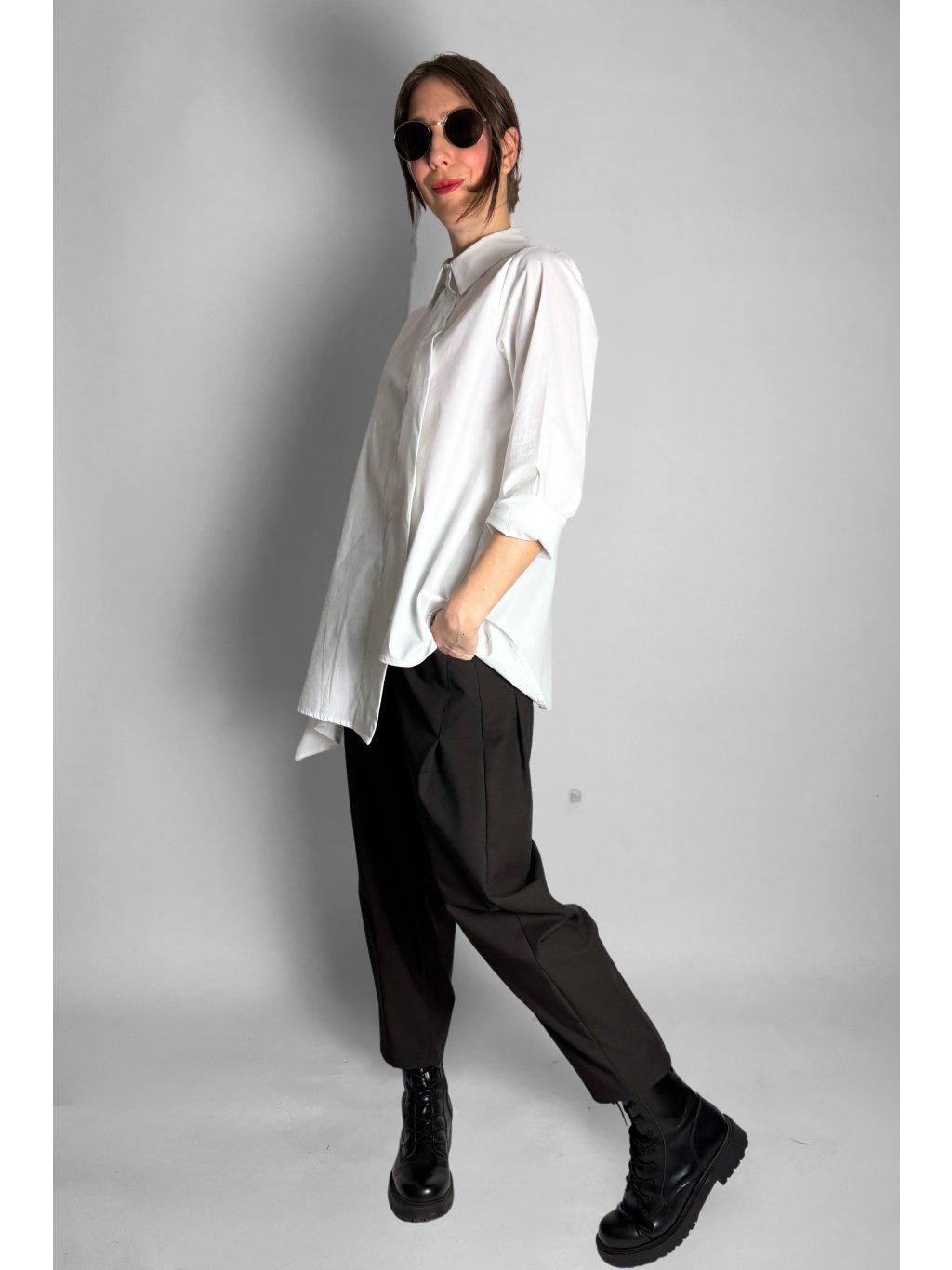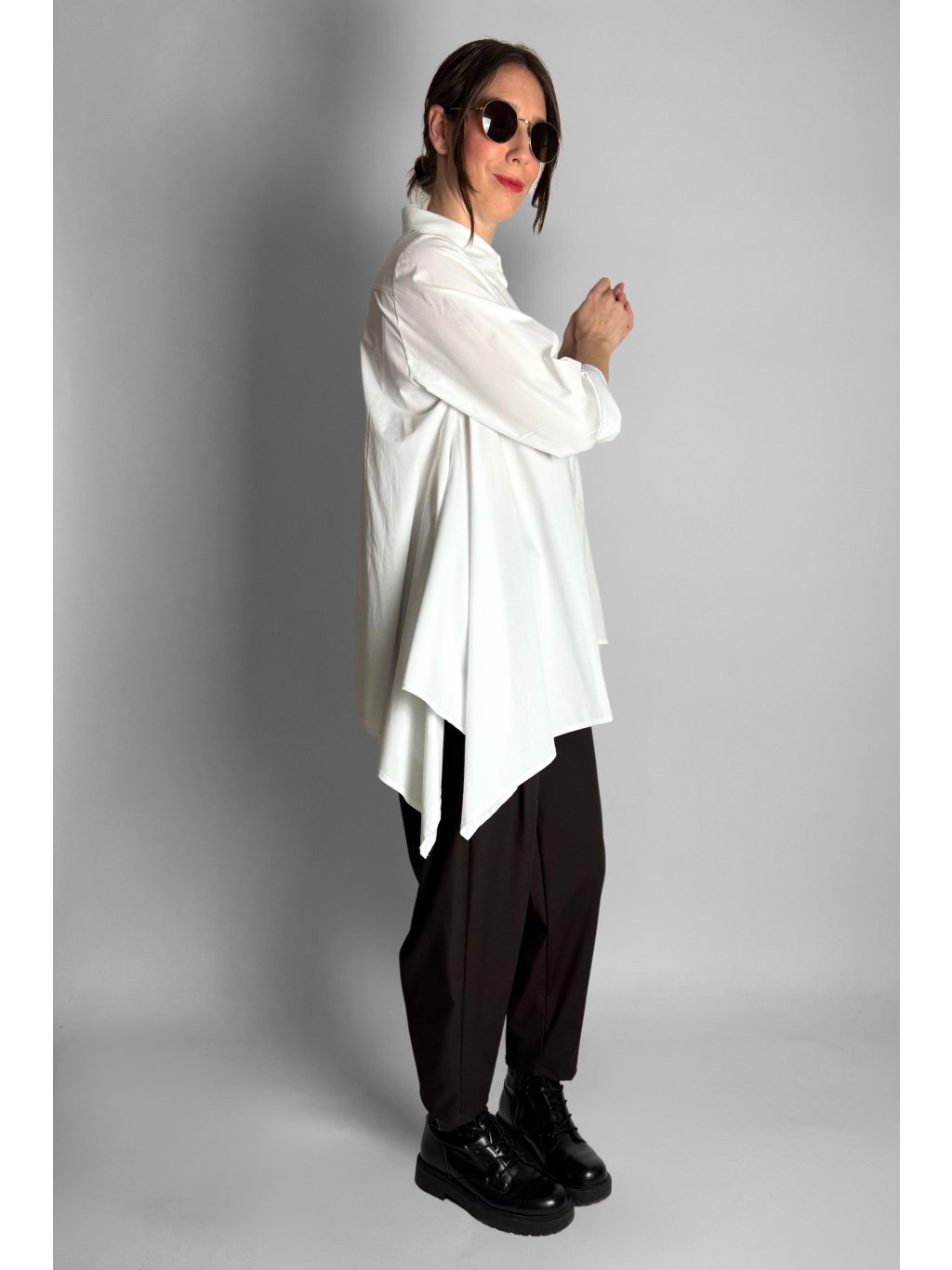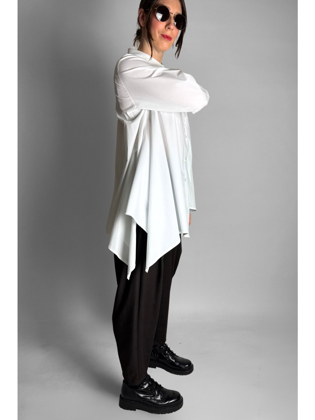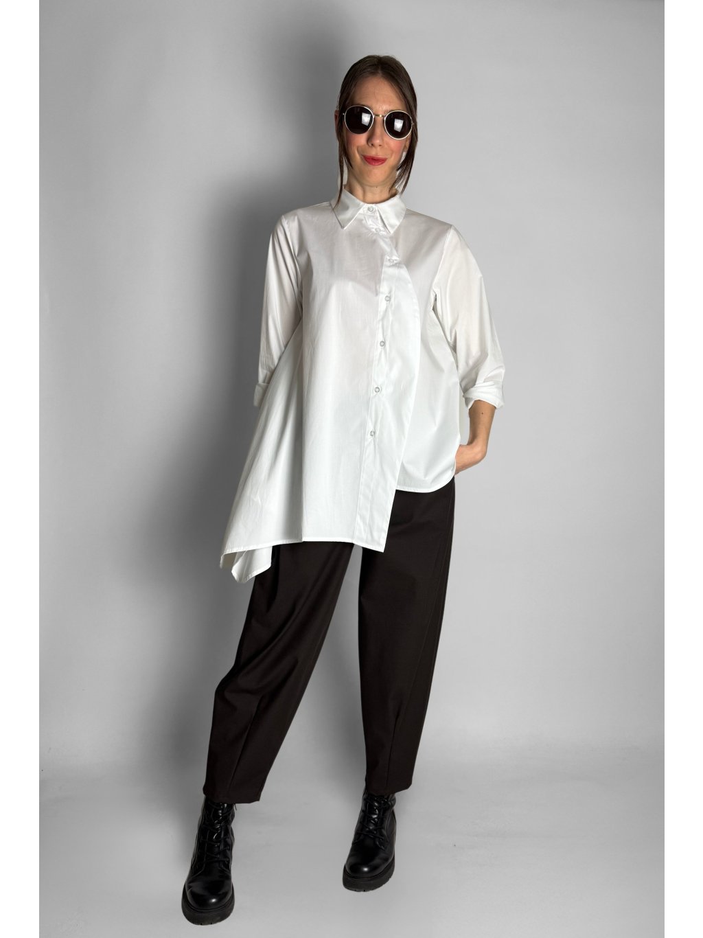 Elegantní asymetrická košile s klasickým límečkem a lehce šikmým zapínáním na knoflíky, které následně přechází rovně dolů. Linie zapínání působí jemně netradičně a podtrhuje moderní charakter modelu.