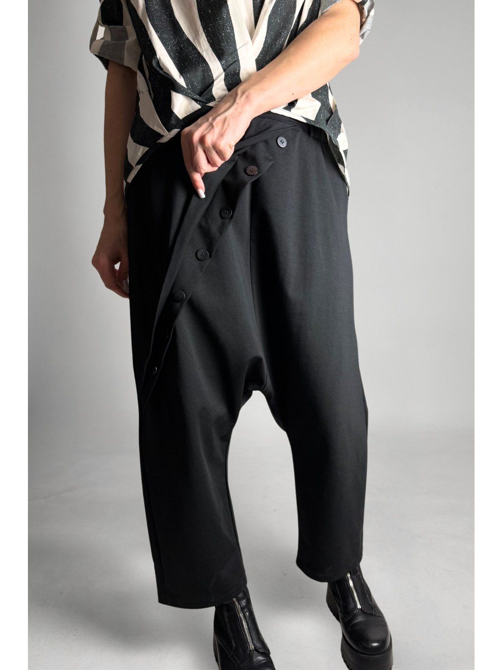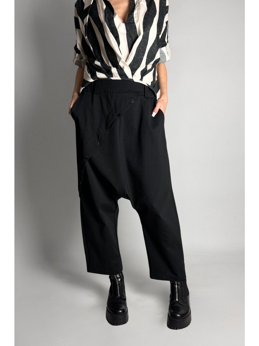 Pružné kalhoty s nízkým sedem a originálním šikmým předním lemem na knoflíky.
