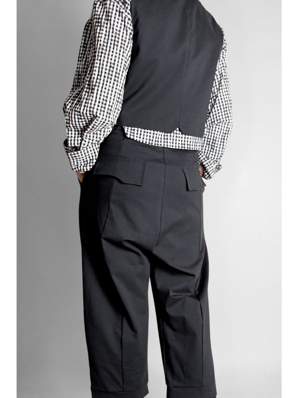 Díky tomu se kalhoty snadno přizpůsobí postavě, lze je obléct i přes širší boky a zapnout v užším pase. Nohavice jsou zakončené manžetou. Na bocích jsou dvě kapsy, vzadu imitace kapes.