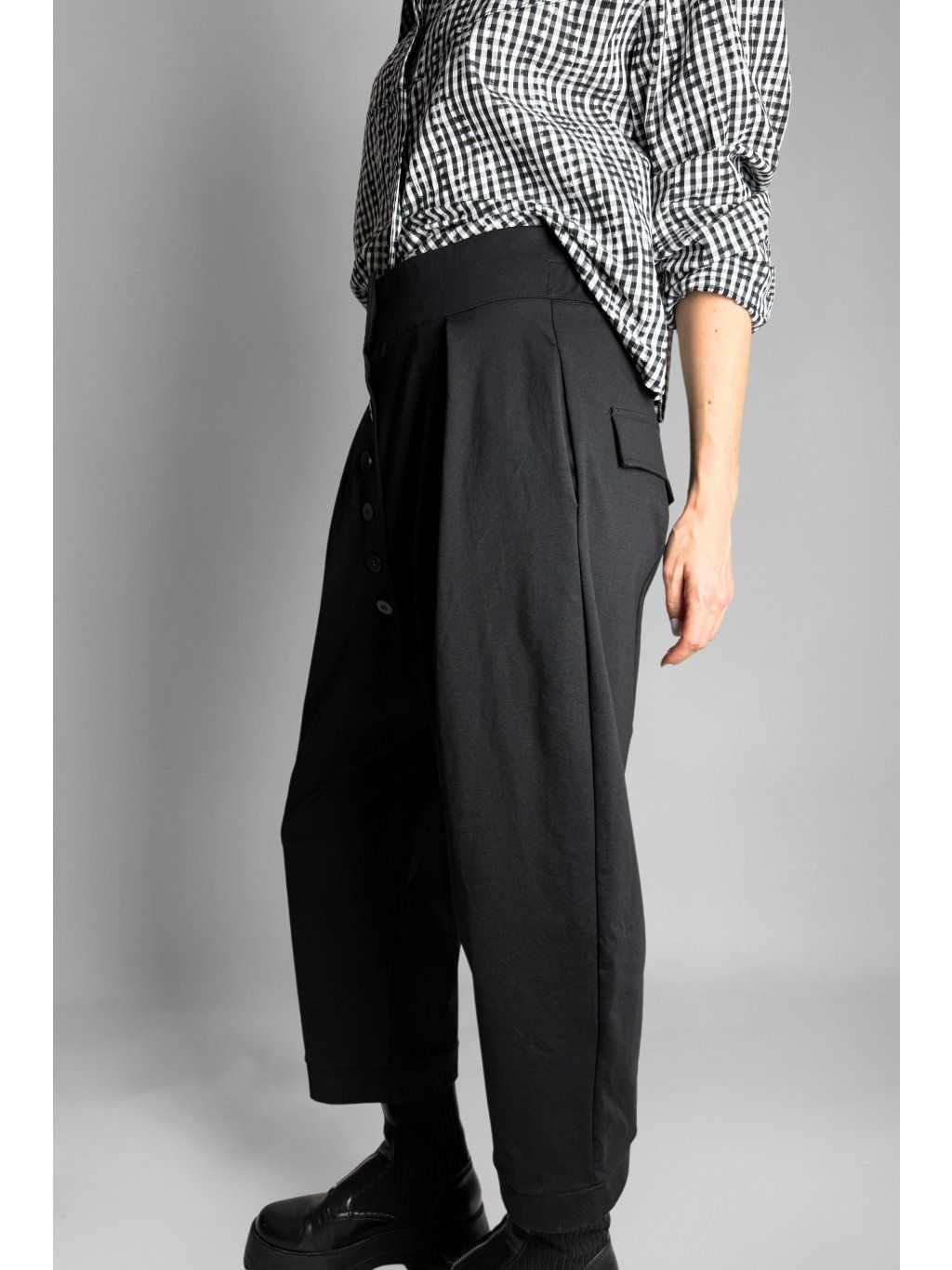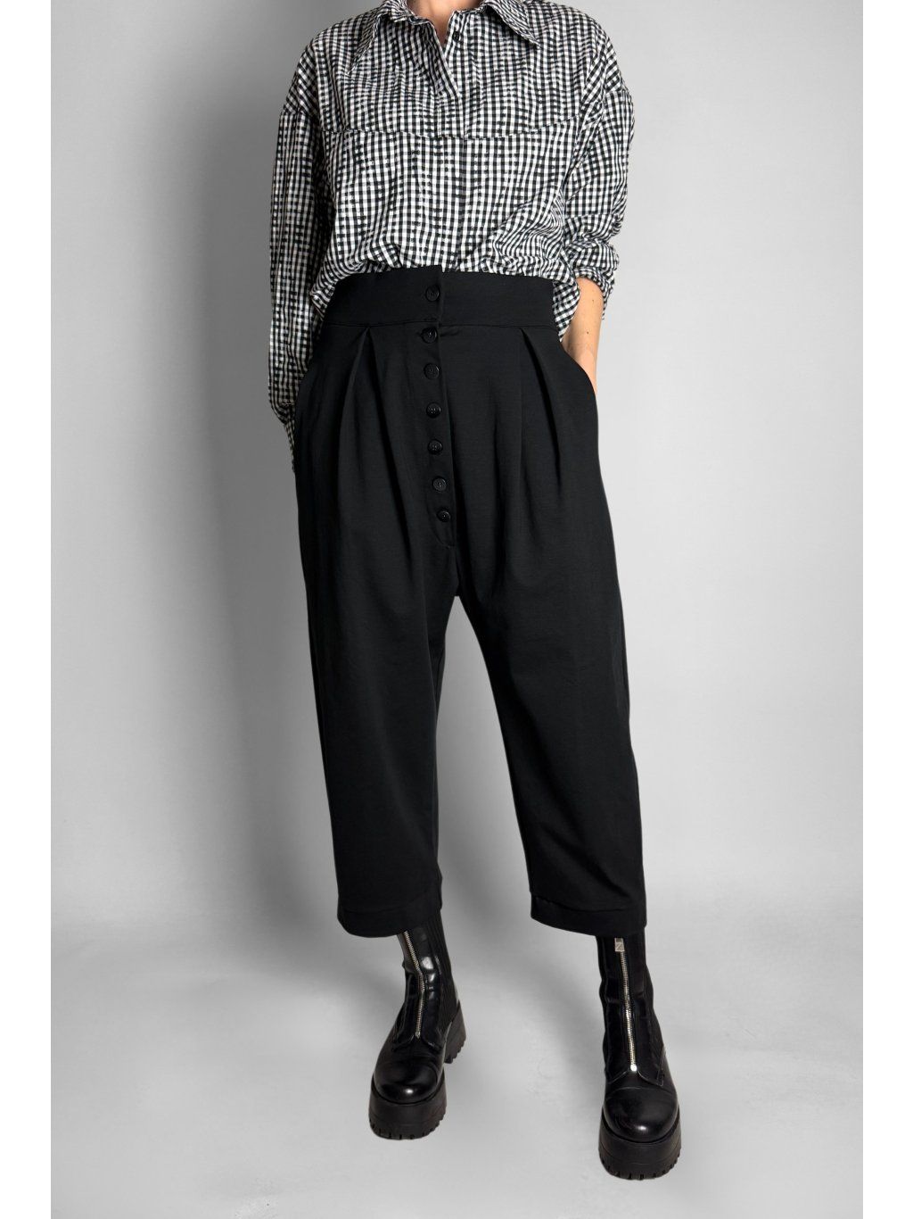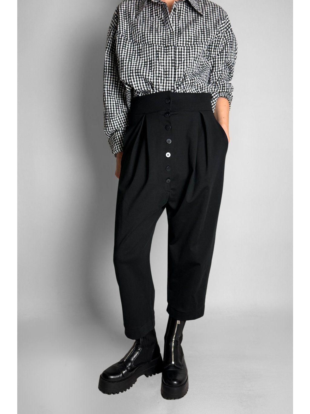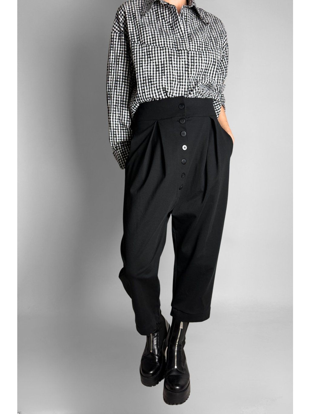 Stylové kalhoty s vysokým pasem a balónovým střihem, který se směrem dolů zužuje. V pase mají širokou gumu a zapínání na knoflíky po celé přední délce, které je plně funkční – lze je rozepnout až k sedu.