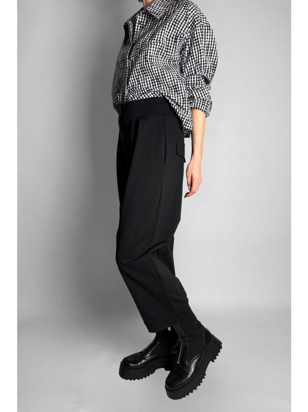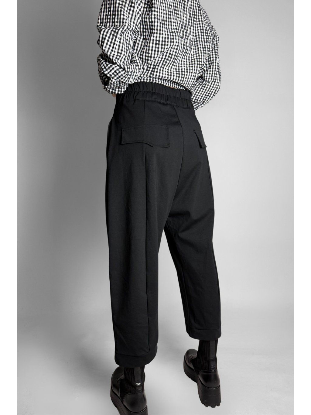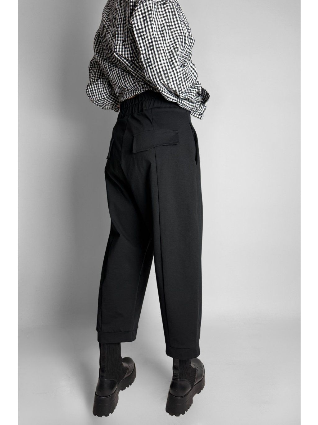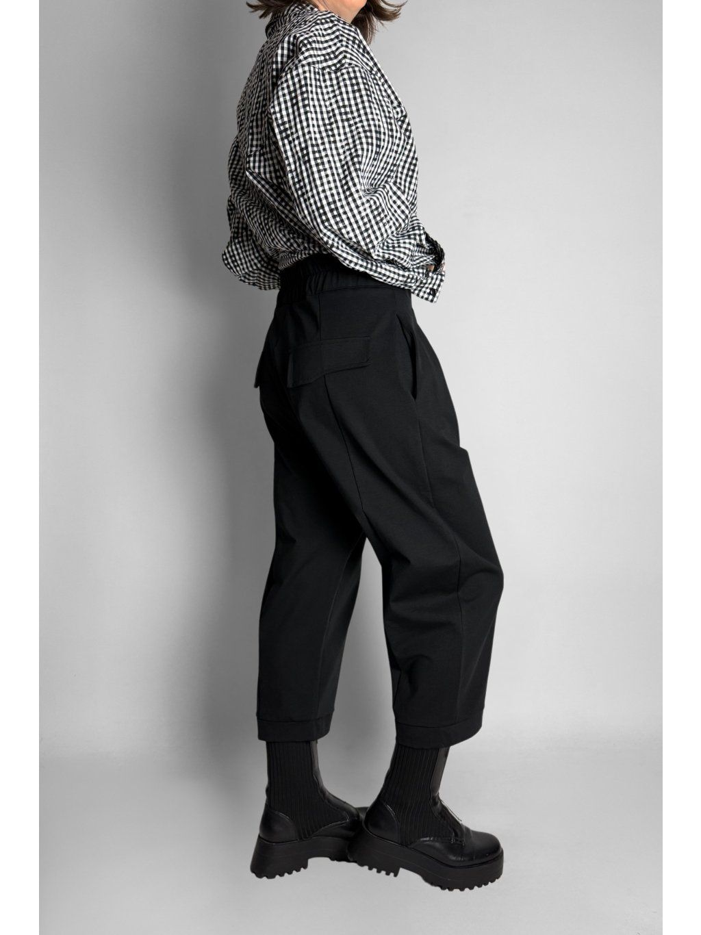 Stylové kalhoty s vysokým pasem a balónovým střihem, který se směrem dolů zužuje. V pase mají širokou gumu a zapínání na knoflíky po celé přední délce, které je plně funkční – lze je rozepnout až k sedu.