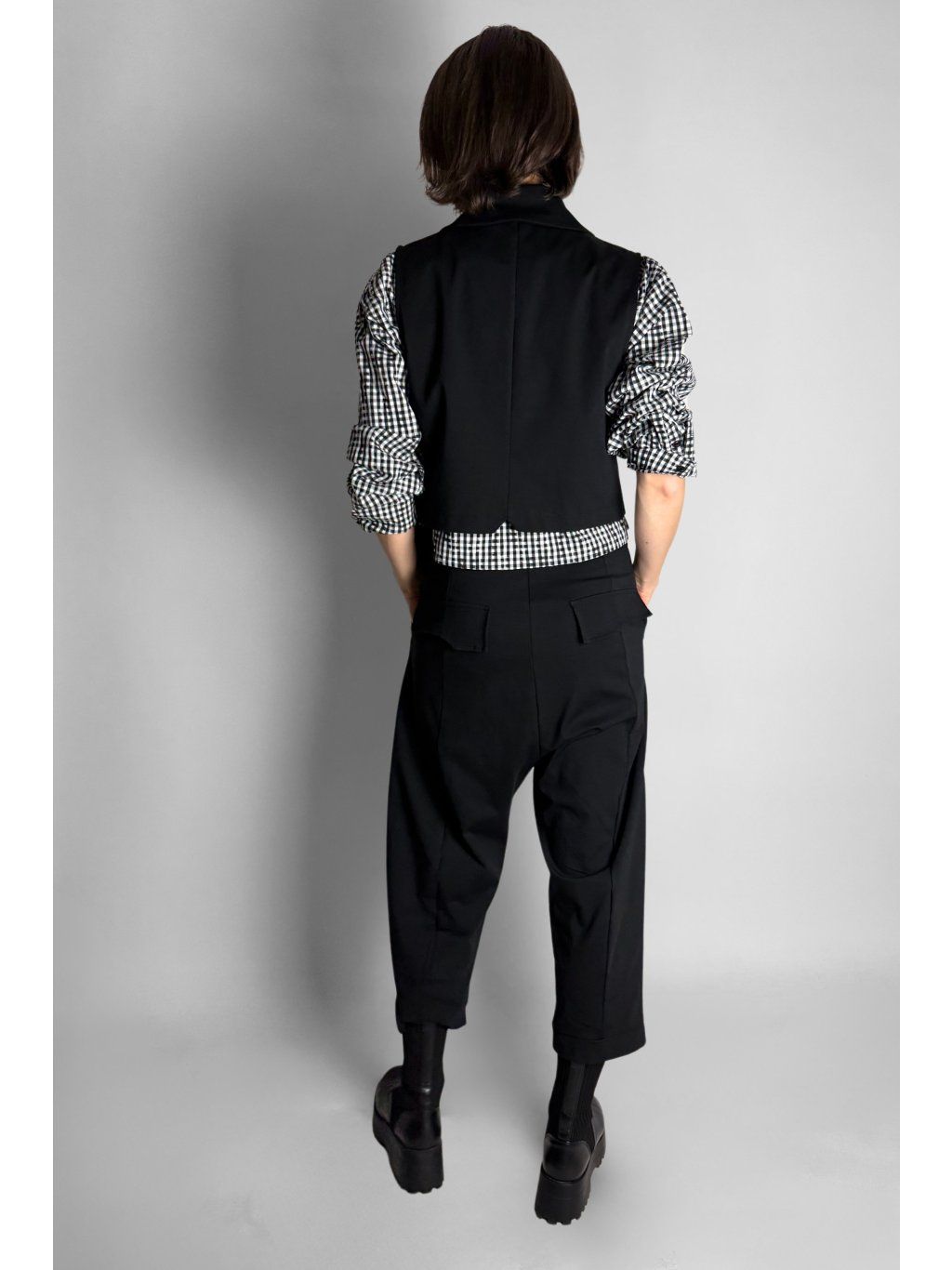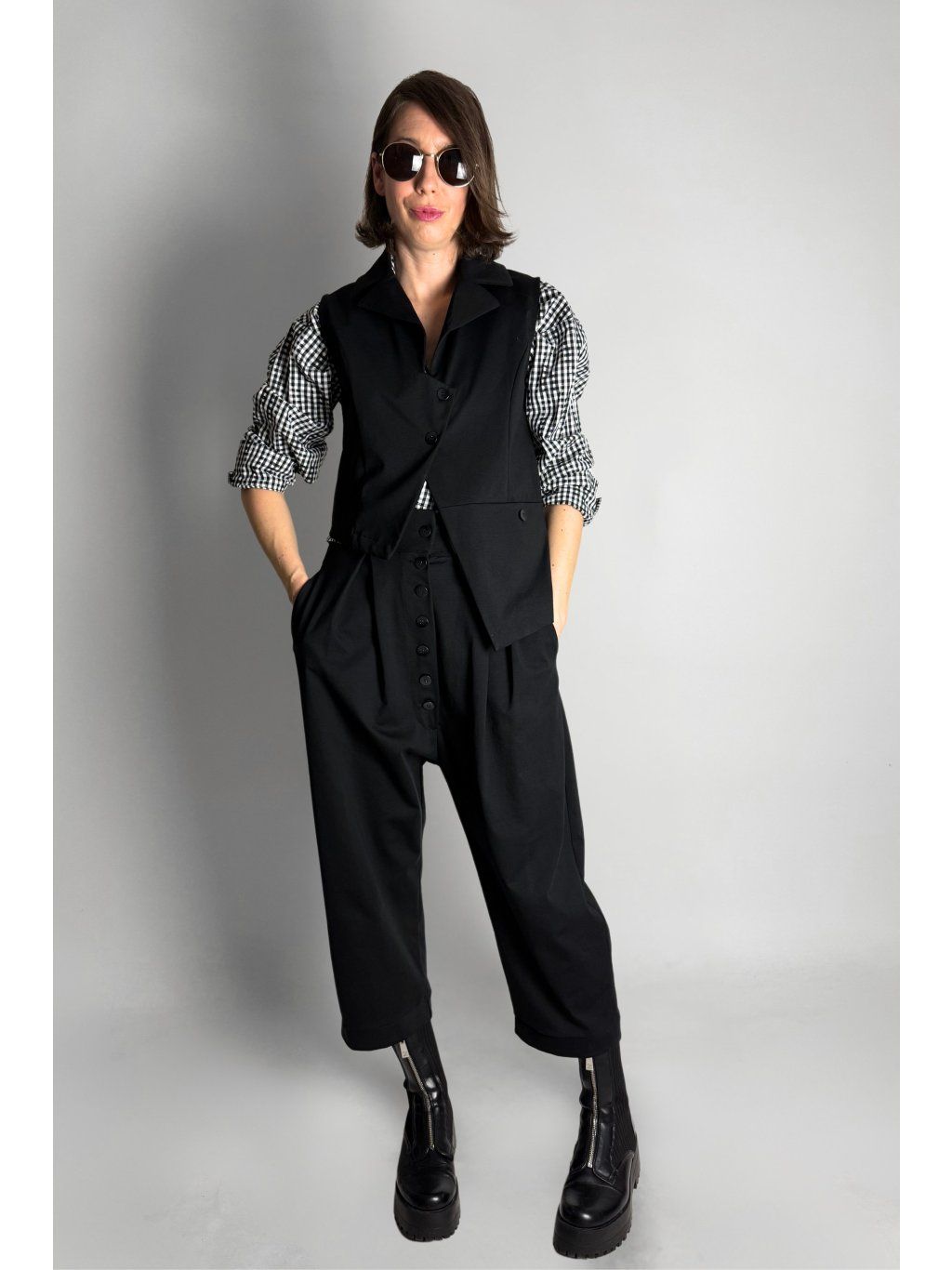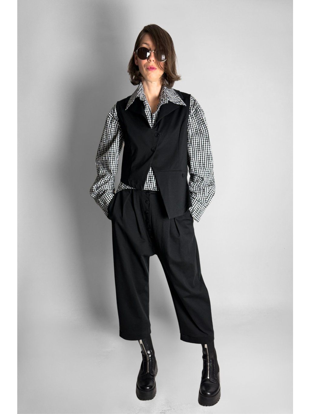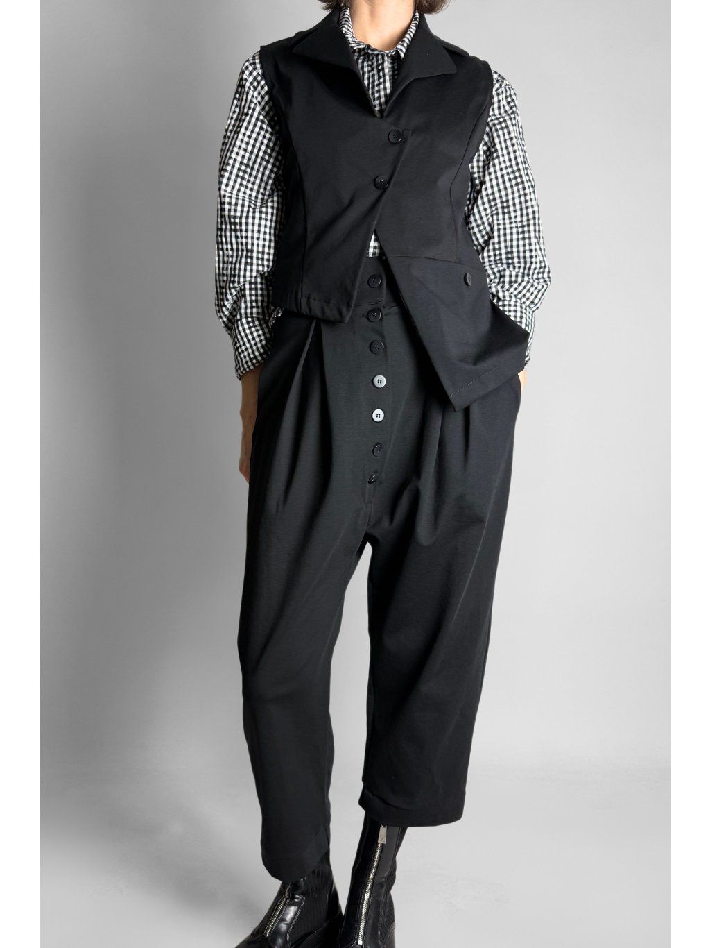 Stylové kalhoty s vysokým pasem a balónovým střihem, který se směrem dolů zužuje. V pase mají širokou gumu a zapínání na knoflíky po celé přední délce, které je plně funkční – lze je rozepnout až k sedu.
