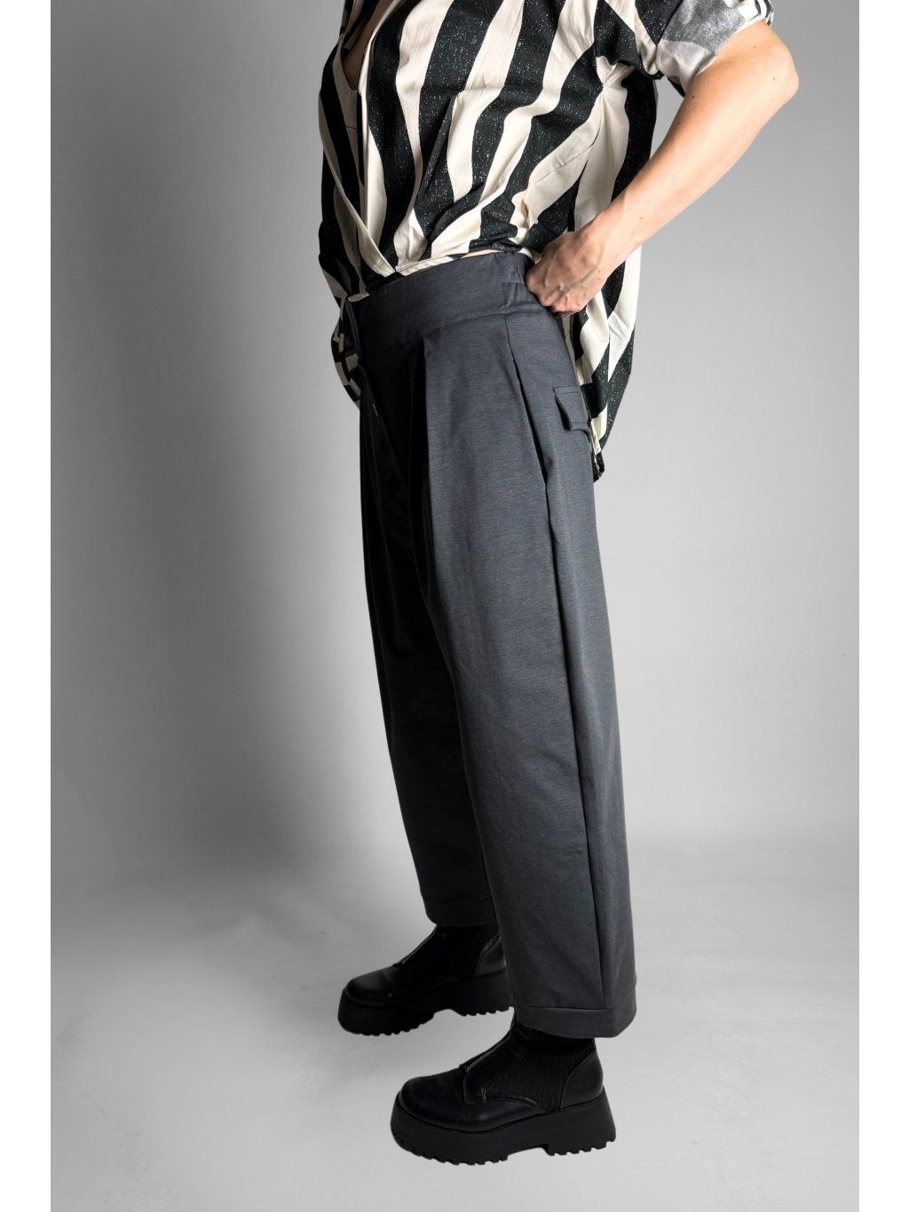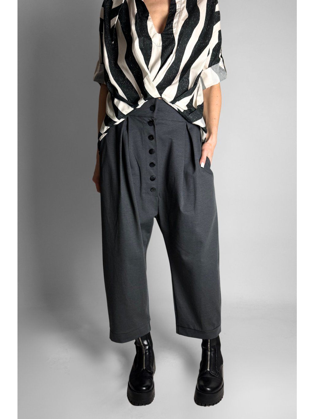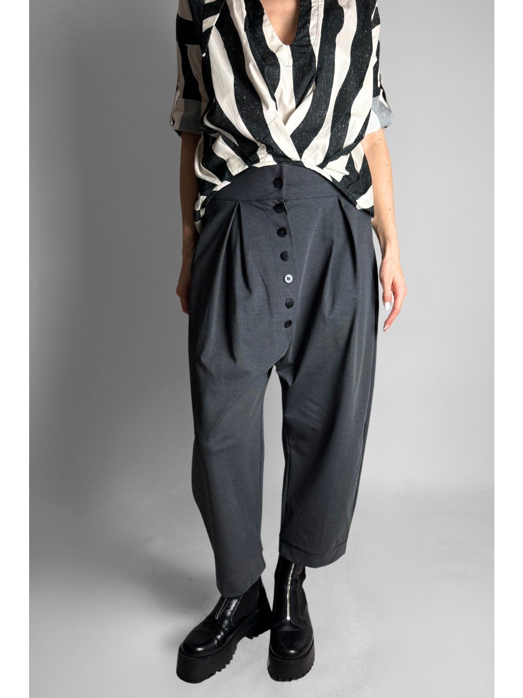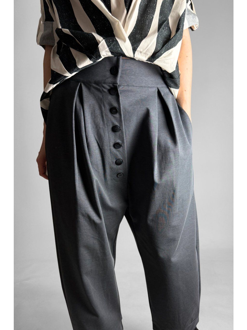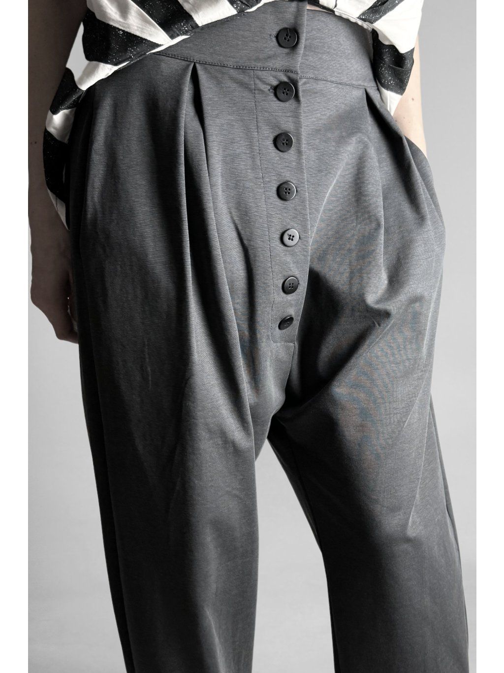 Stylové kalhoty s vysokým pasem a balónovým střihem, který se směrem dolů zužuje. V pase mají širokou gumu a zapínání na knoflíky po celé přední délce, které je plně funkční – lze je rozepnout až k sedu.