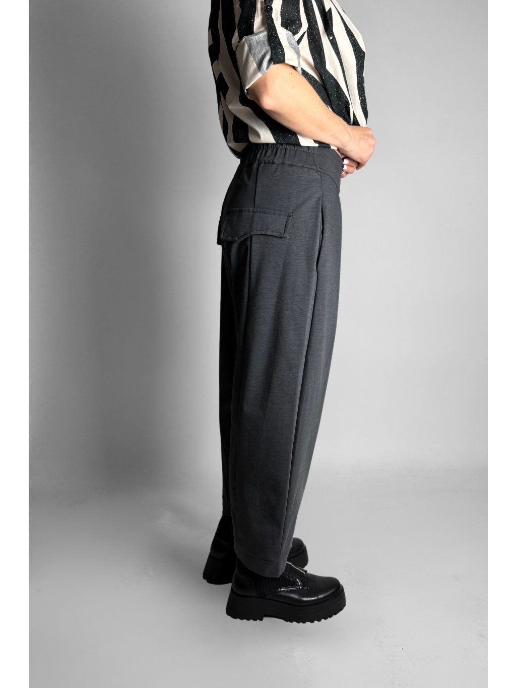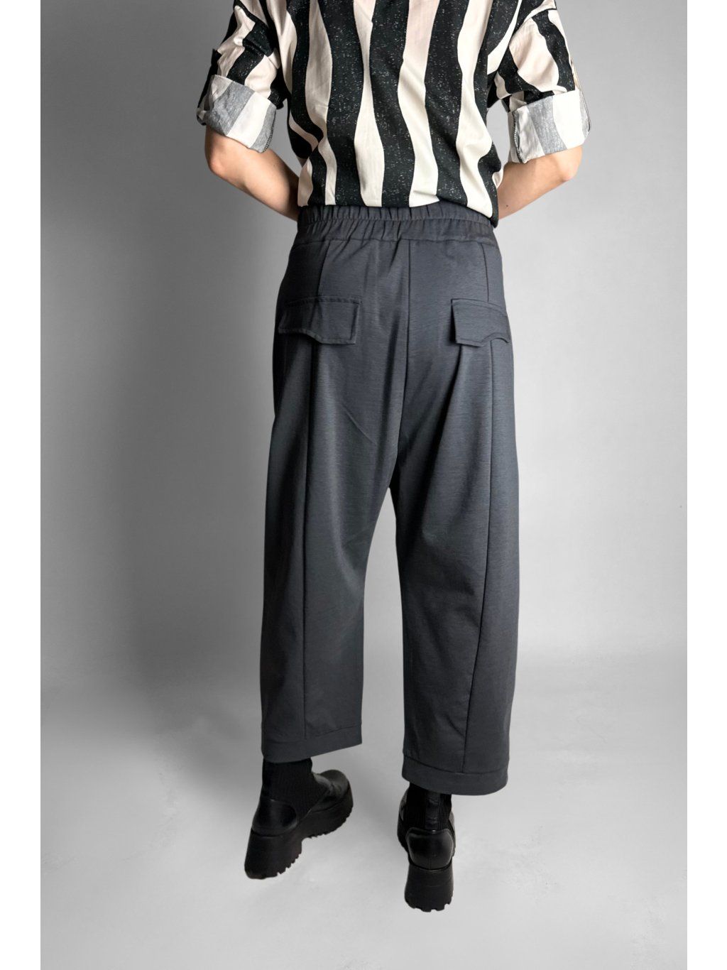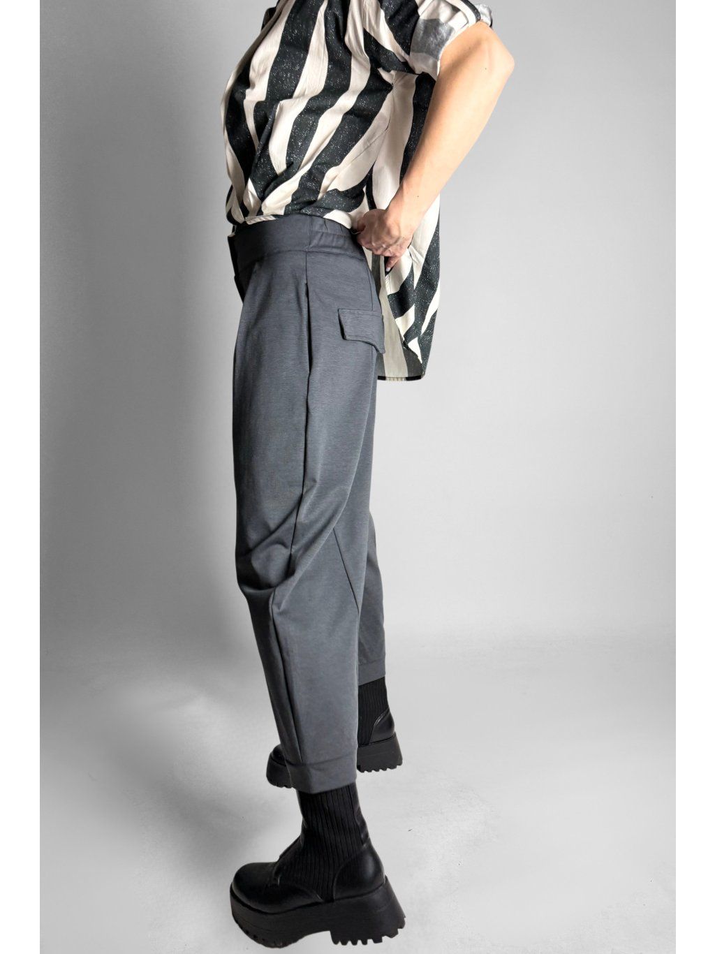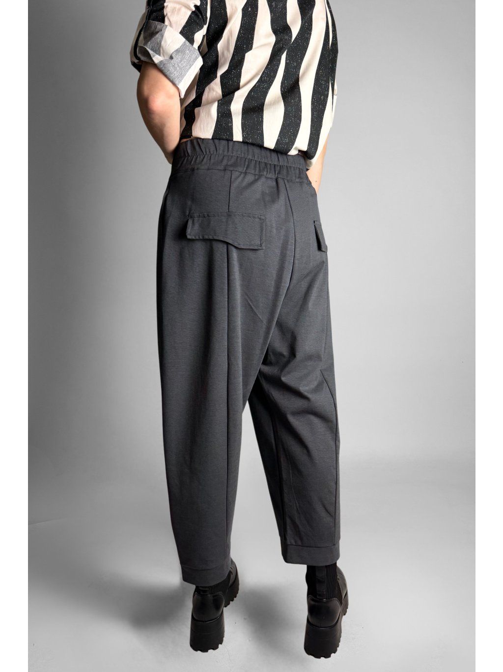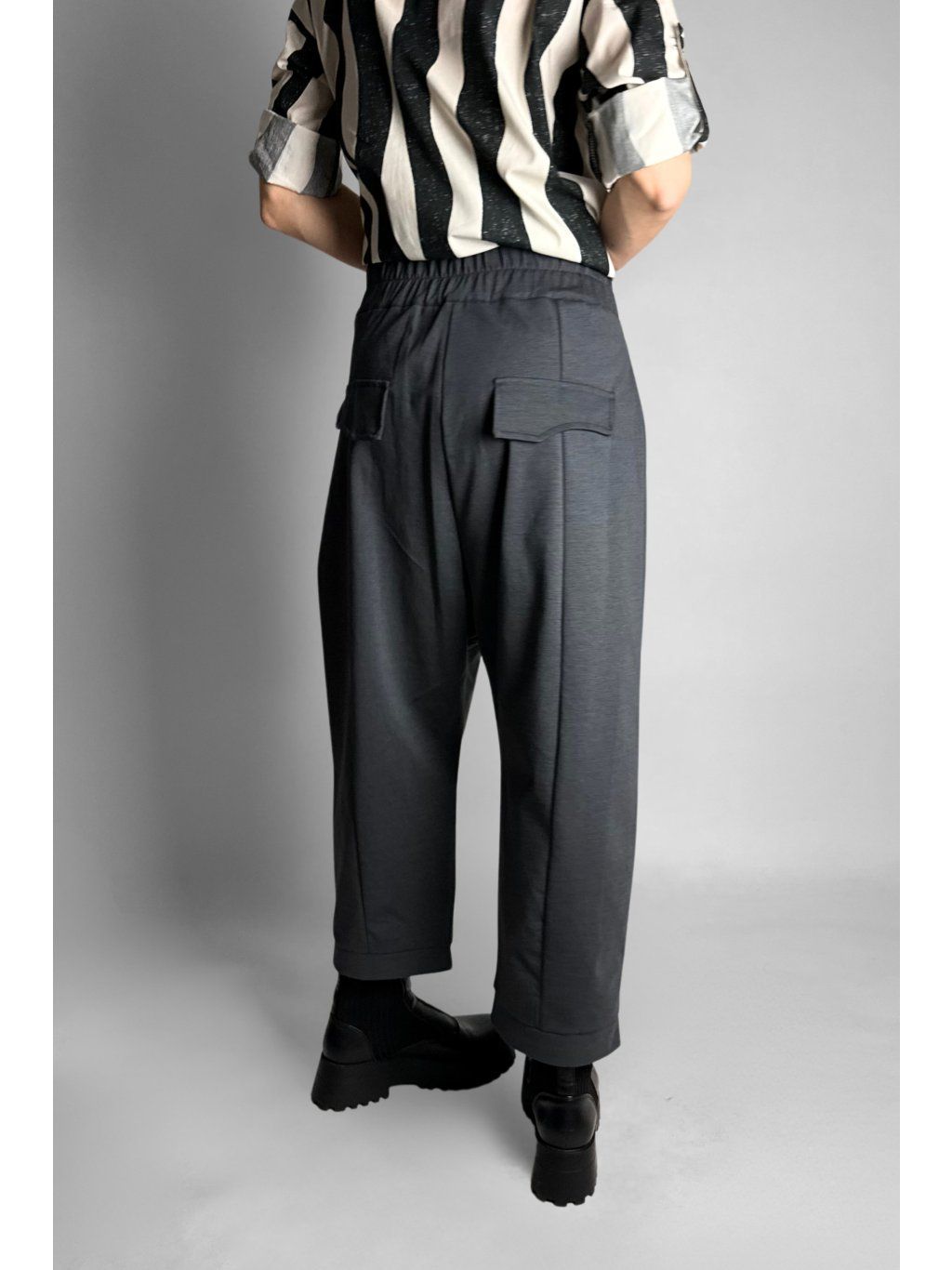 Stylové kalhoty s vysokým pasem a balónovým střihem, který se směrem dolů zužuje. V pase mají širokou gumu a zapínání na knoflíky po celé přední délce, které je plně funkční – lze je rozepnout až k sedu.