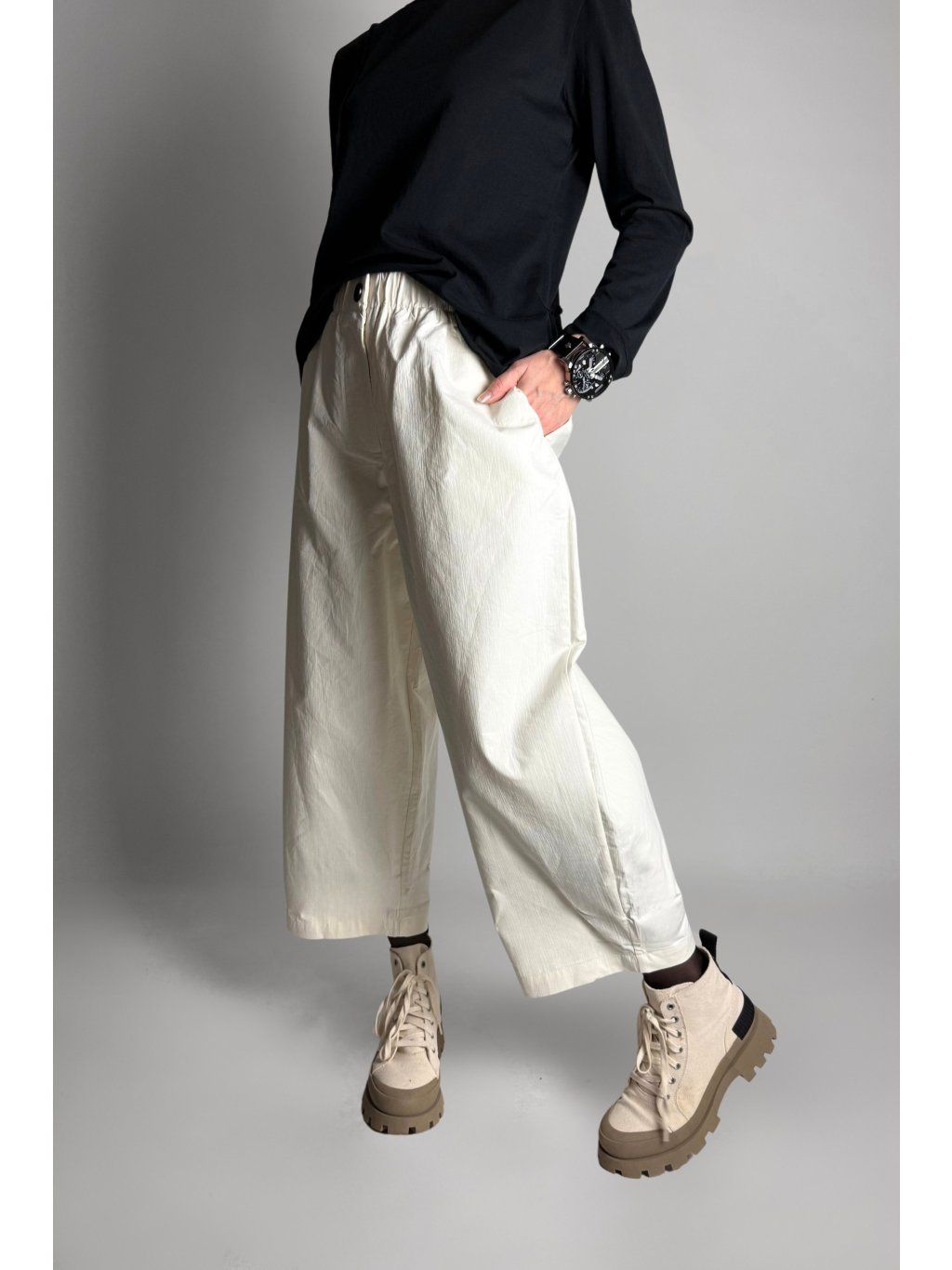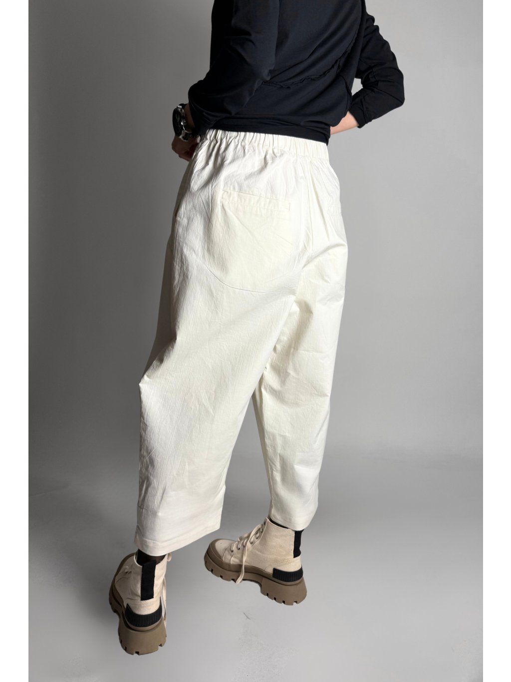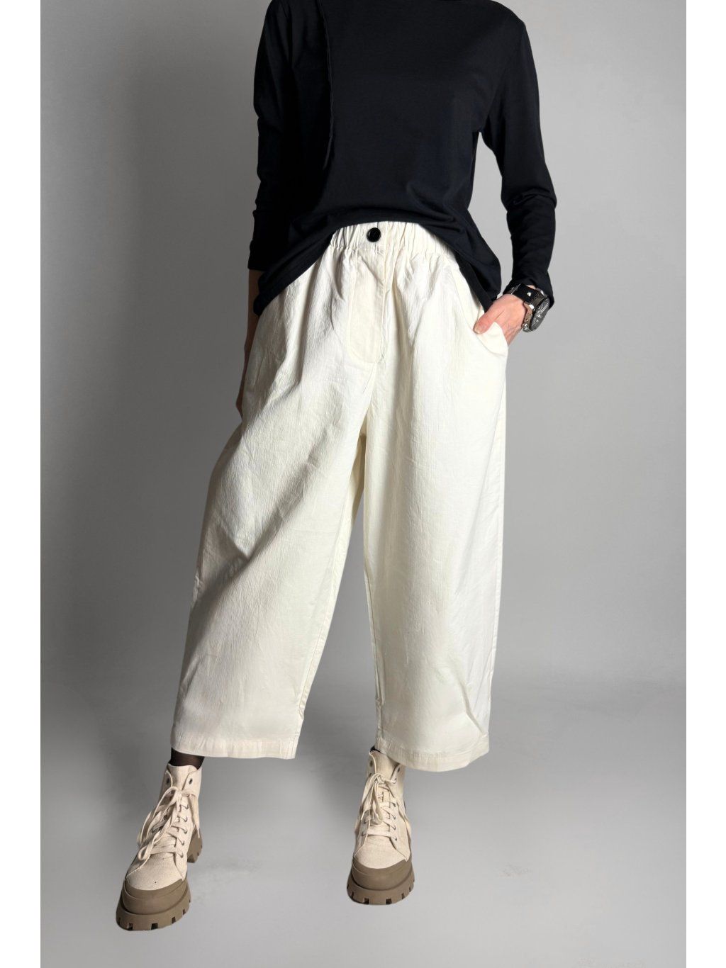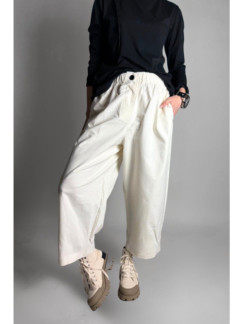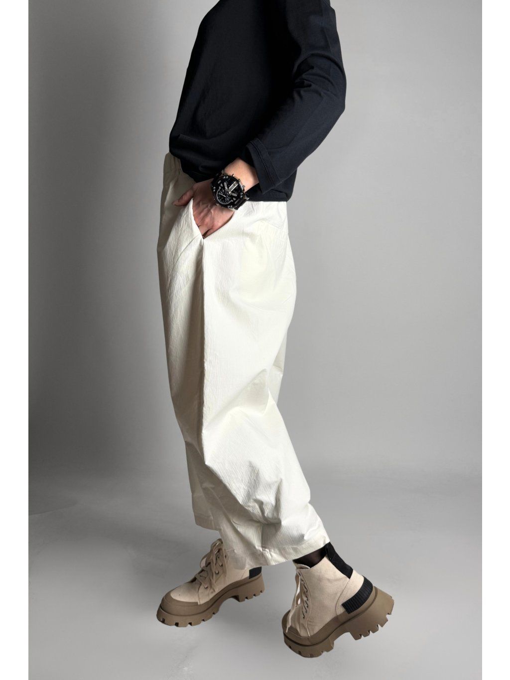 Kalhoty jsou vybaveny elastickým pasem se zapínáním na knoflík a zip, díky čemuž se dobře přizpůsobí postavě. Nechybí klasické kapsy. Široké