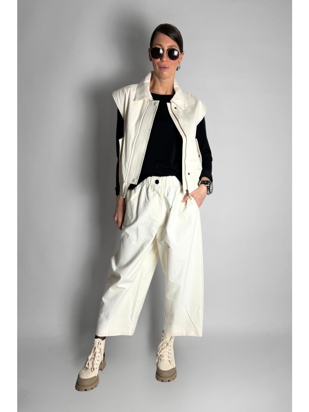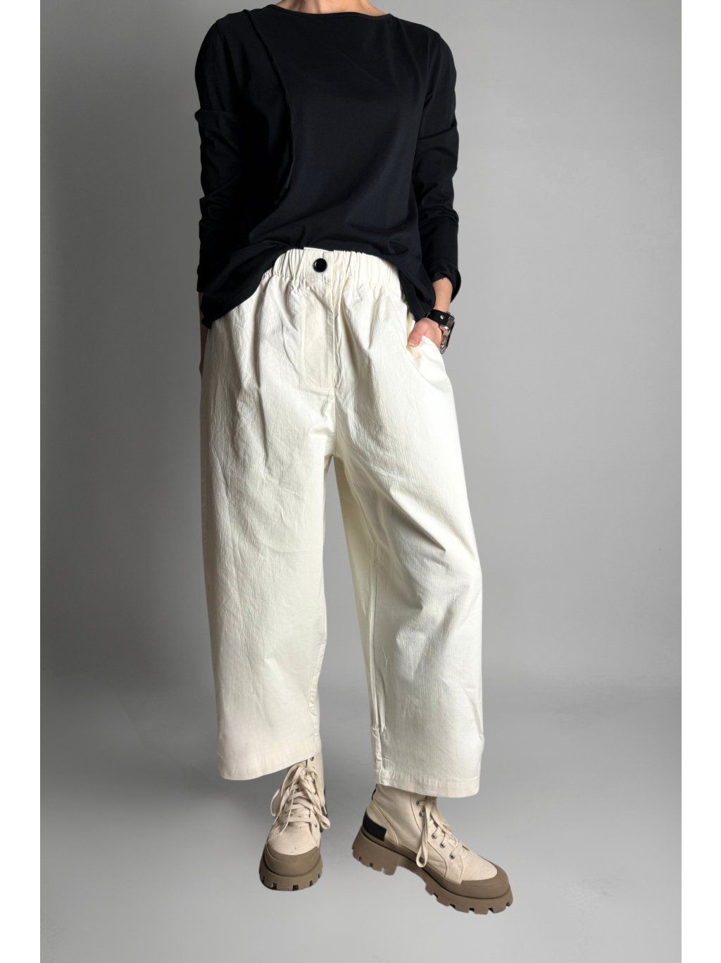 Kalhoty jsou vybaveny elastickým pasem se zapínáním na knoflík a zip, díky čemuž se dobře přizpůsobí postavě. Nechybí klasické kapsy. Široké