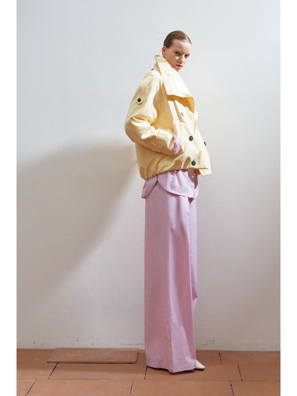 Vpředu vzhledově působí jako dvouřadé zapínání, skutečné zapínání je jednořadé na knoflíky