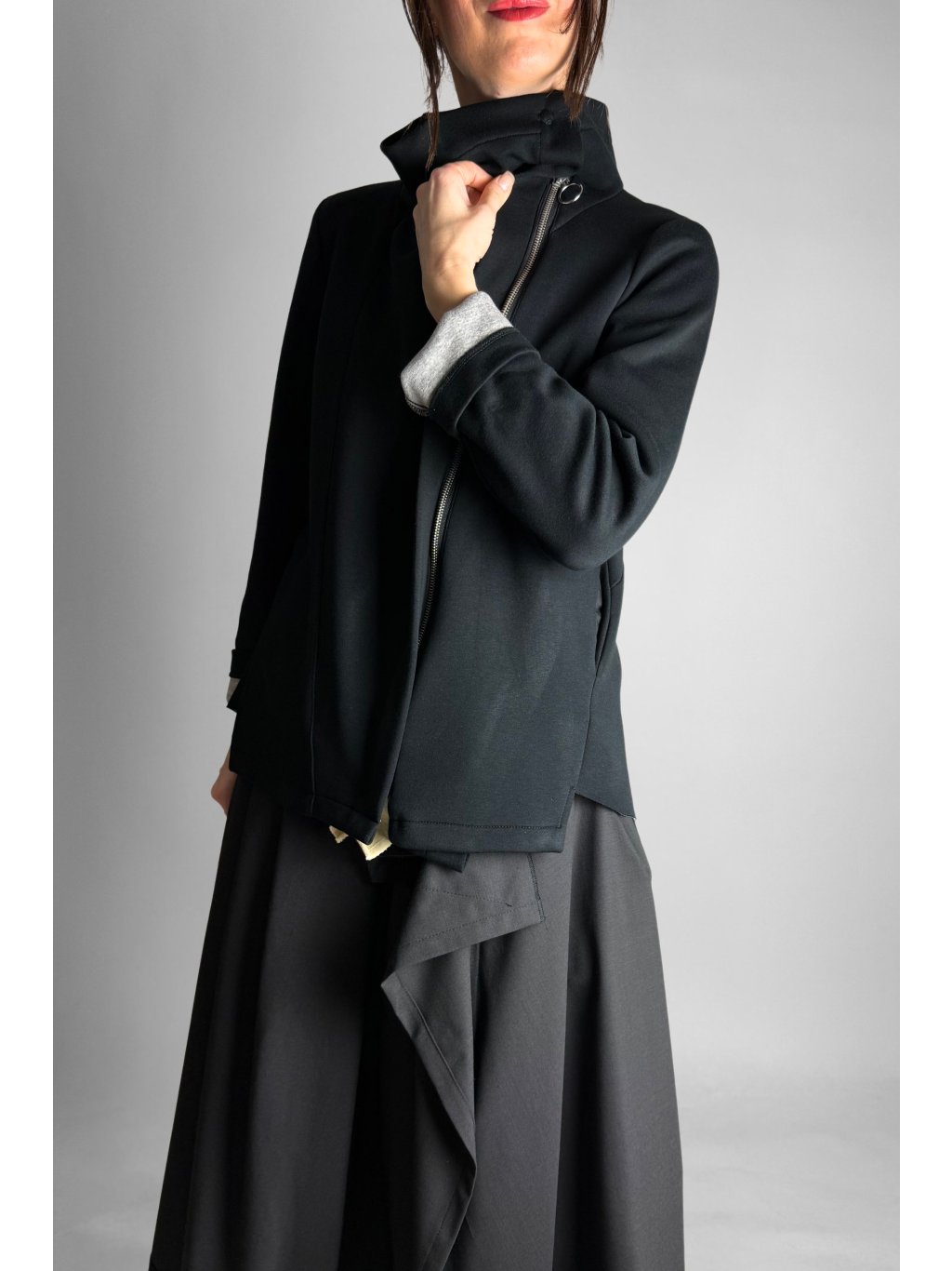 Bunda s šikmým kovovým zipem a vysokým stojáčkem s cvokem. Materiál je kvalitní a příjemný na nošení, lehce elastický, vhodný pro vrstvení i každodenní styl.