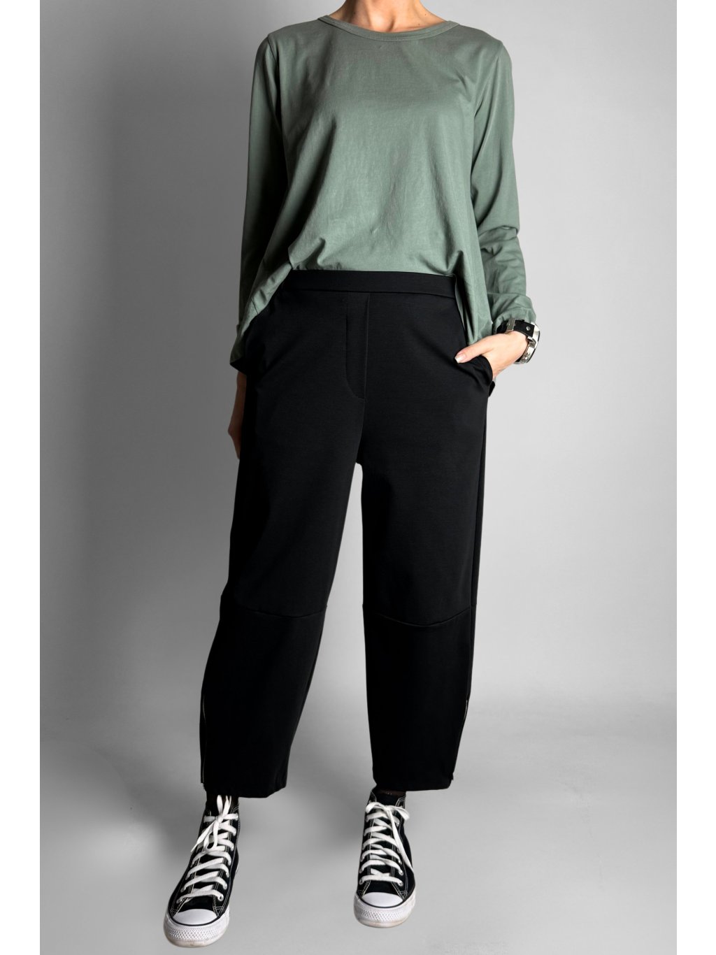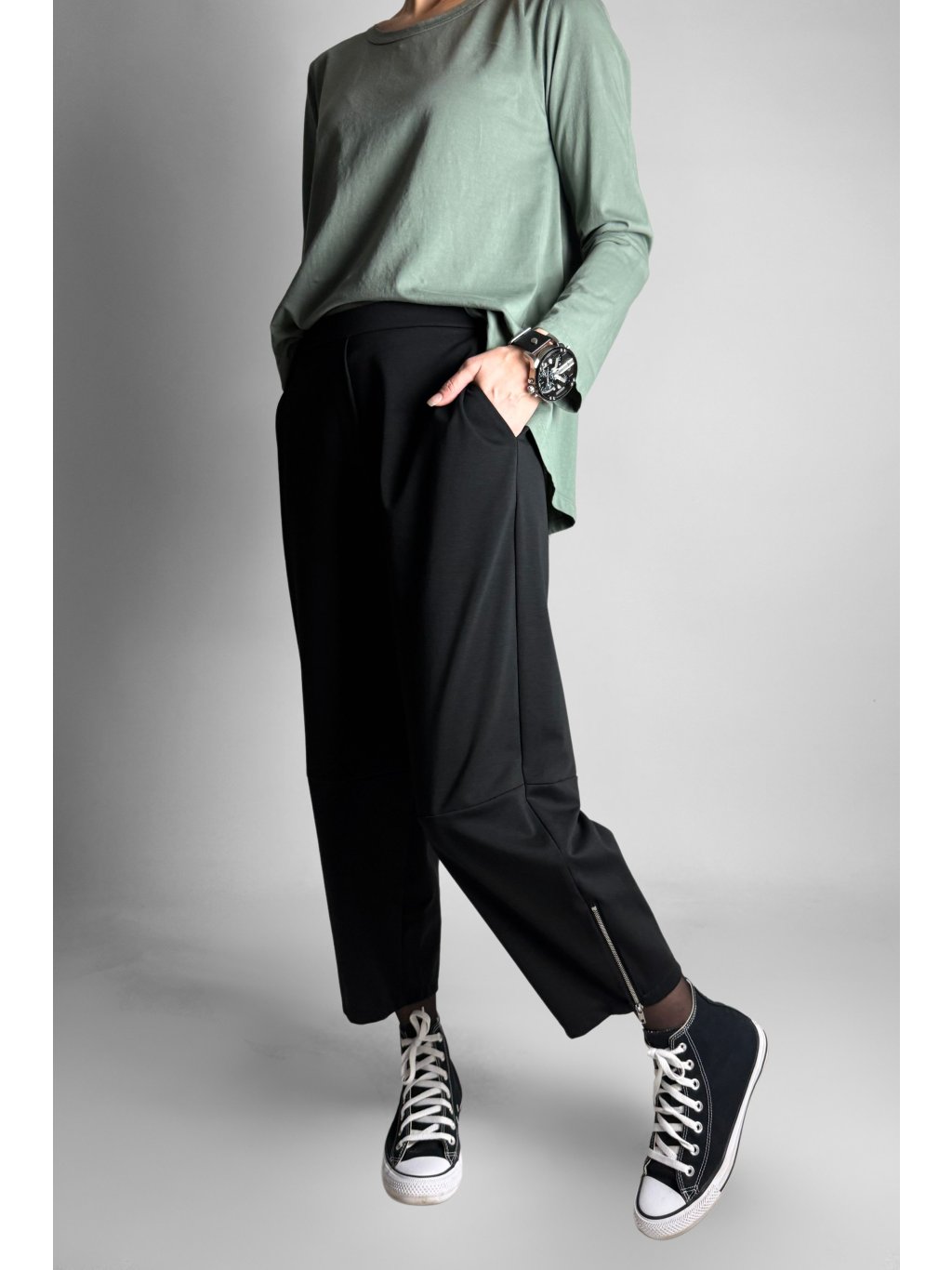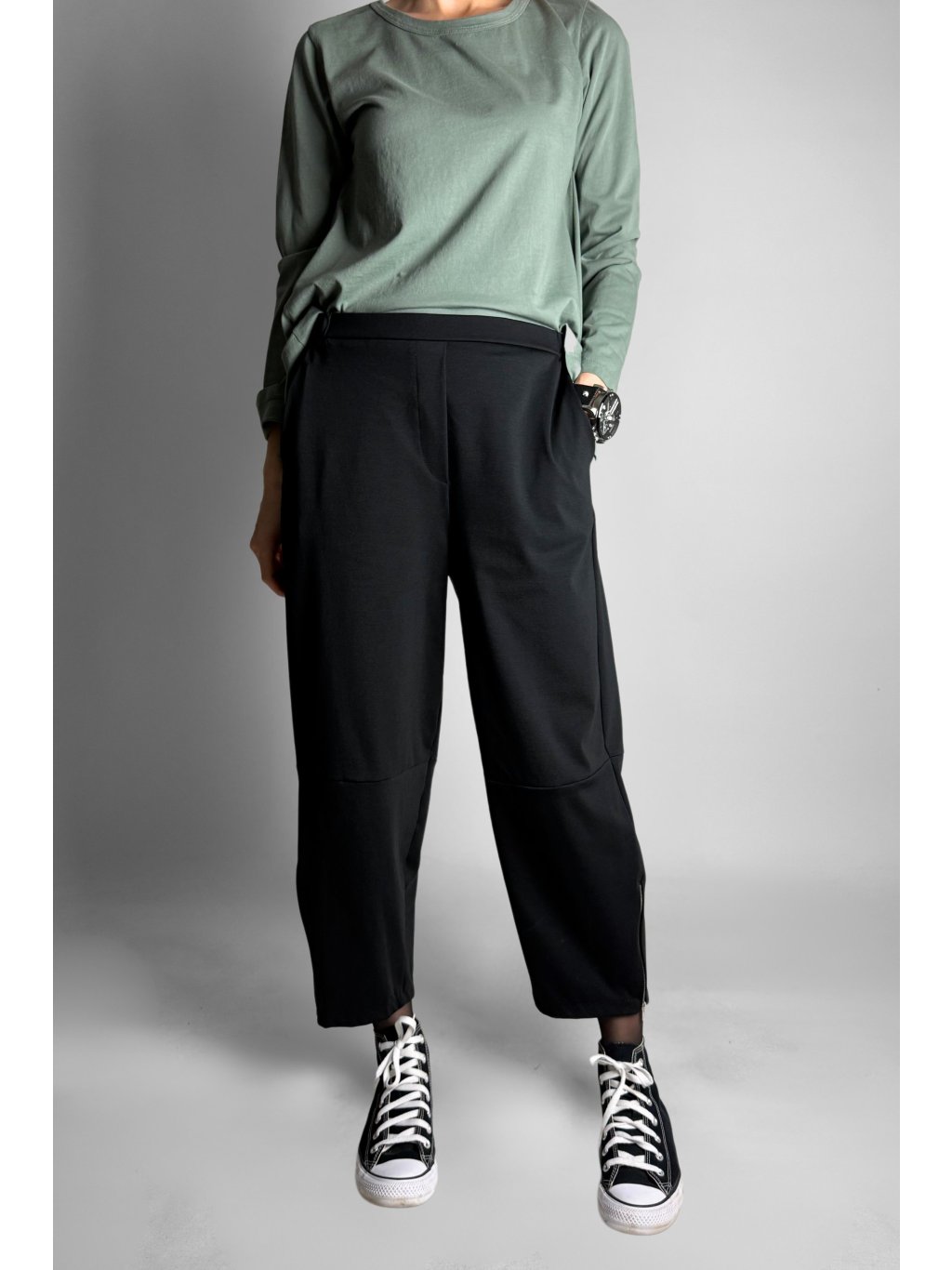 Jednoduché a pohodlné tříčtvrteční kalhoty typu capri s elastickým pasem. Model má čistý minimalistický design, který je doplněn kovovým zipem na vnější straně nohavic.