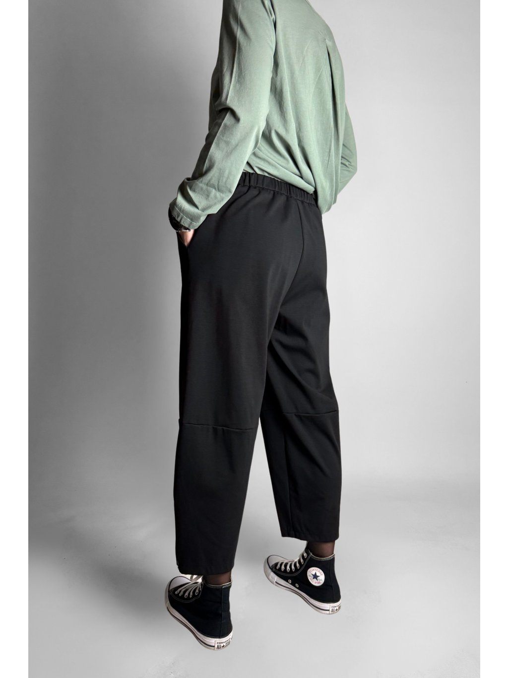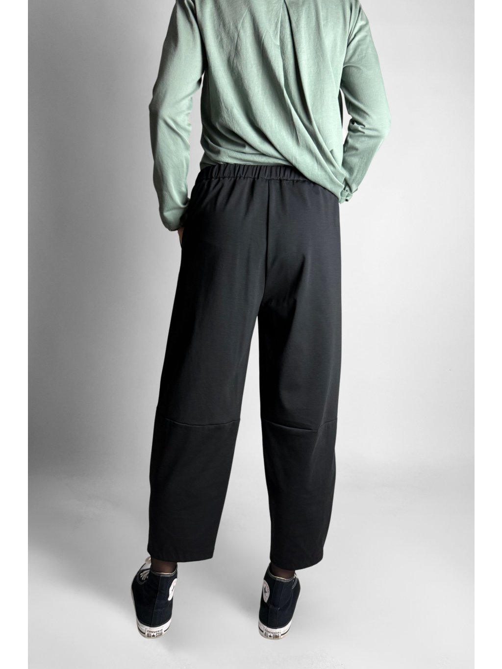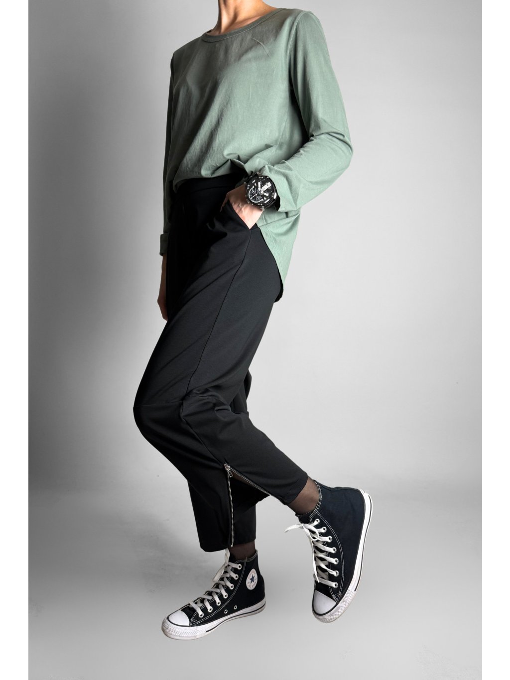 Jednoduché a pohodlné tříčtvrteční kalhoty typu capri s elastickým pasem. Model má čistý minimalistický design, který je doplněn kovovým zipem na vnější straně nohavic.