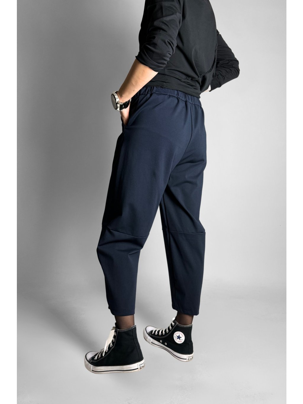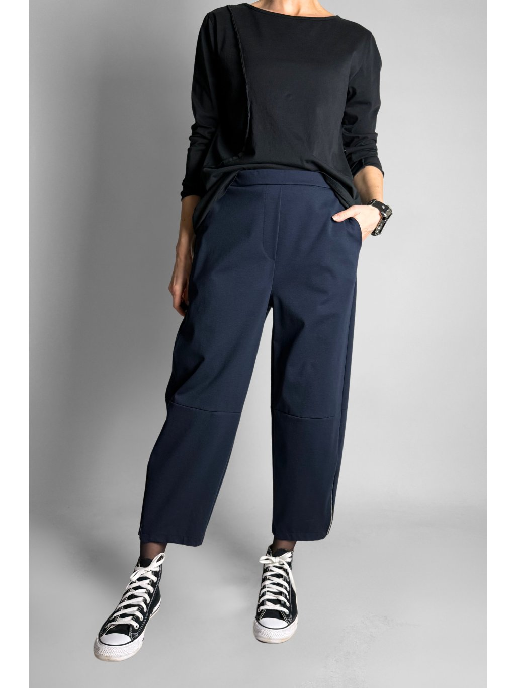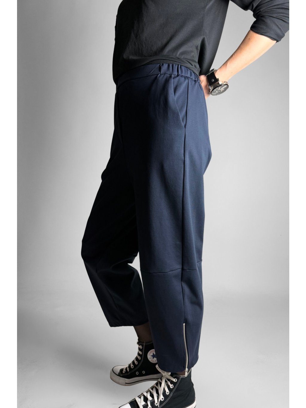 Jednoduché a pohodlné tříčtvrteční kalhoty typu capri s elastickým pasem. Model má čistý minimalistický design, který je doplněn kovovým zipem na vnější straně nohavic.