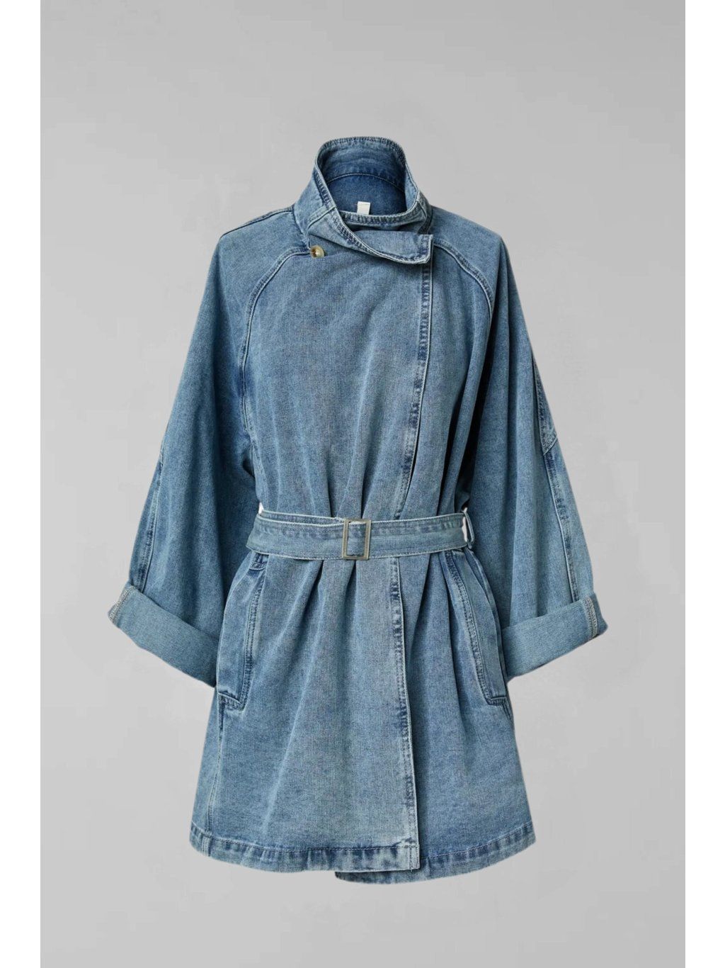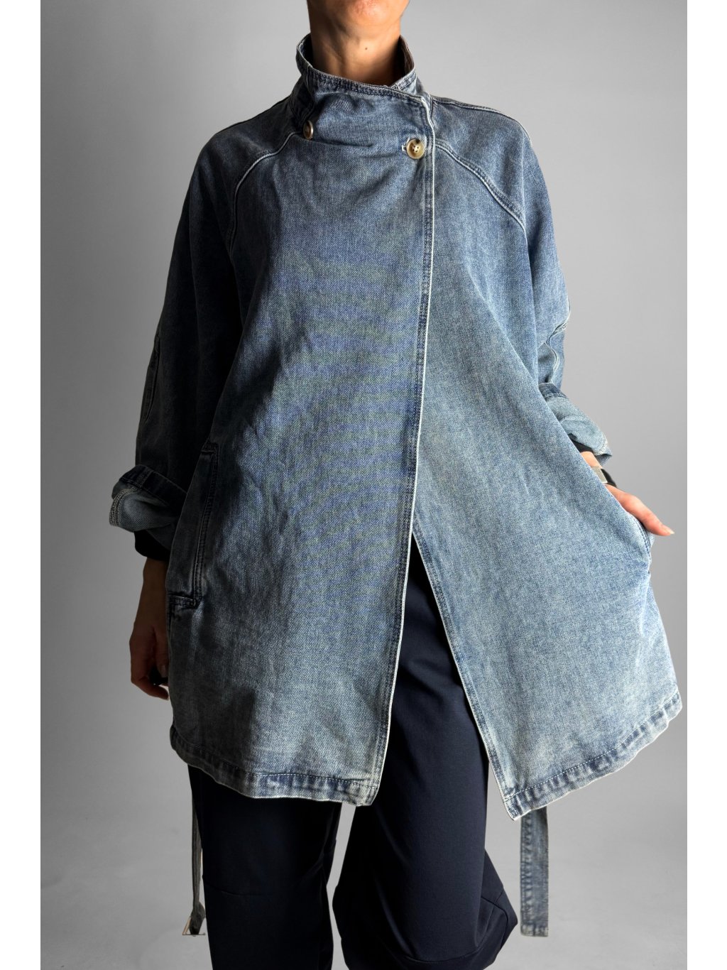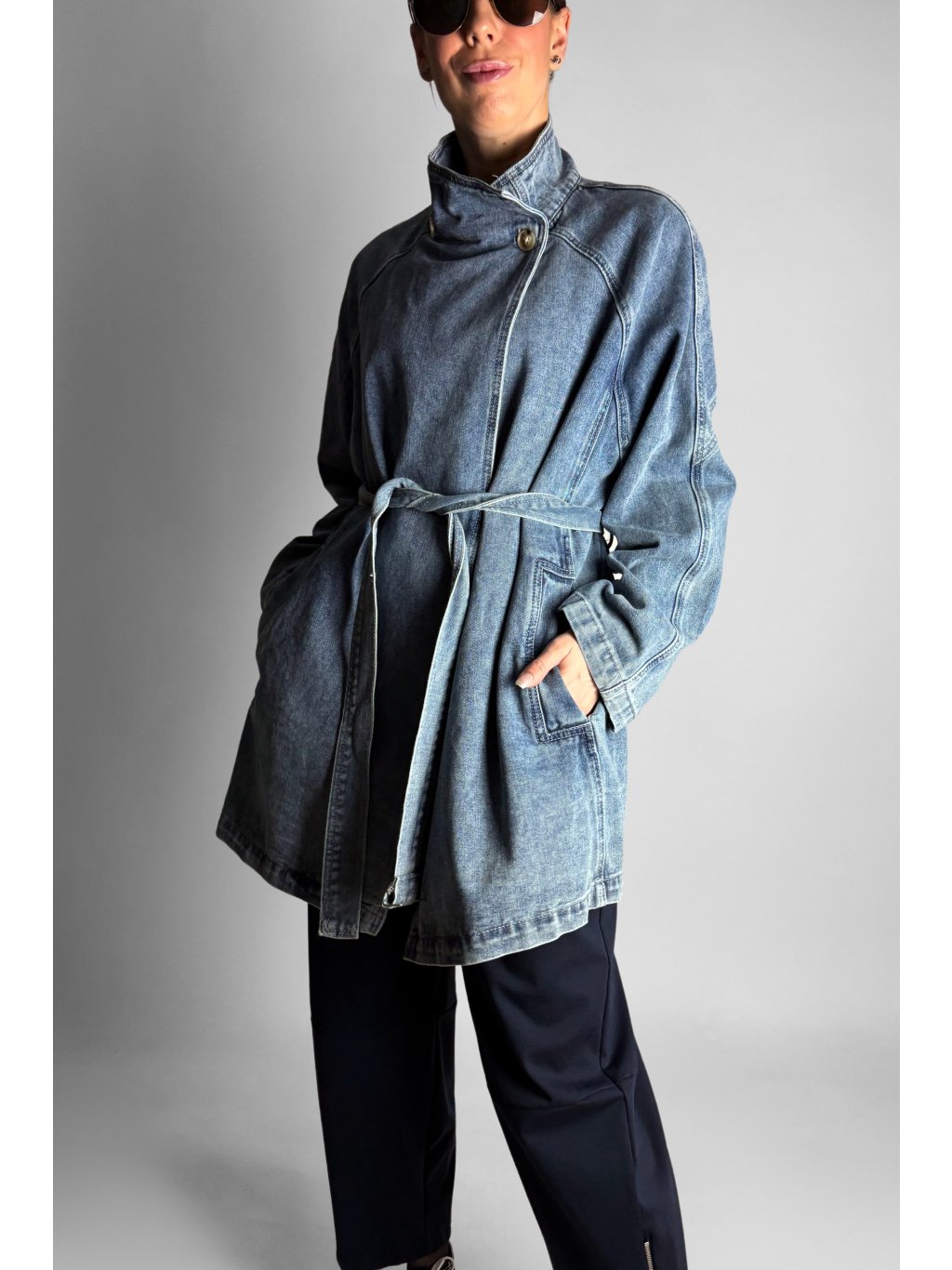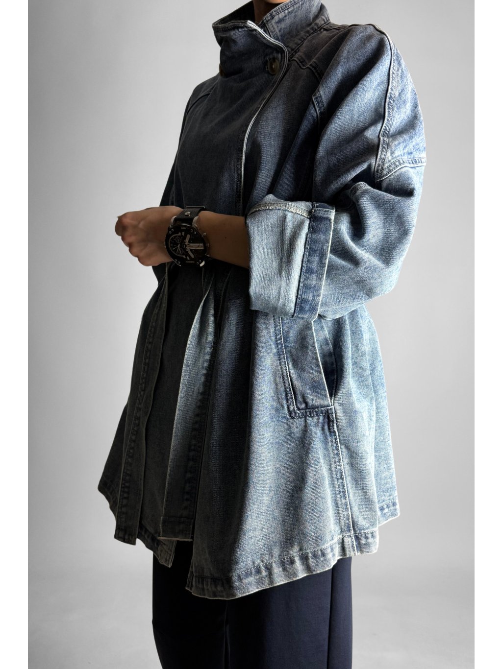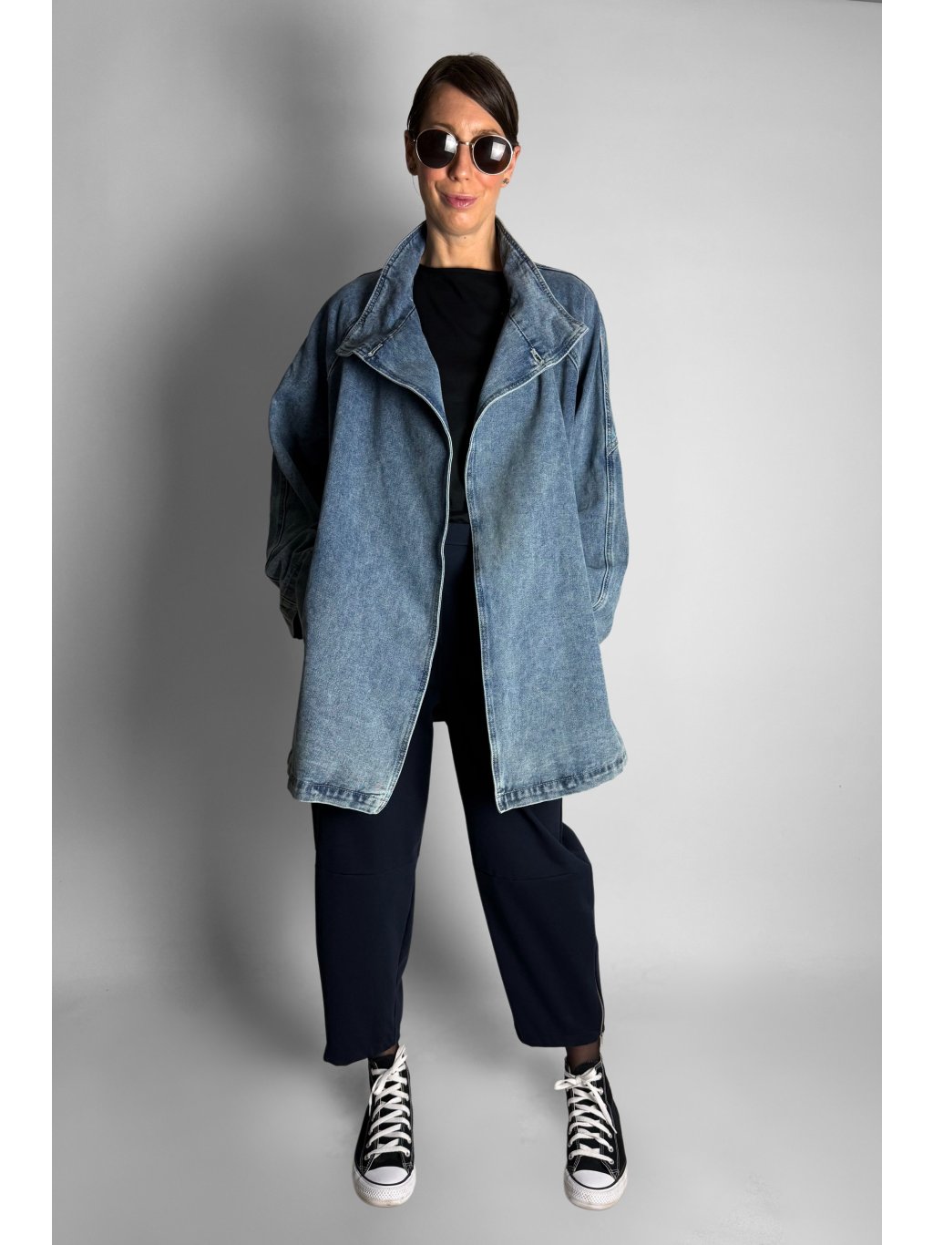 Stylový riflový kabátek v moderním volnějším střihu s vyšším stojáčkem. Model je vyroben z pevnější rifloviny bez podšívky, díky čemuž působí přirozeně a je ideální na přechodné období.