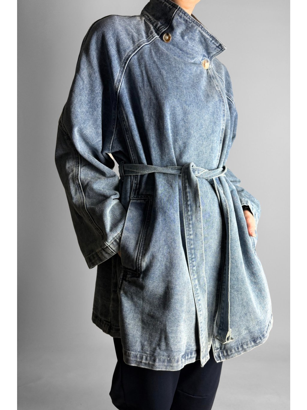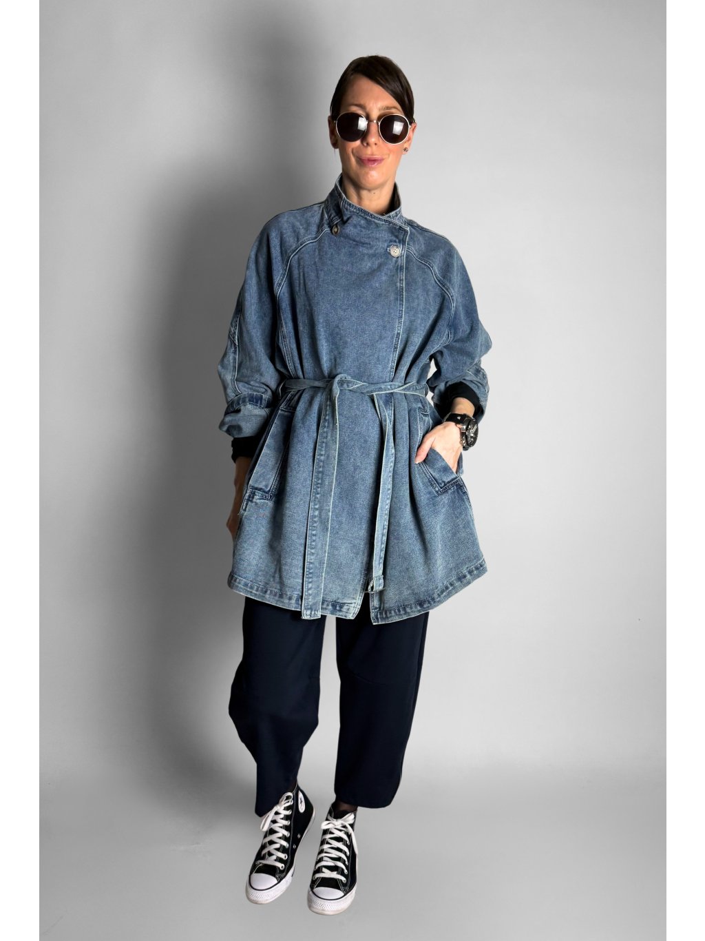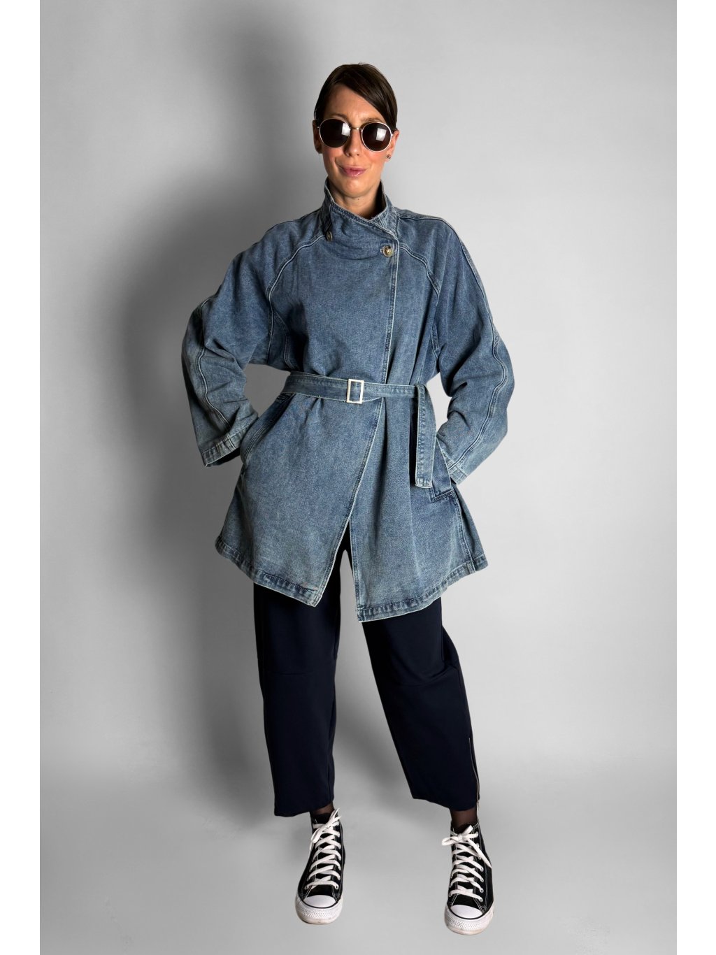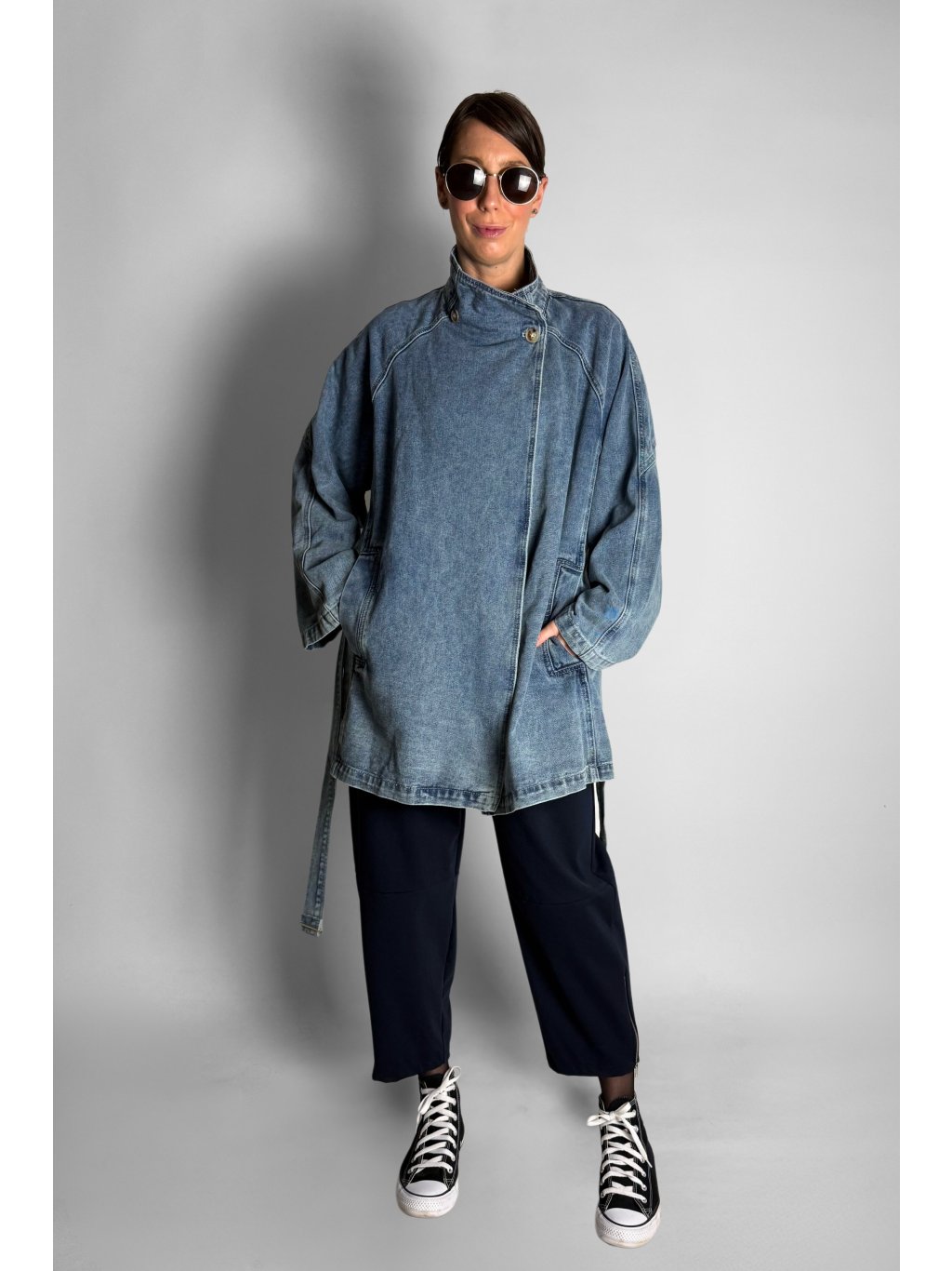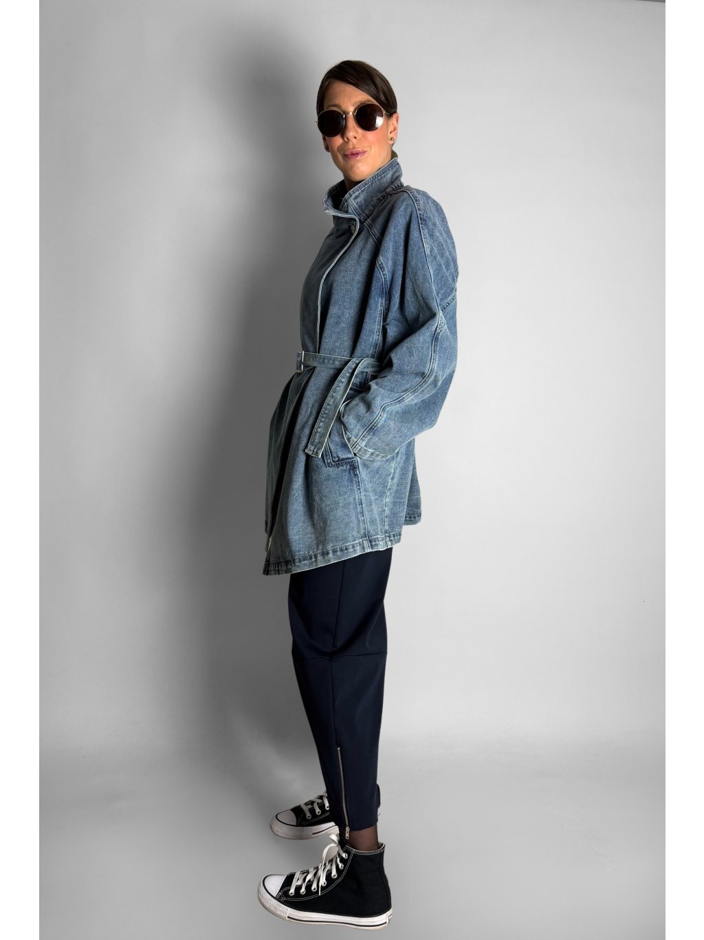 Stylový riflový kabátek v moderním volnějším střihu s vyšším stojáčkem. Model je vyroben z pevnější rifloviny bez podšívky, díky čemuž působí přirozeně a je ideální na přechodné období.