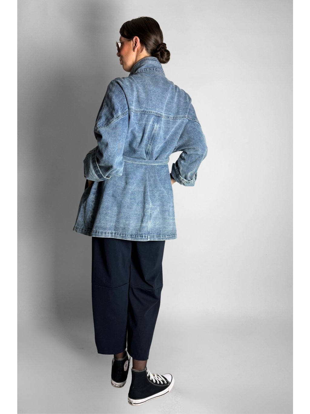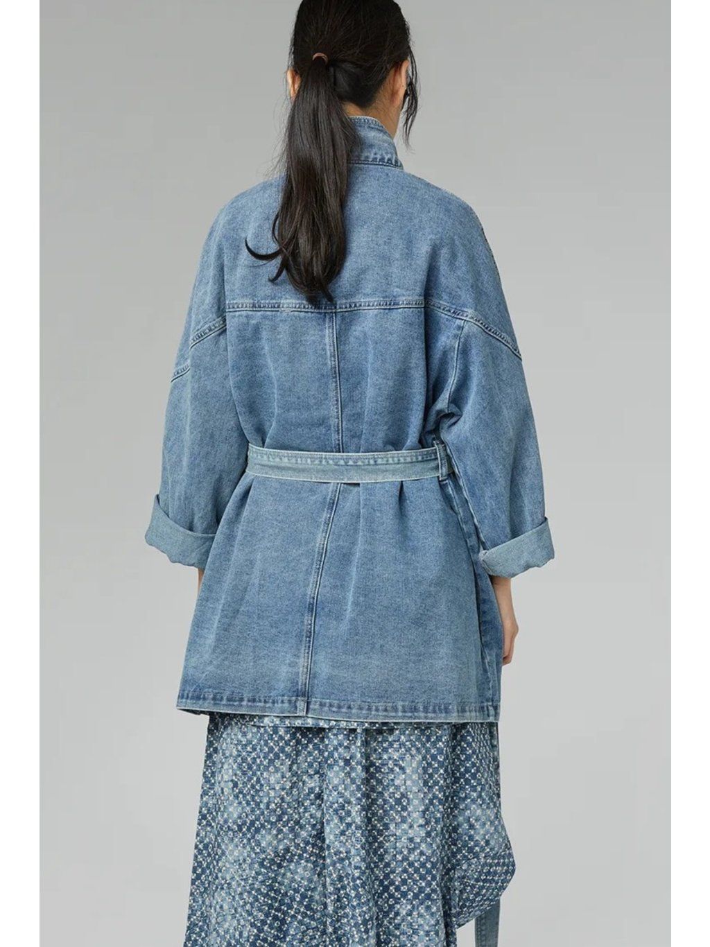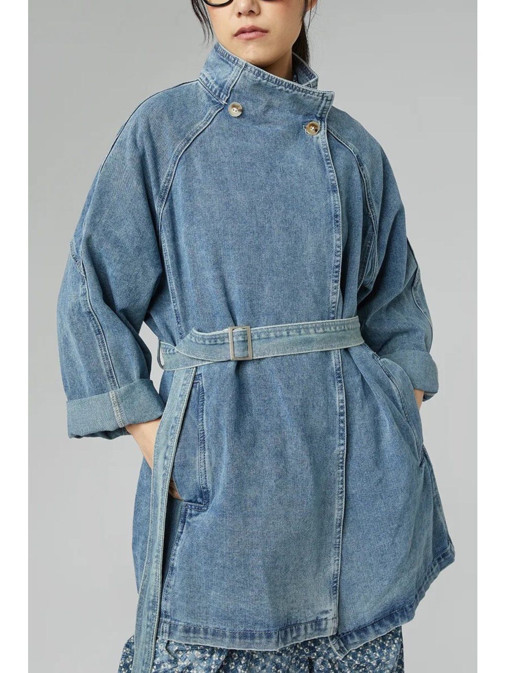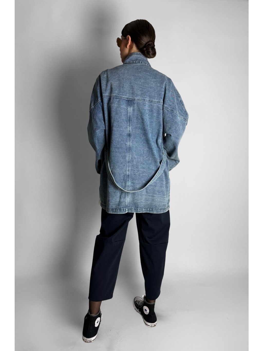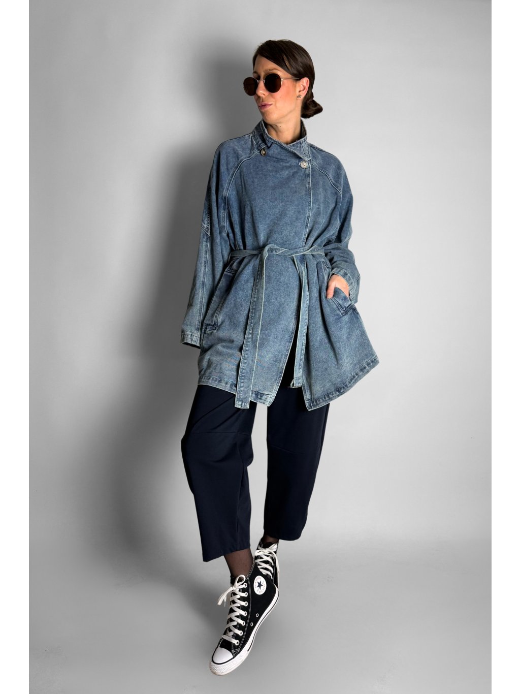 Stylový riflový kabátek v moderním volnějším střihu s vyšším stojáčkem. Model je vyroben z pevnější rifloviny bez podšívky, díky čemuž působí přirozeně a je ideální na přechodné období.