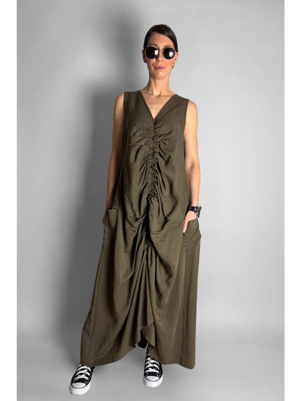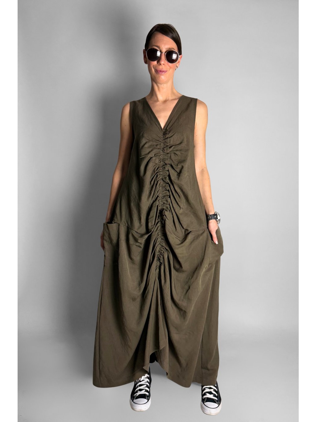 Výrazné dlouhé šaty s výstřihem do V a moderním, objemnějším střihem do A. Model je bez rukávů a působí velmi vzdušně a elegantně. Přední část šatů je od výstřihu až dolů doplněna řasením, které vytváří zajímavý designový detail a dodává modelu lehkou strukturu.