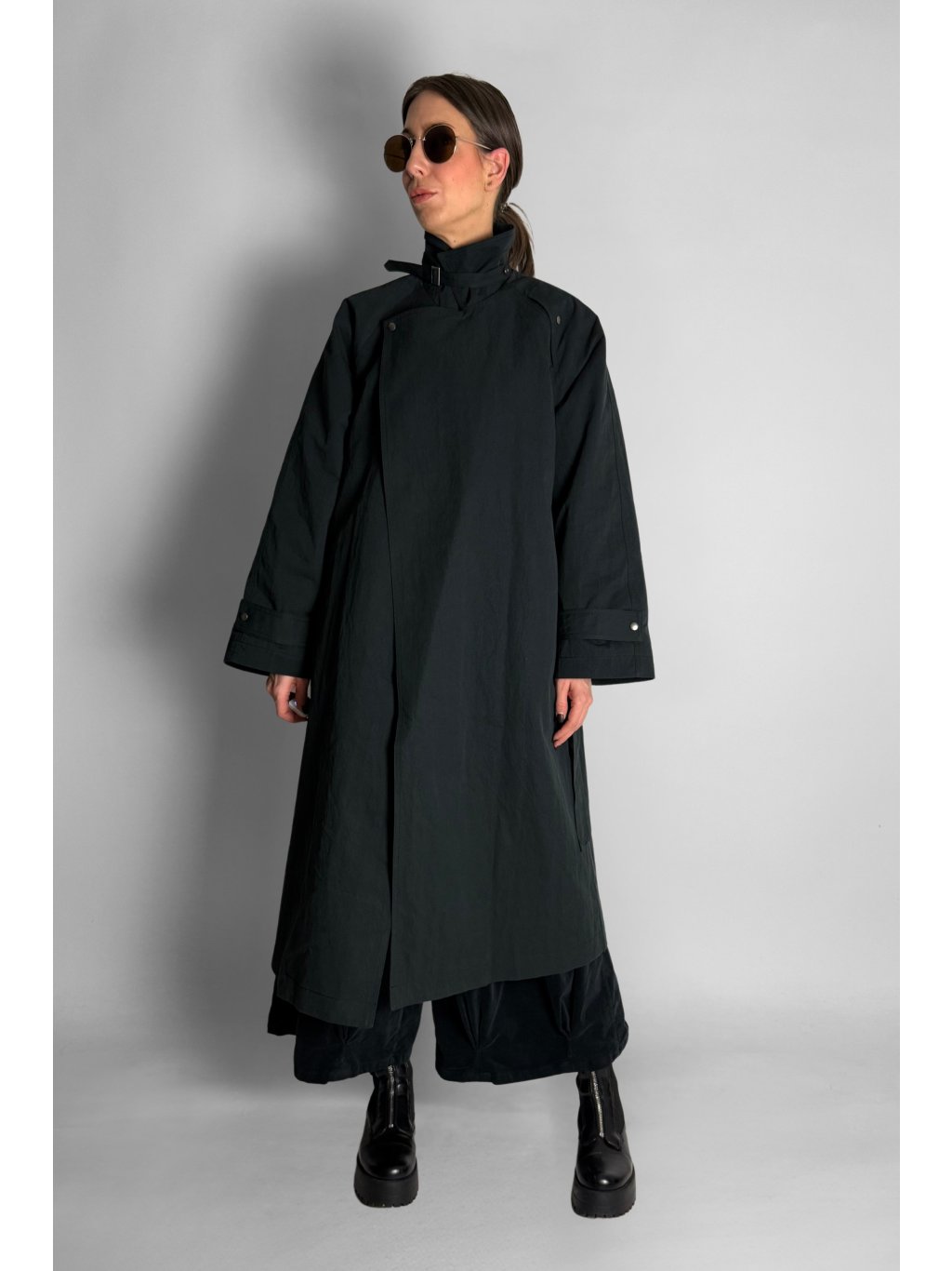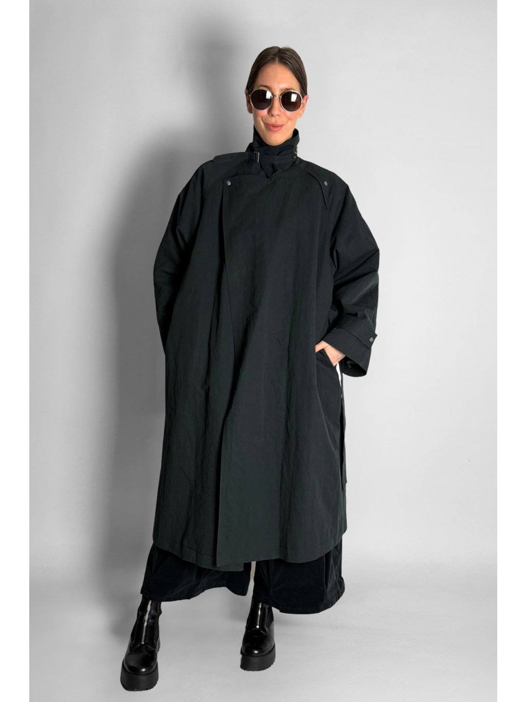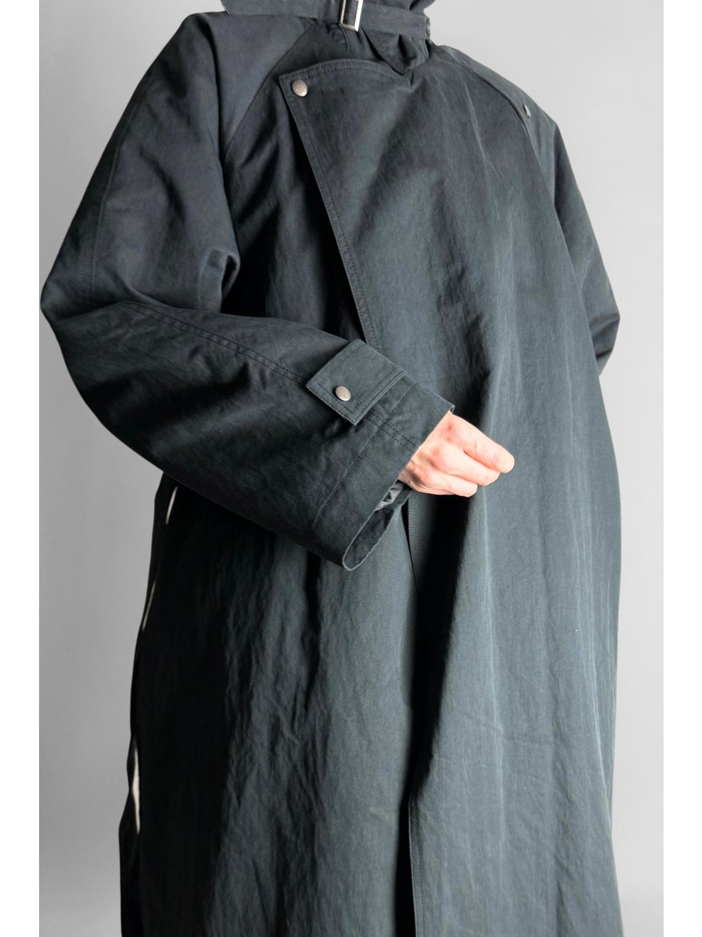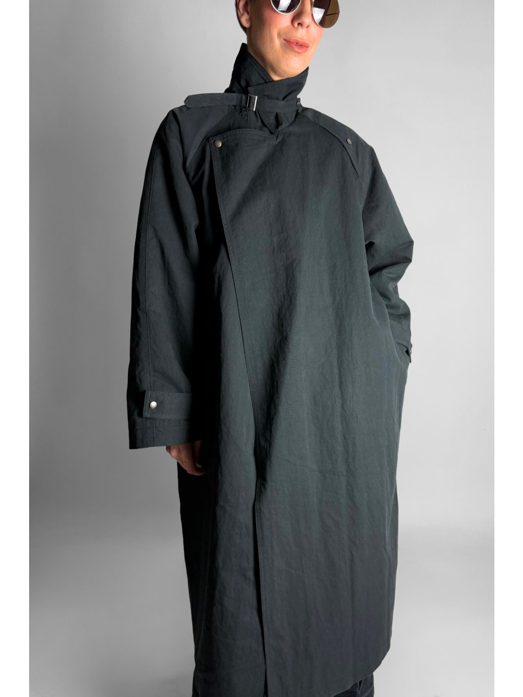 Možnost vytvořit vysoký límec pomocí pásku u krku s kovovou přezkou, pásek lze odepnout na obou stranách knoflíkem