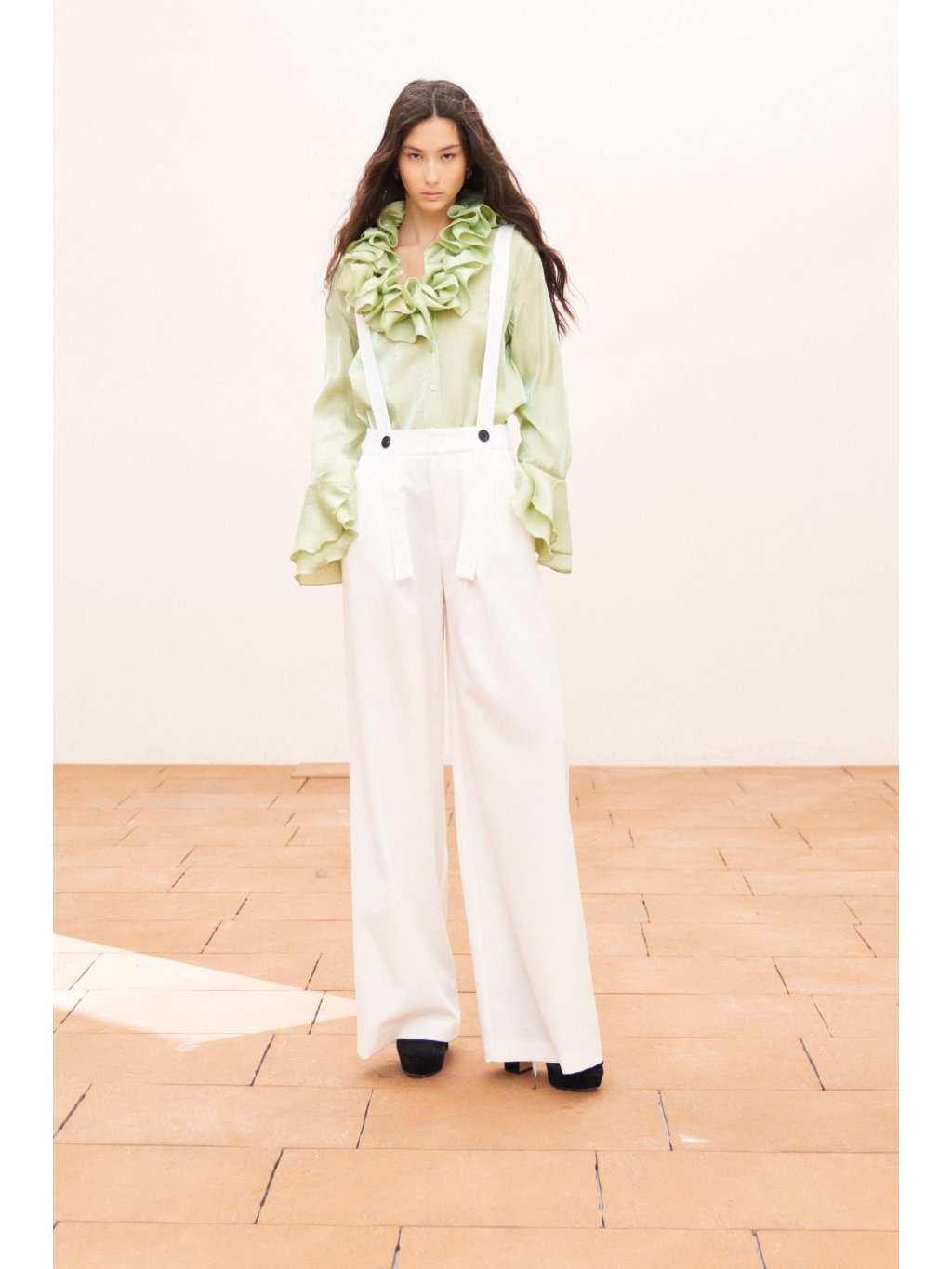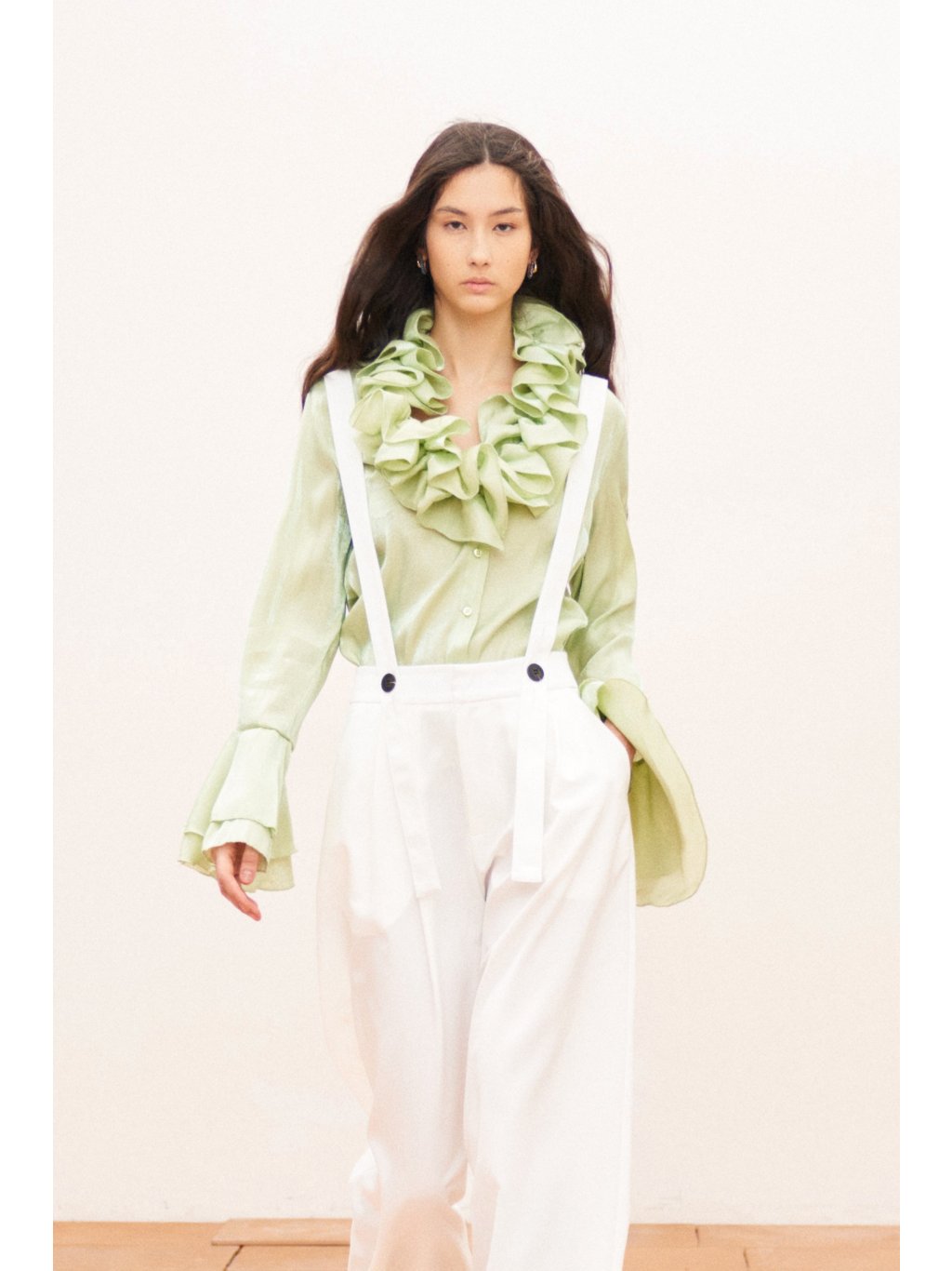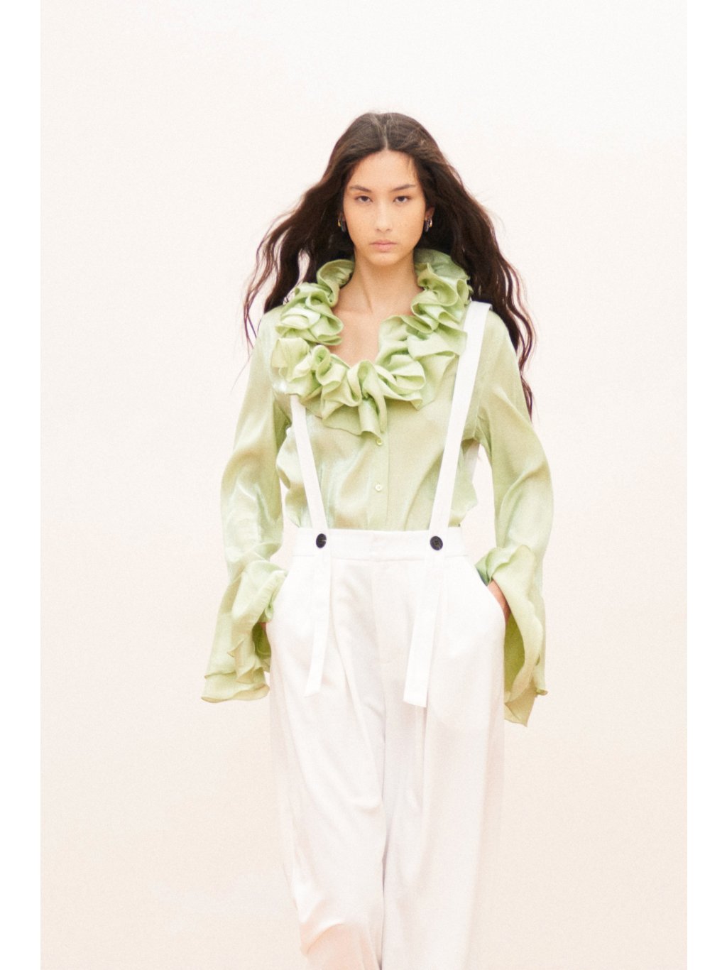 Elegantní halenka s výraznými volány kolem krku, které zdůrazňují V-výstřih
