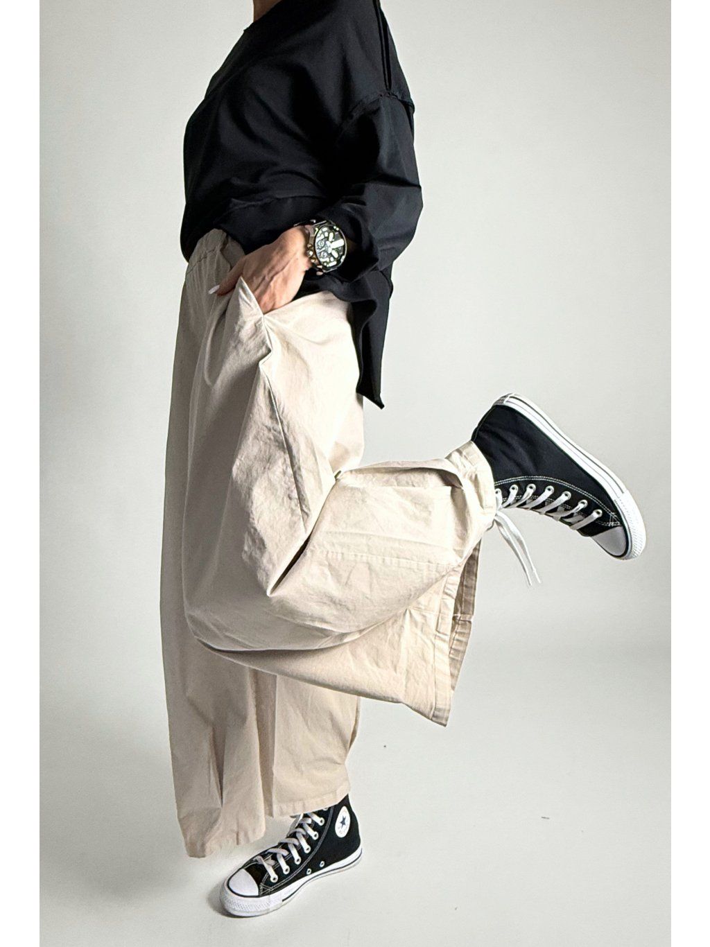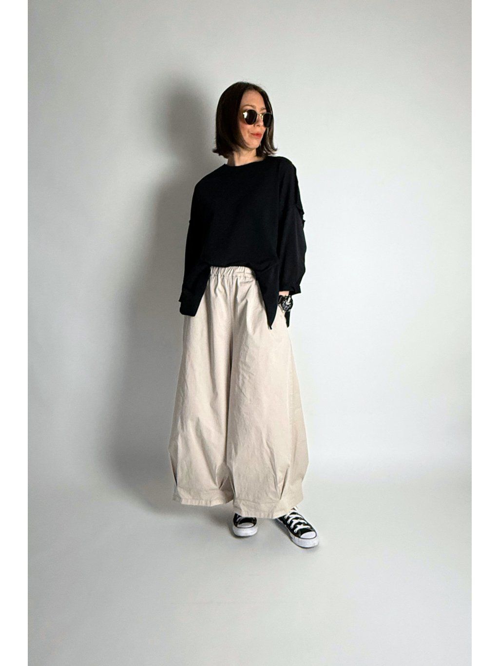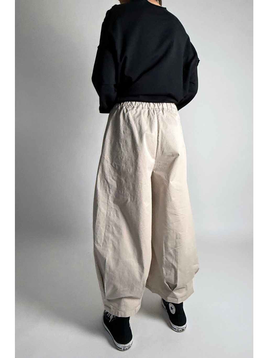 Pohodlné kalhoty s volnějším střihem a výraznými překlady na nohavicích, které jsou zakončené tenkou manžetou.