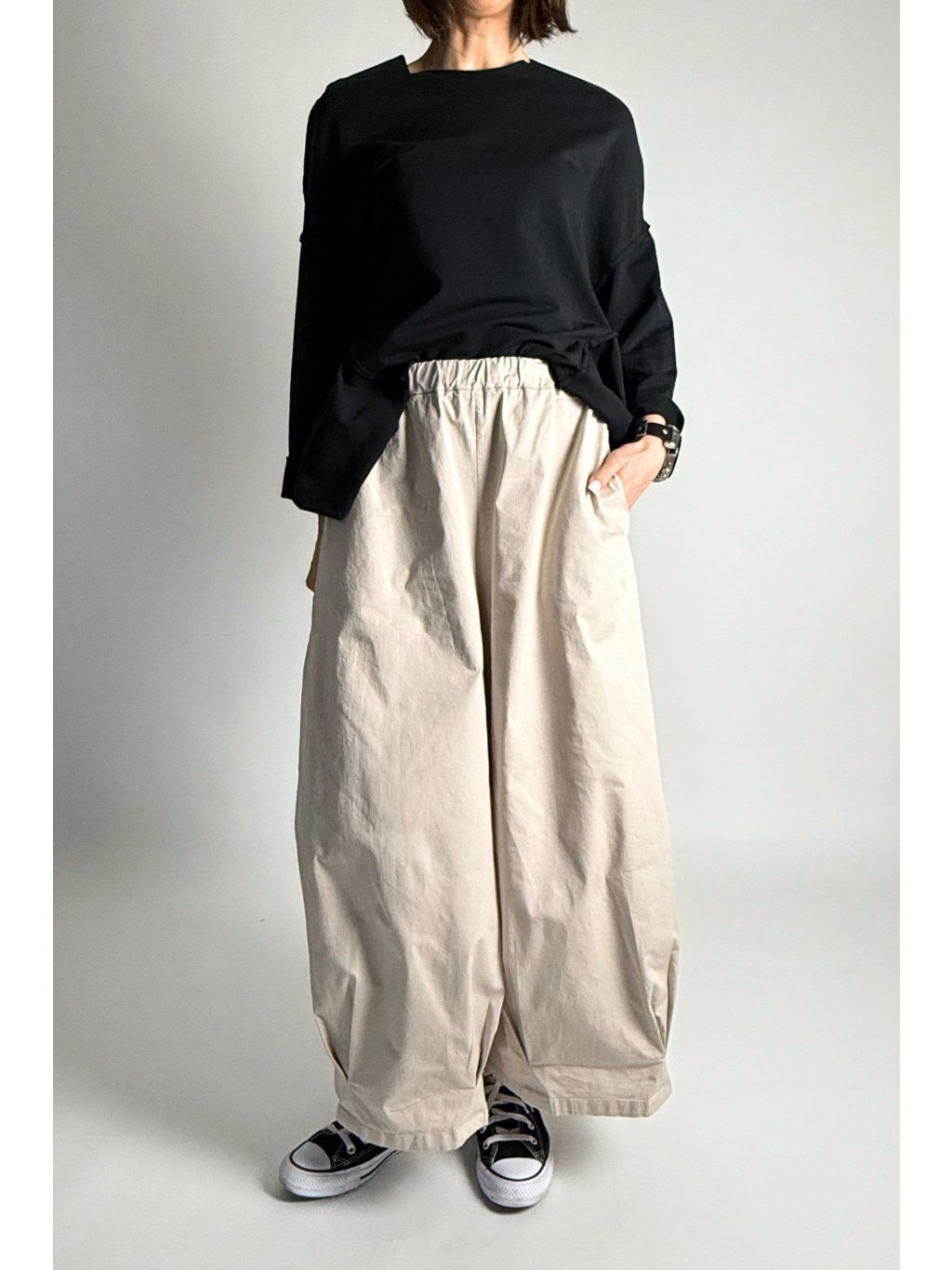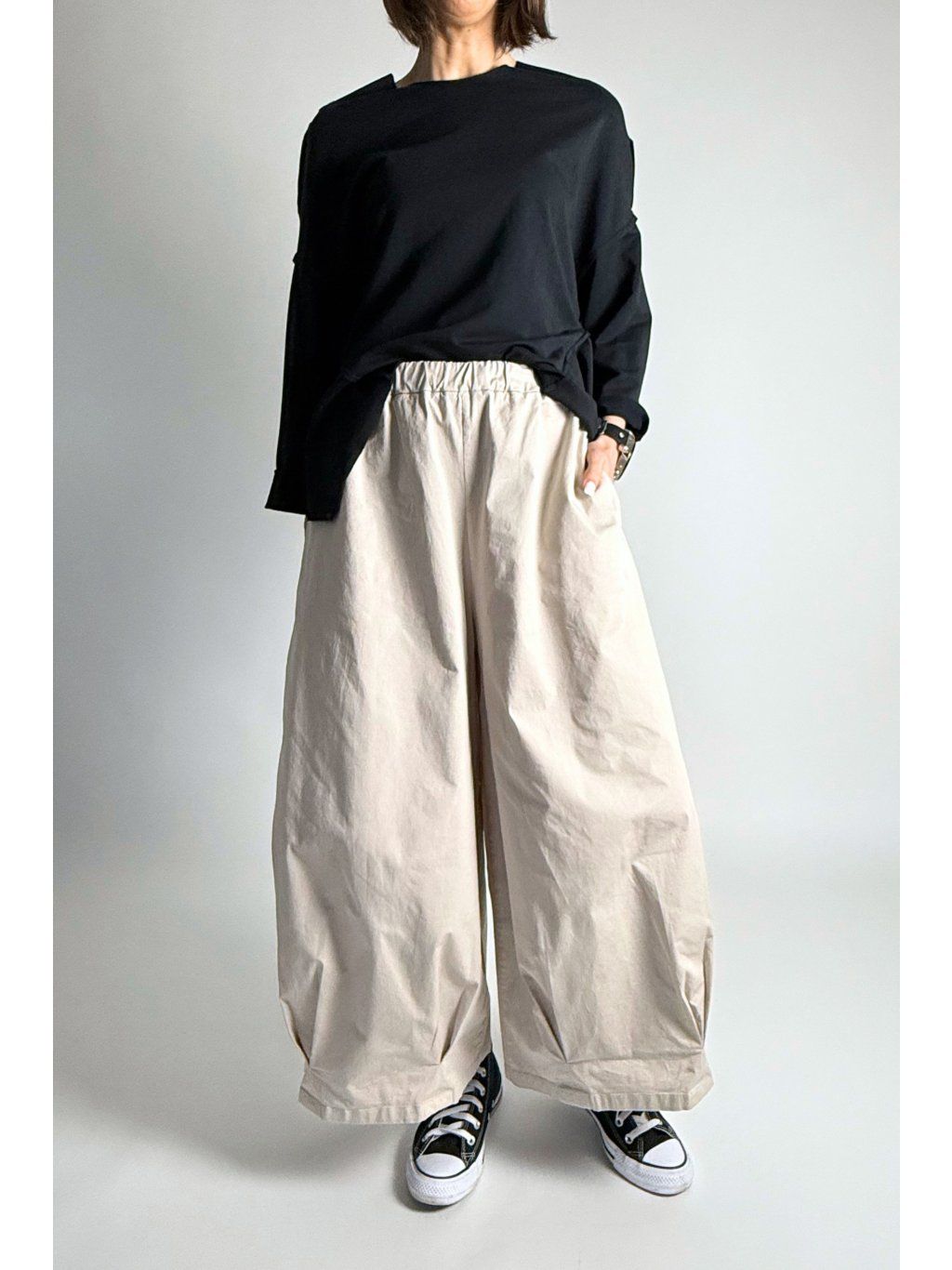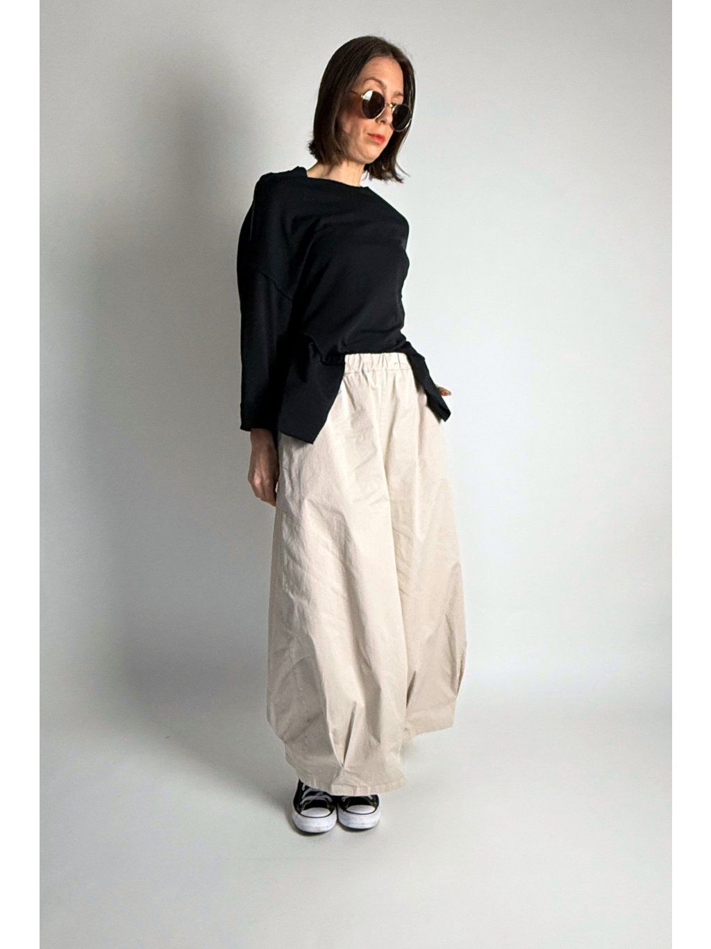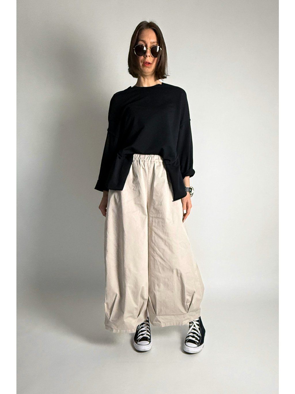 Pohodlné kalhoty s volnějším střihem a výraznými překlady na nohavicích, které jsou zakončené tenkou manžetou.