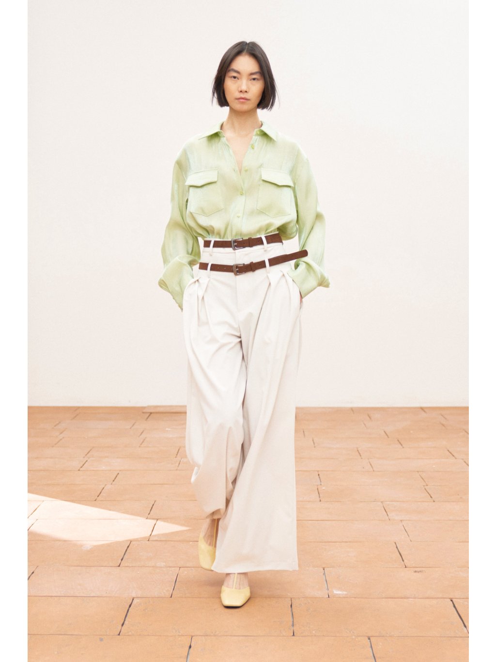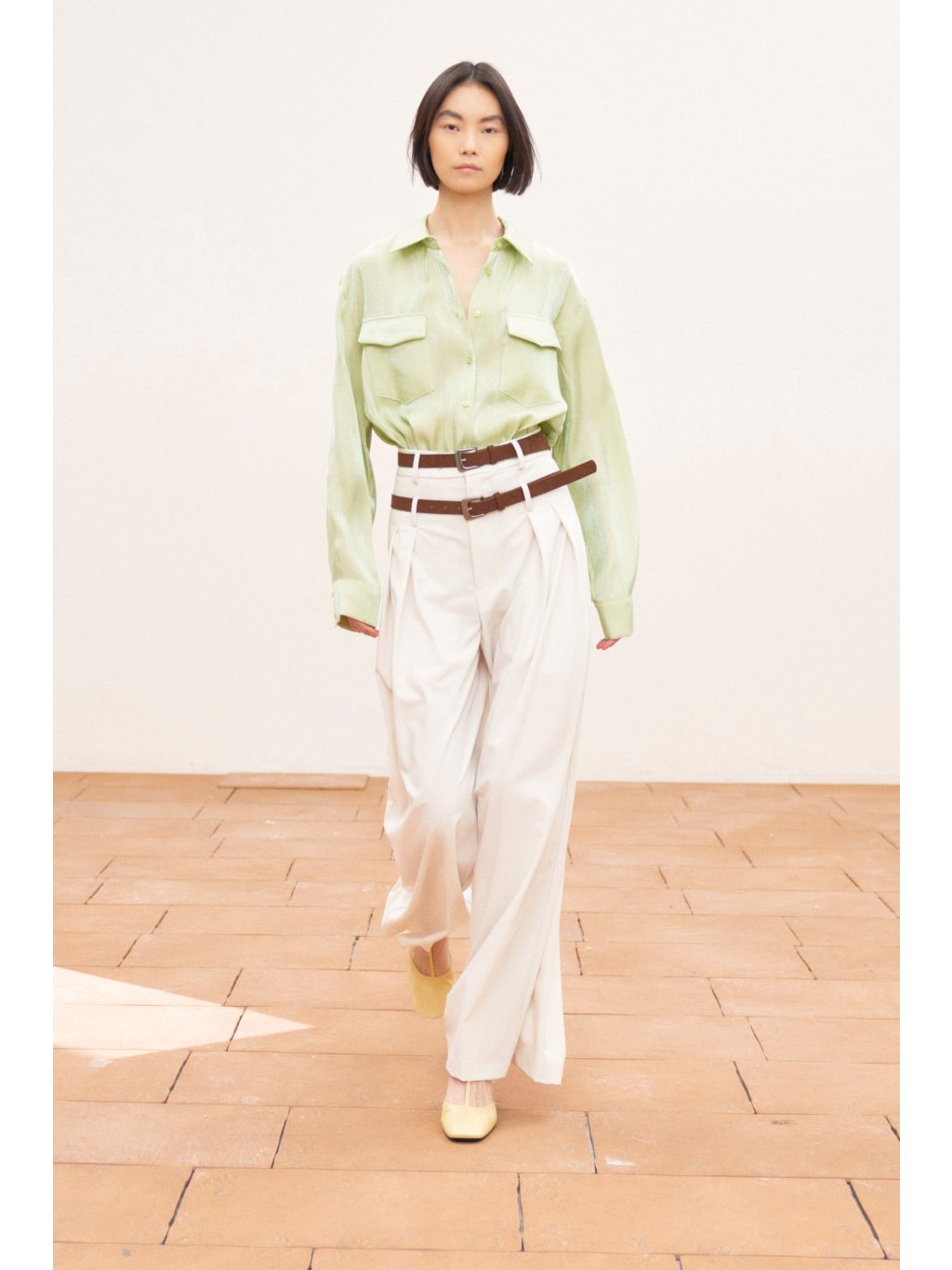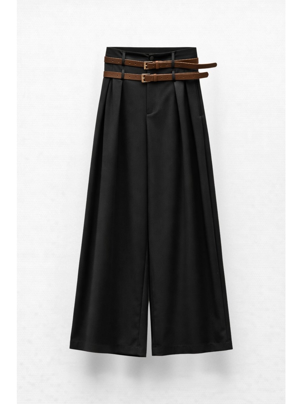 Elegantní kalhoty s dvojím dekorativním páskem s kovovými přezkami v chromové barvě