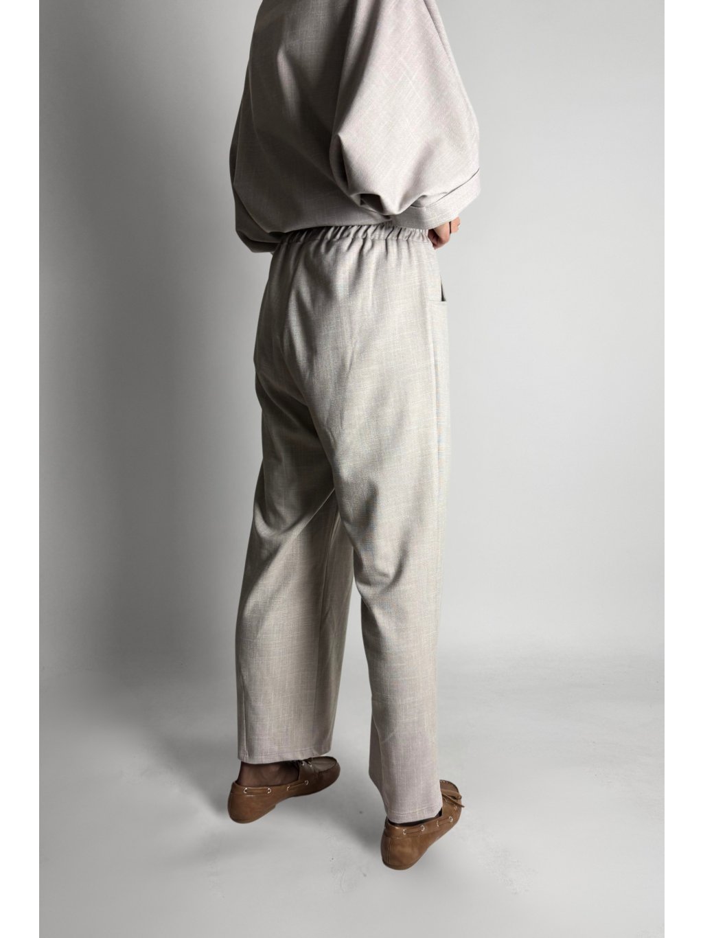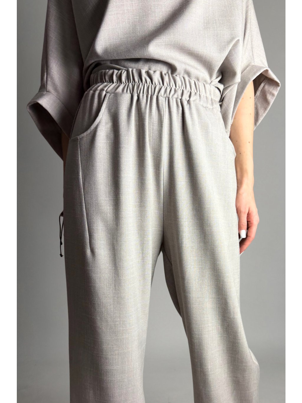 Kalhoty mají elastický pas, díky kterému se pohodlně přizpůsobí postavě. Vpředu jsou doplněny o dvě kapsy, zadní část je bez kapes.