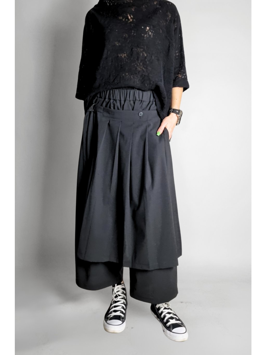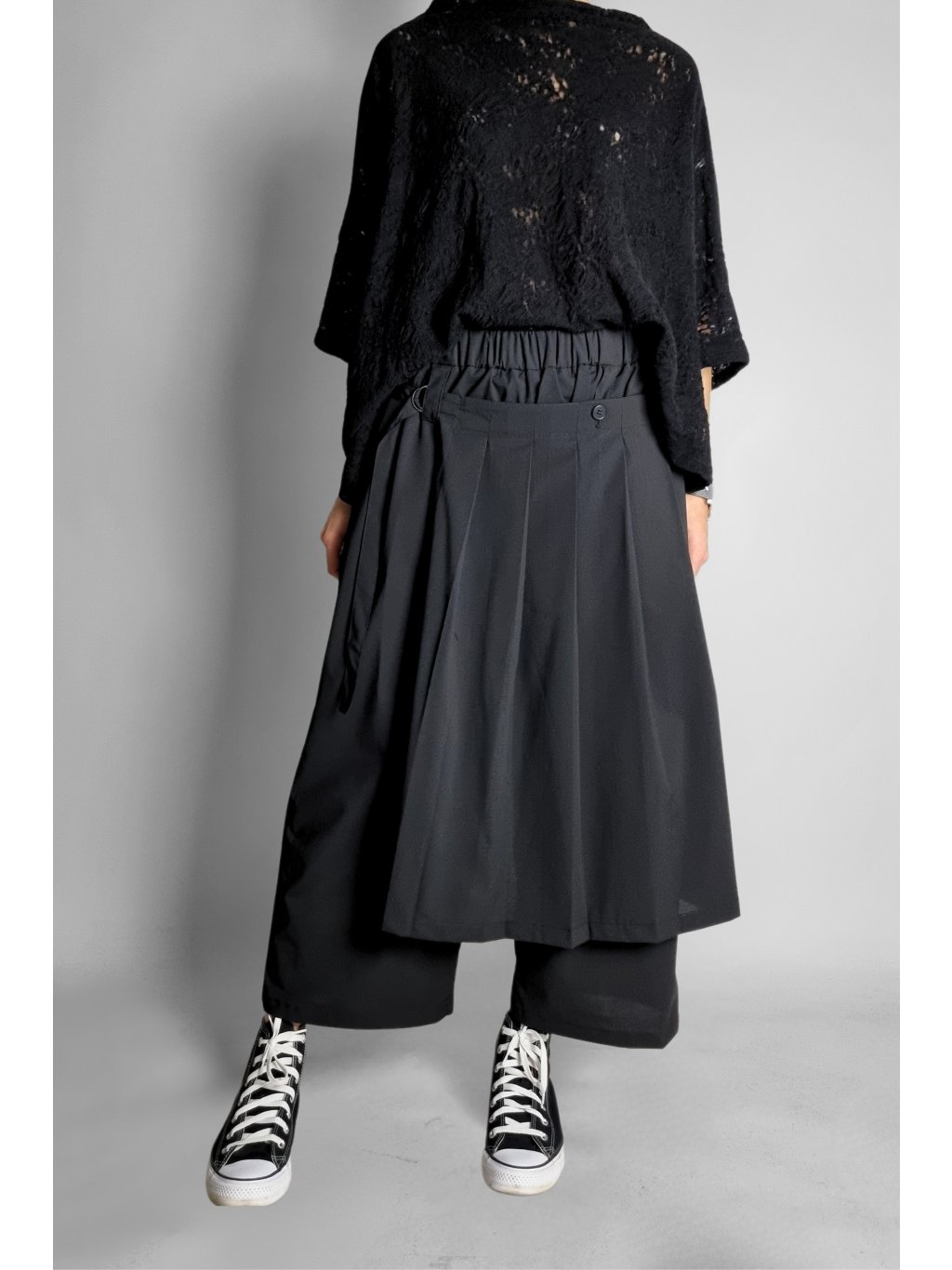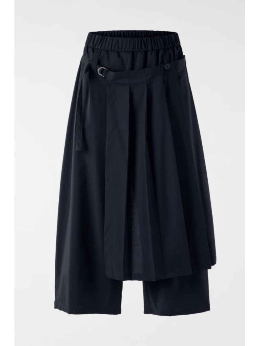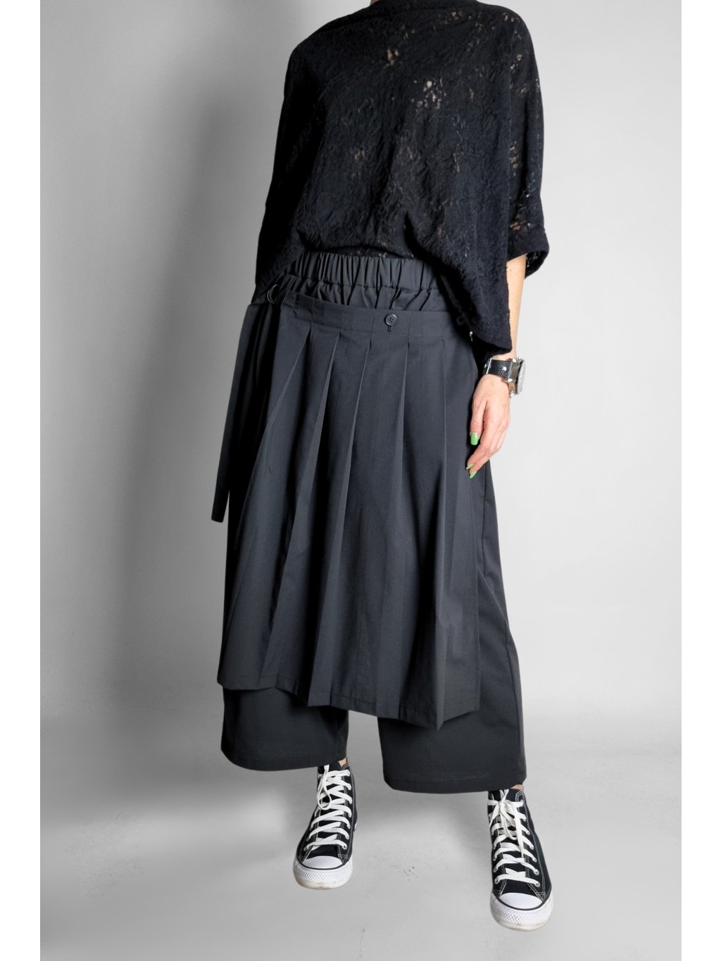 Plisovaný přední panel pro efekt sukně kalhot, odnímatelný dle potřeby pro kalhoty, zapínání na dva knoflíky a pásek s přezkou