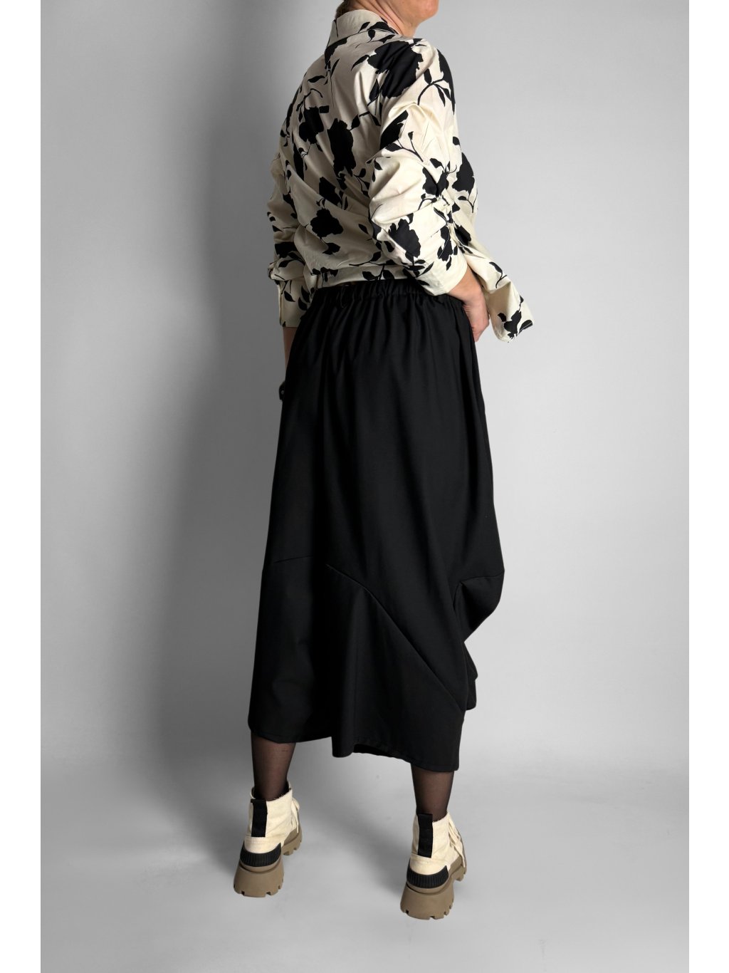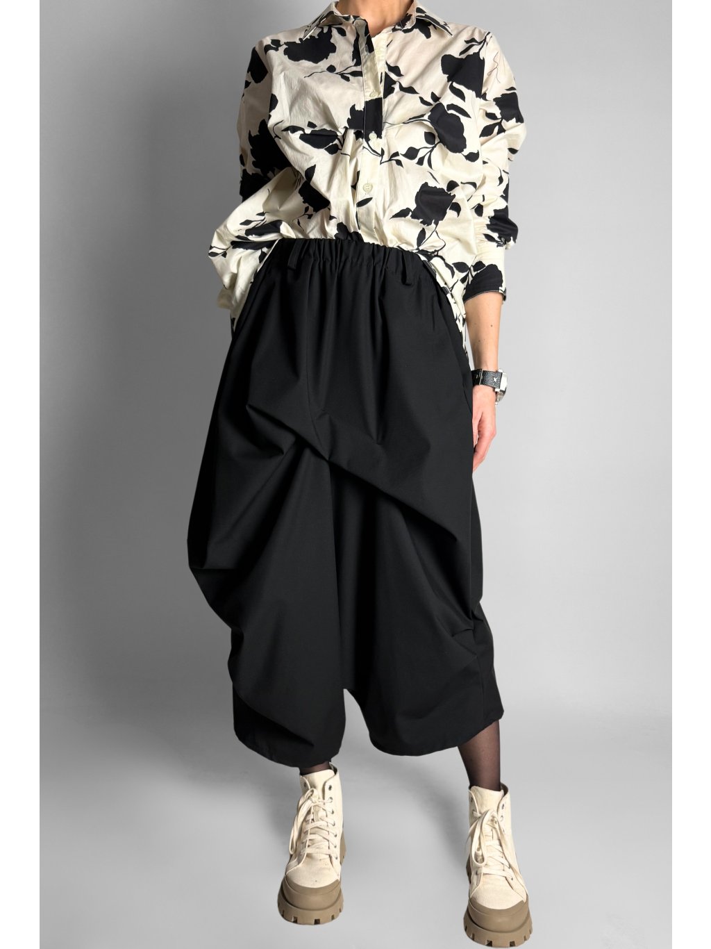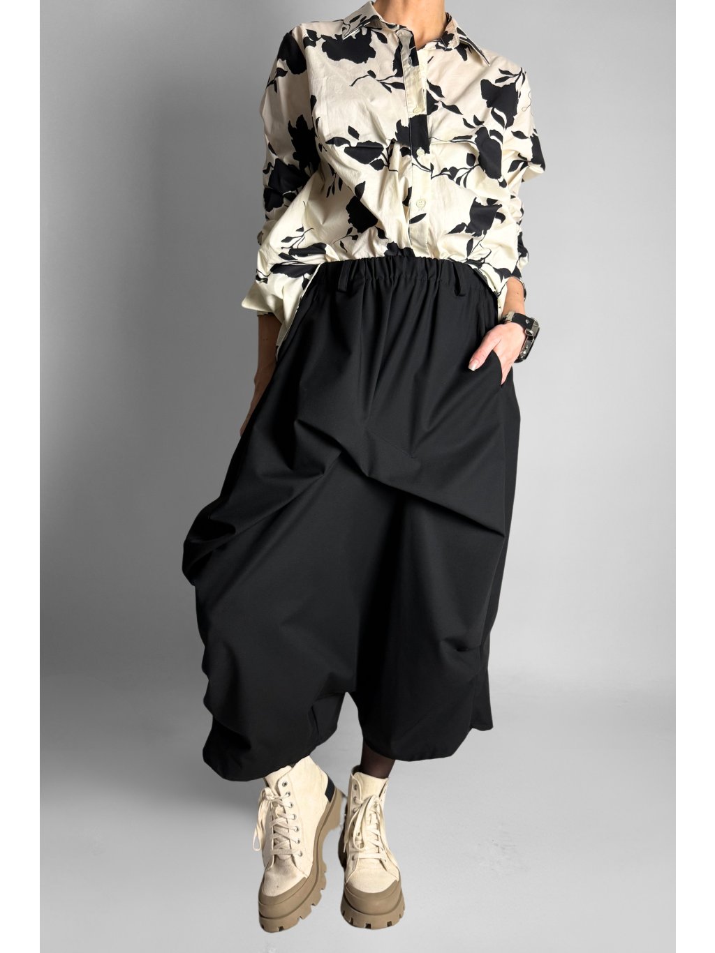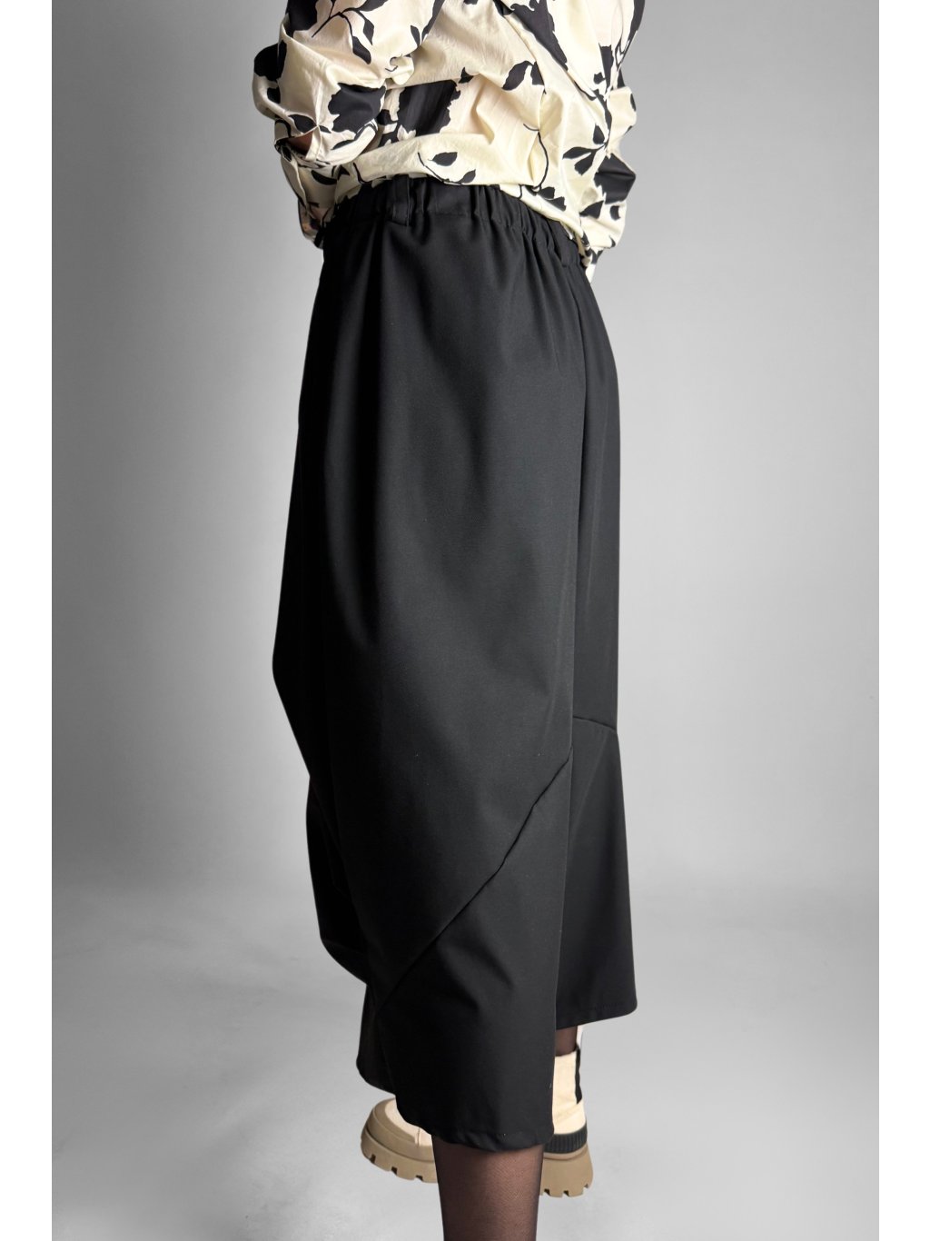 Stylové baggy kalhoty| sukně s volným střihem a předním kasáním, které vytváří zajímavý designový efekt a lehce připomíná vzhled sukně. Model má elastický pas s oky na pásek a dvě praktické přední kapsy. Přední část je jemně přešitá, což dodává kalhotám strukturu a moderní vzhled.