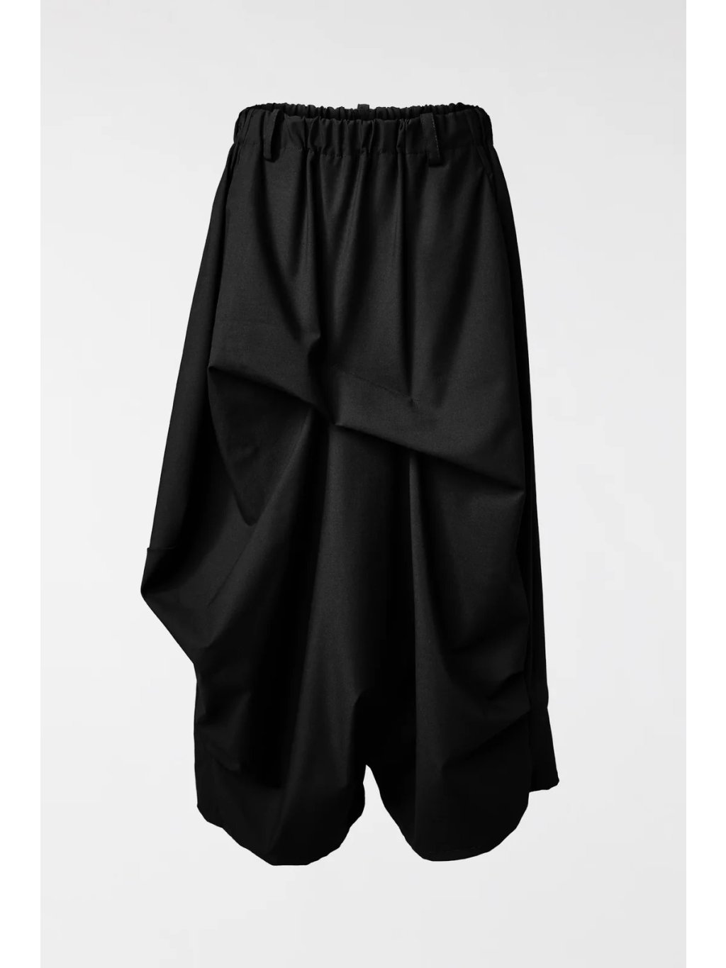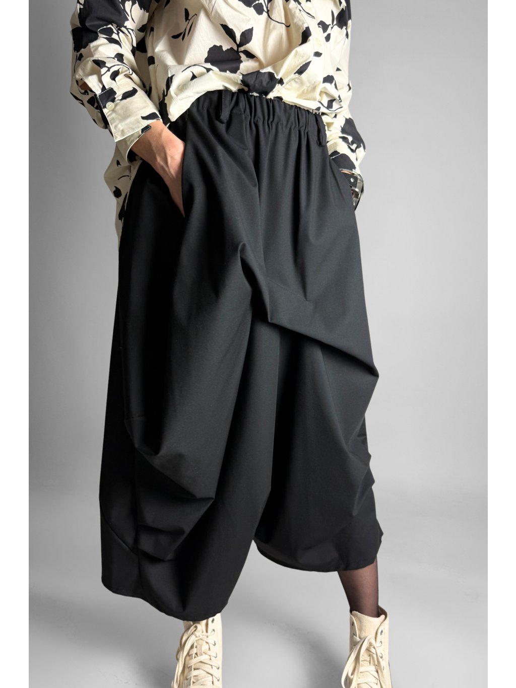 Sukně z keprové viskózové směsi s plisovaným detailem. Elastický pas s poutky. Boční kapsy všité do střihu. Velmi krátký rozkrok. Boční ohyby na kotníku. Volný a pohodlný střih.