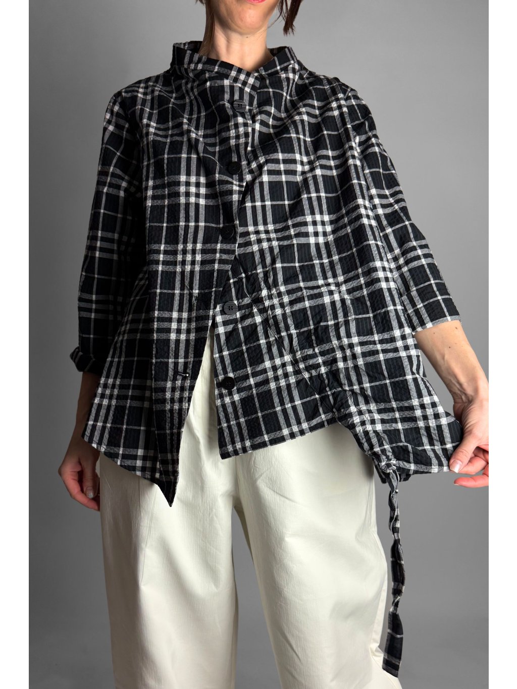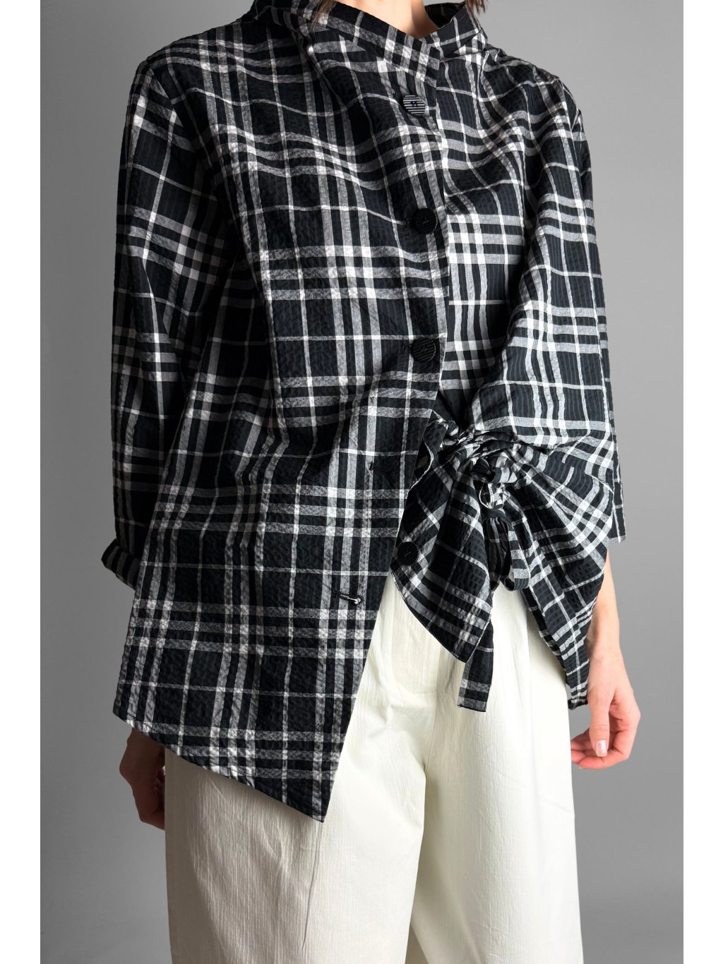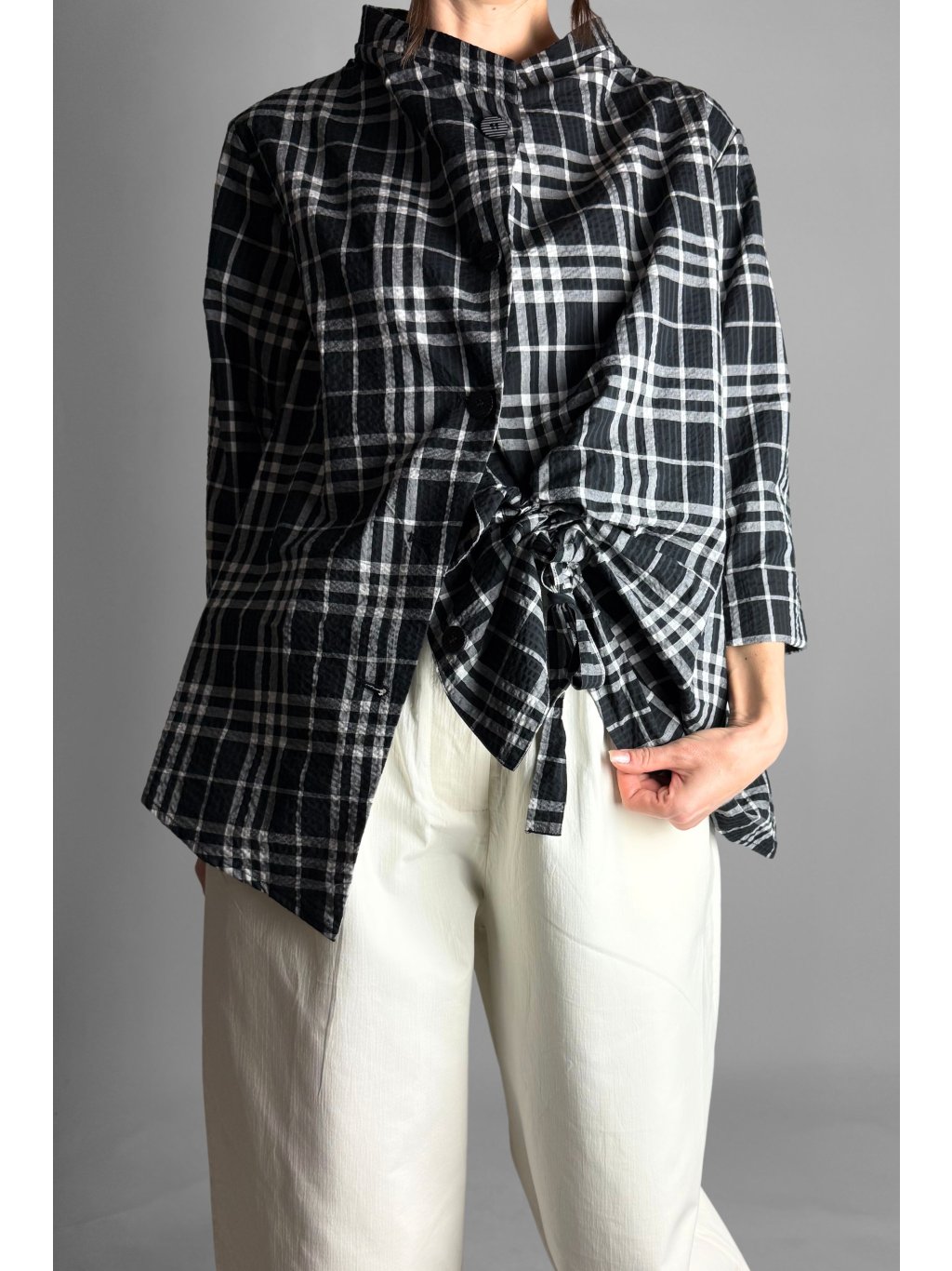 Model má asymetrický střih, vyšší stojáček a zapínání na knoflíky. Na jedné straně je doplněn o vázání, díky kterému lze spodní část stáhnout a vytvořit mašli. Tím vzniká zajímavý designový efekt a možnost upravit si siluetu podle potřeby.
