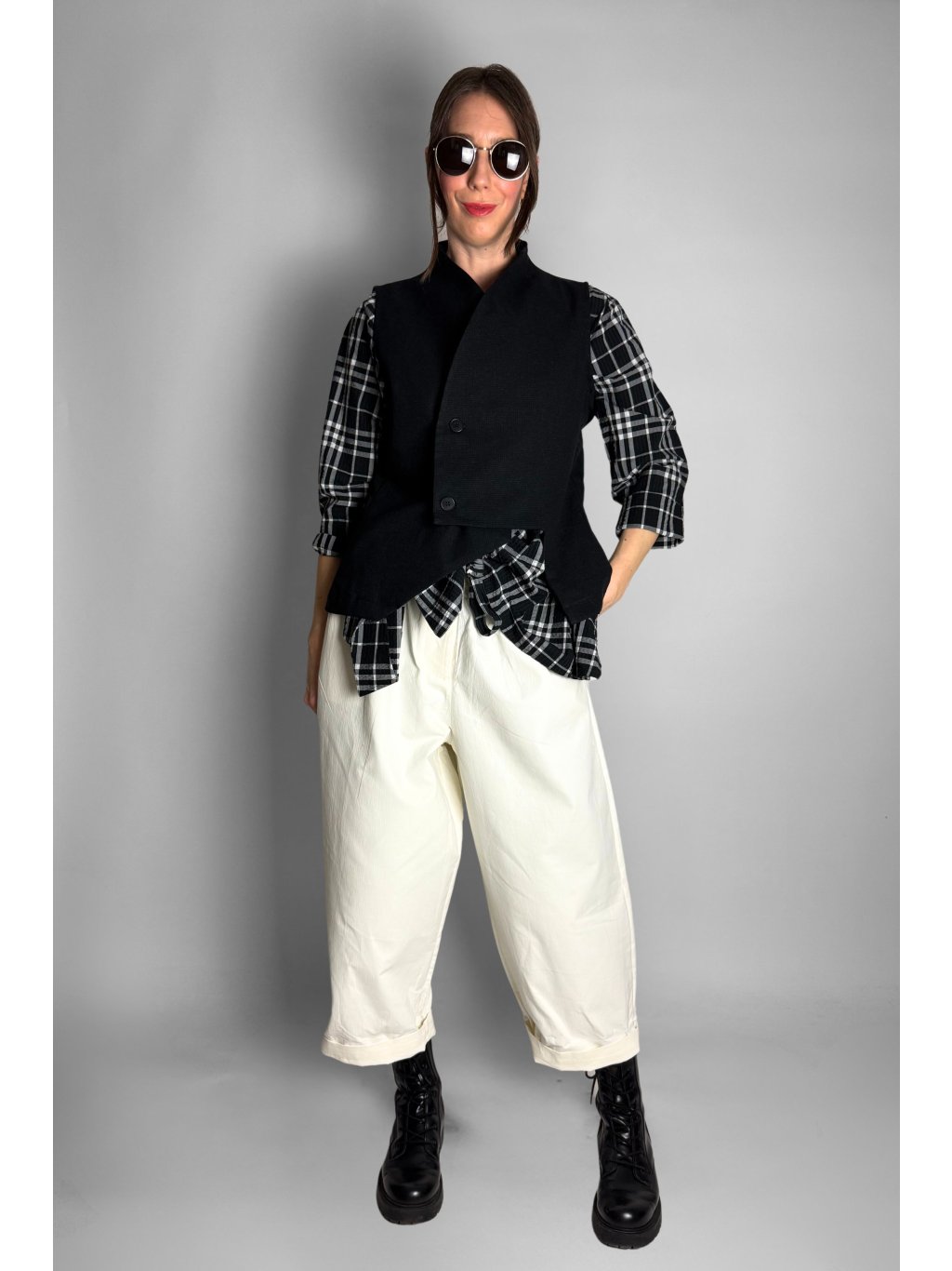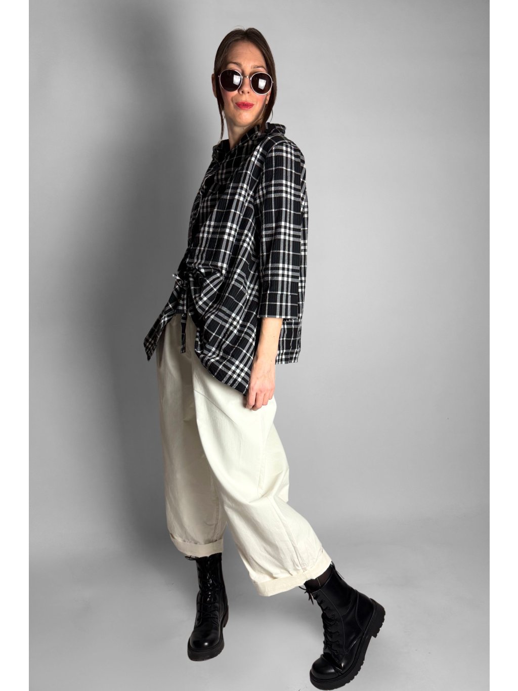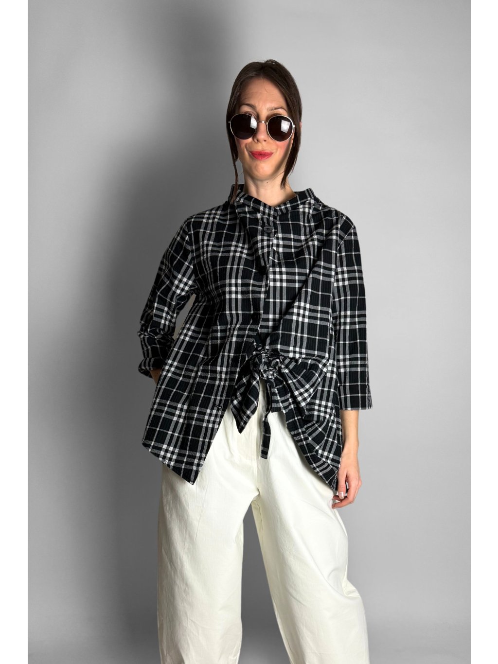 Model má asymetrický střih, vyšší stojáček a zapínání na knoflíky. Na jedné straně je doplněn o vázání, díky kterému lze spodní část stáhnout a vytvořit mašli. Tím vzniká zajímavý designový efekt a možnost upravit si siluetu podle potřeby.
