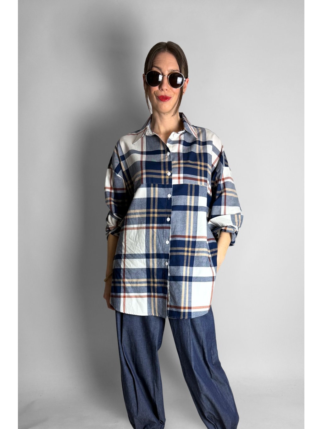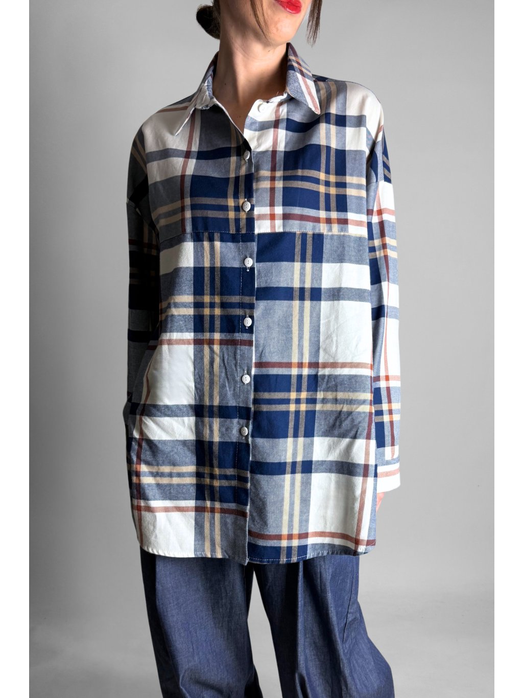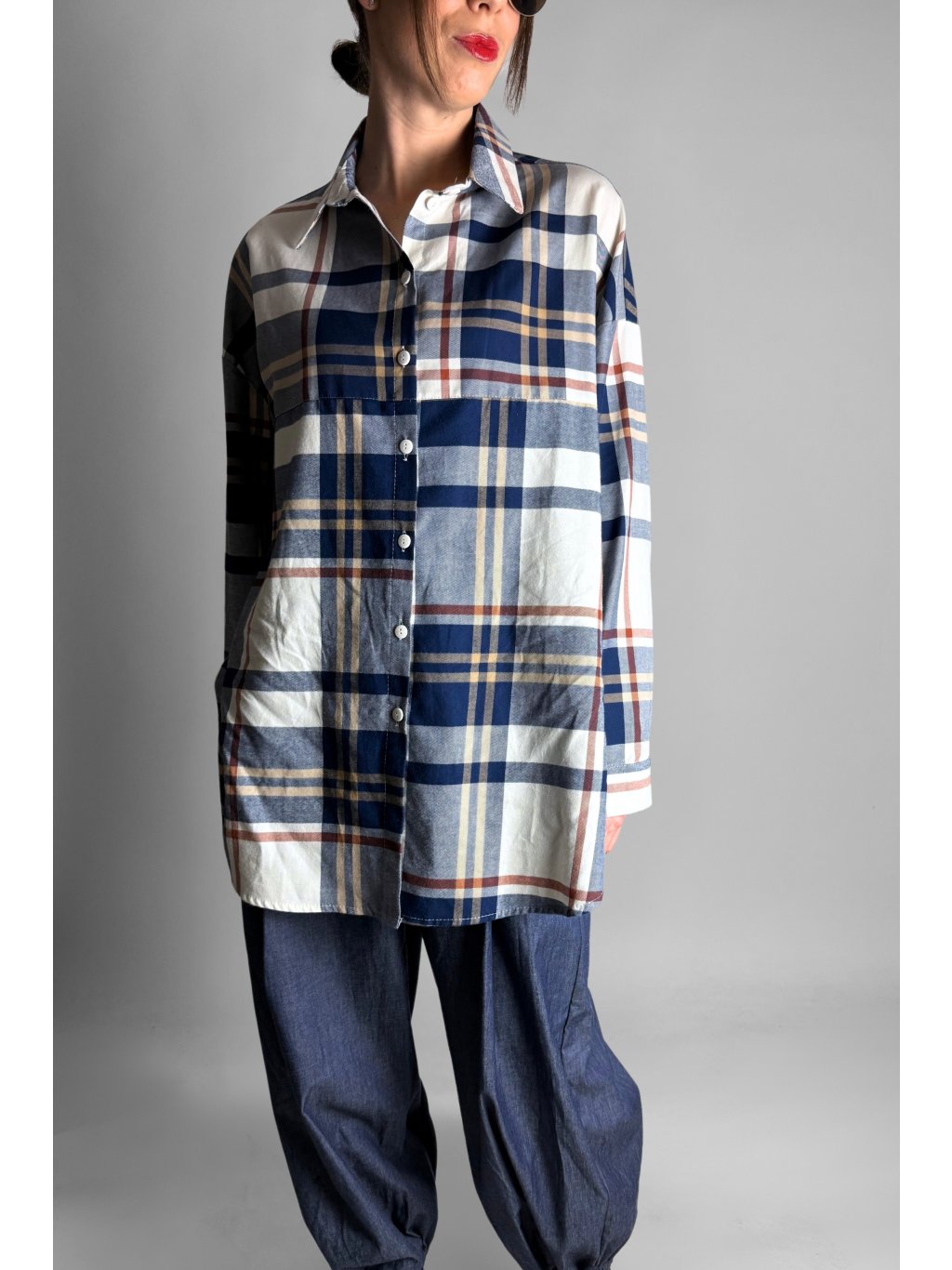 Stylová dámská košile s jemným károvaným vzorem v kombinaci modré, šedé, žluté a světle červené.