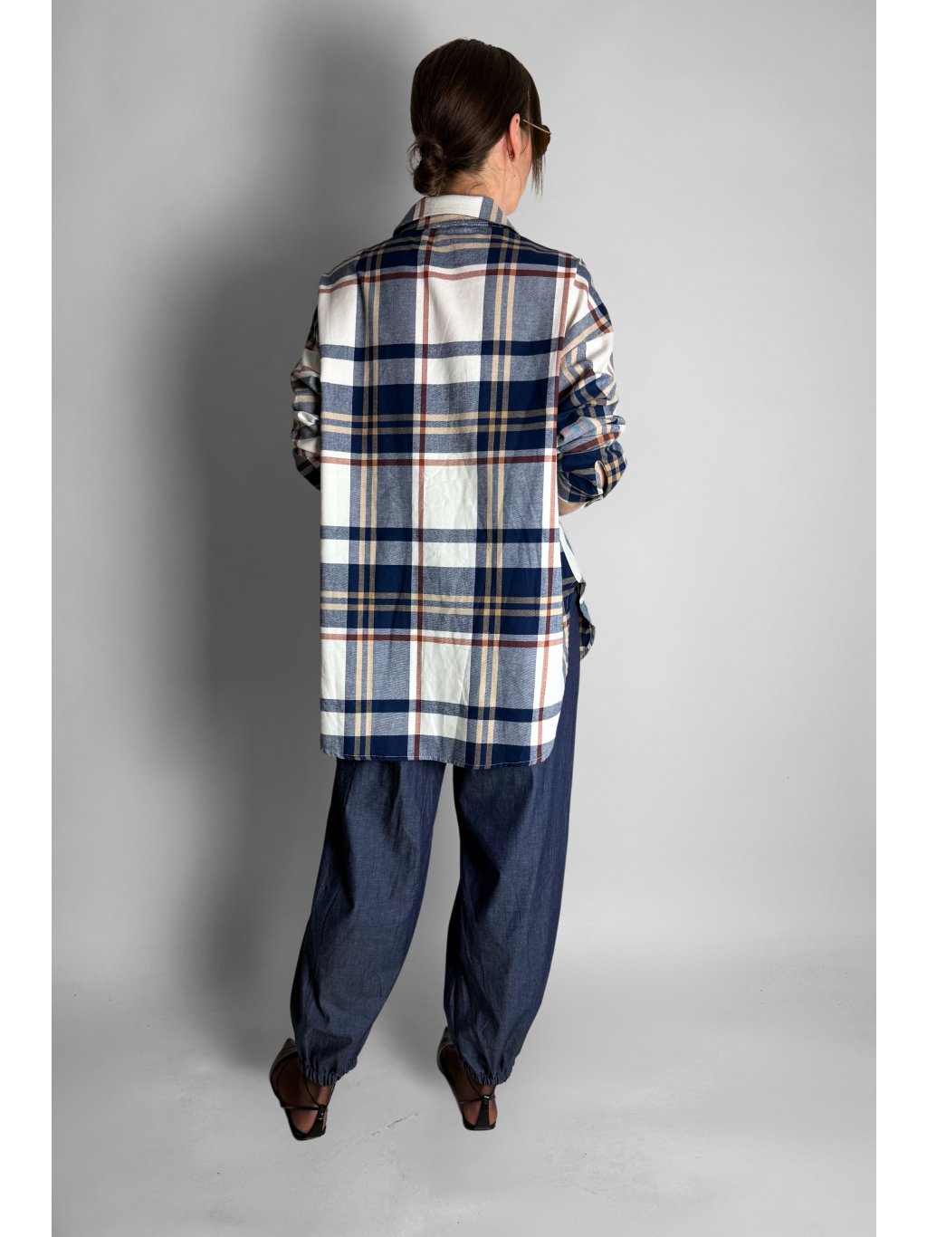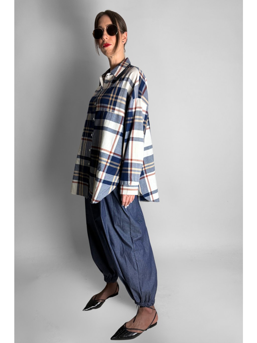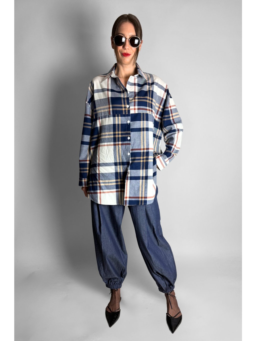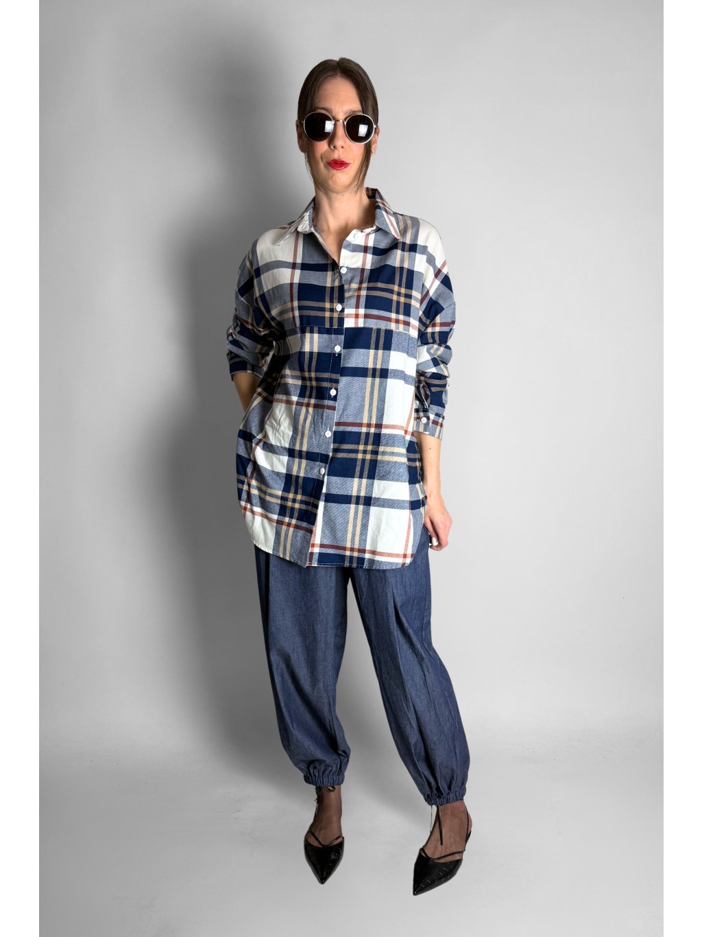 Stylová dámská košile s jemným károvaným vzorem v kombinaci modré, šedé, žluté a světle červené.