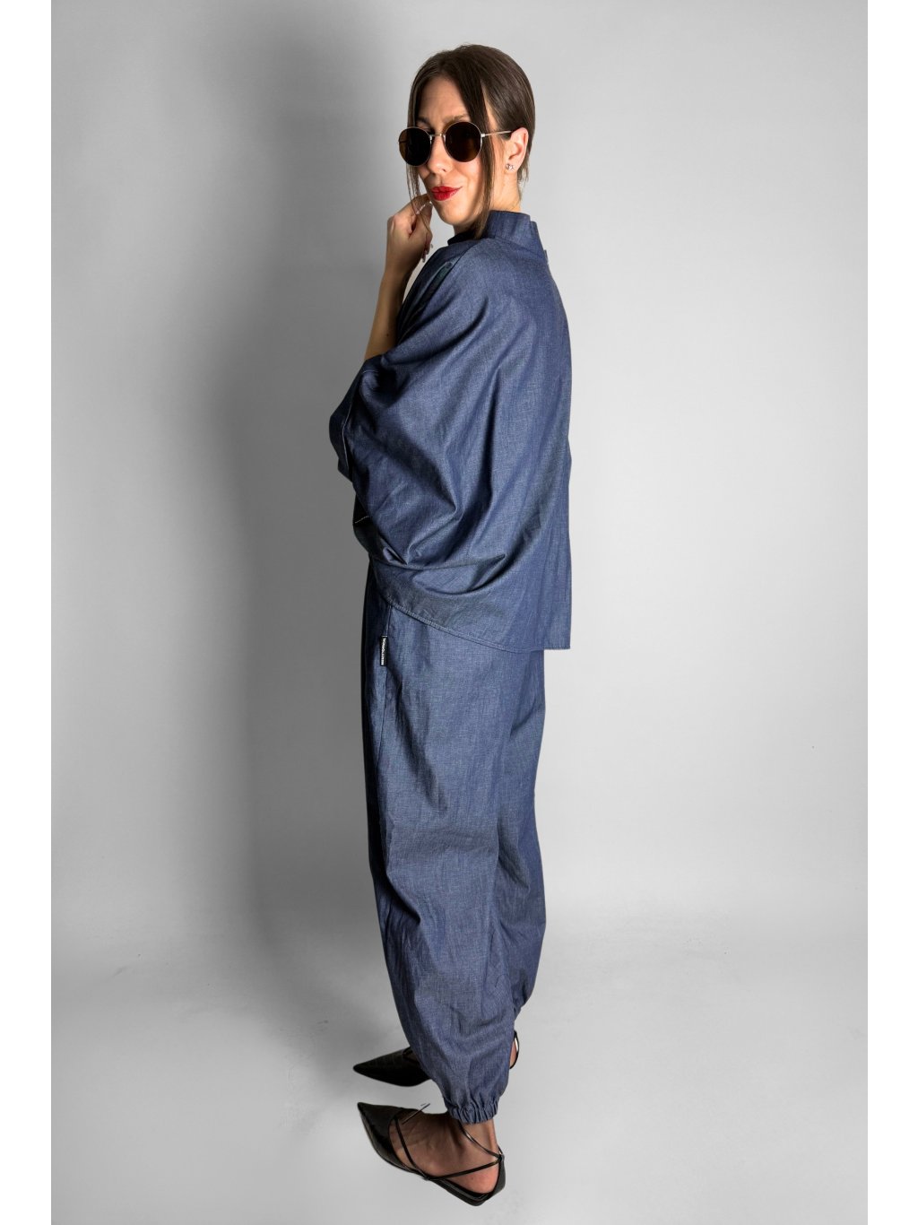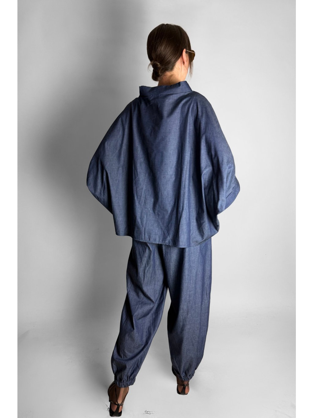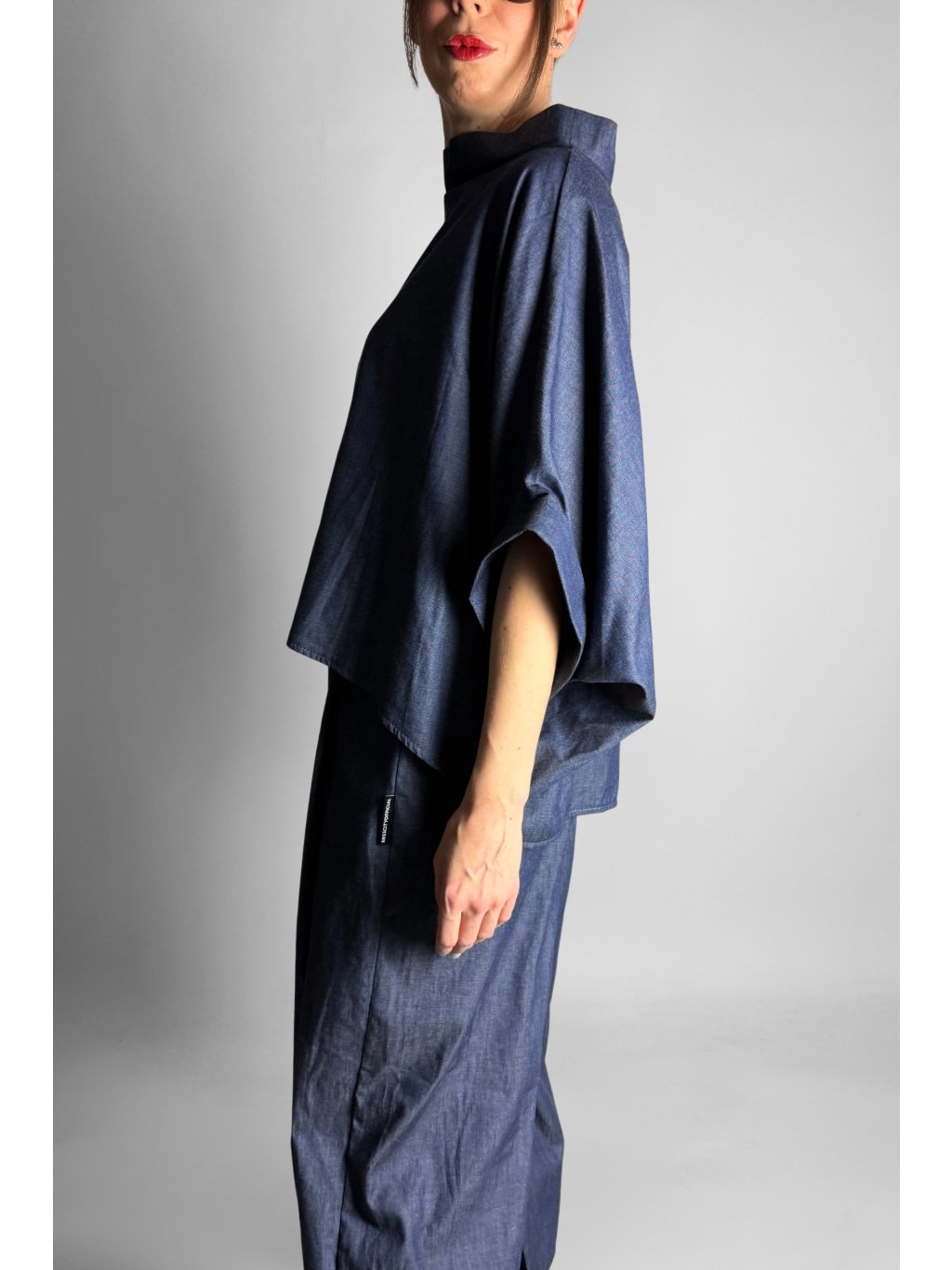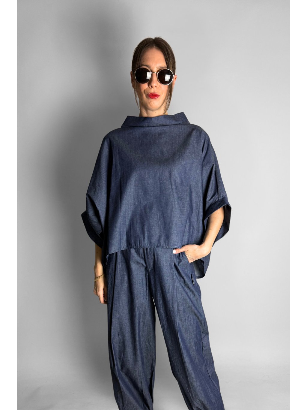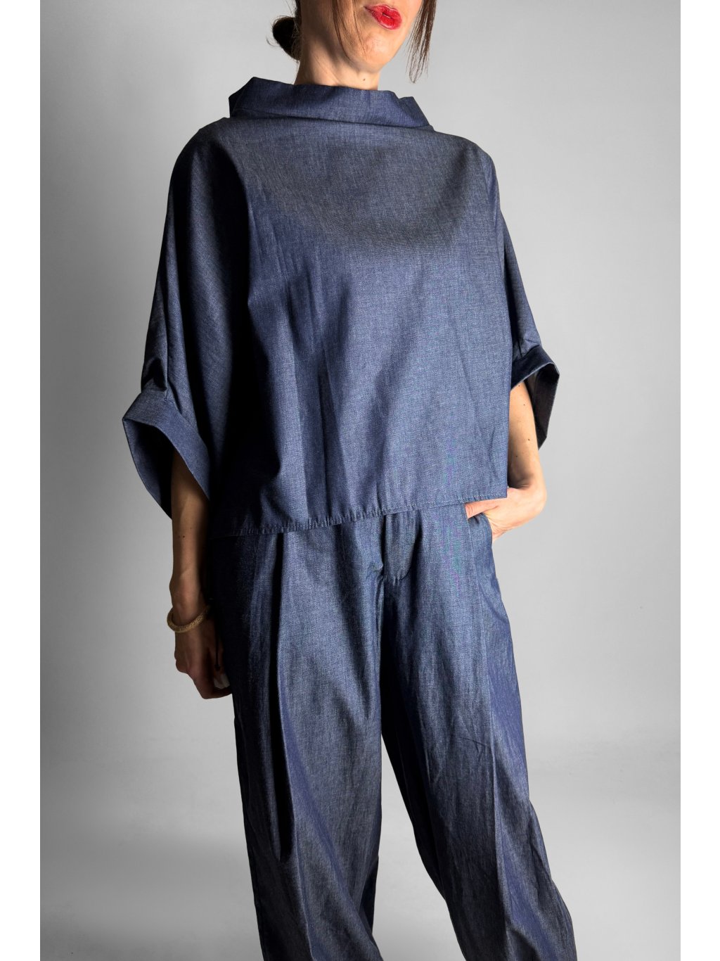Lehká oversize halenka ve stylu kimona z tenké bavlněné látky v tmavém jeansovém vzhledu, ideální pro pohodlné každodenní nošení.