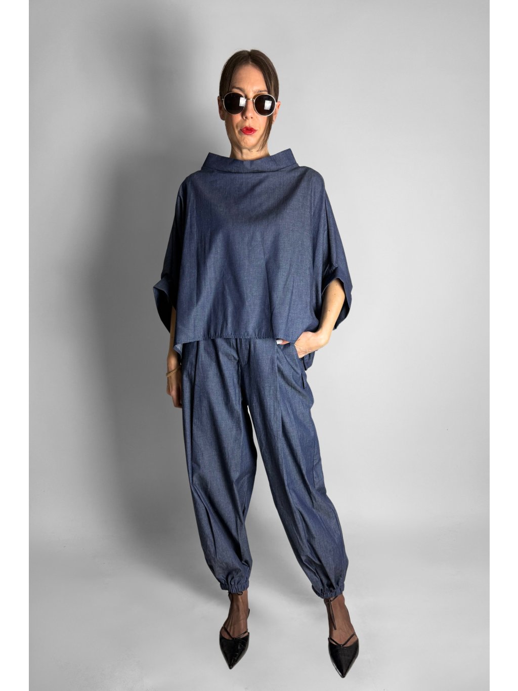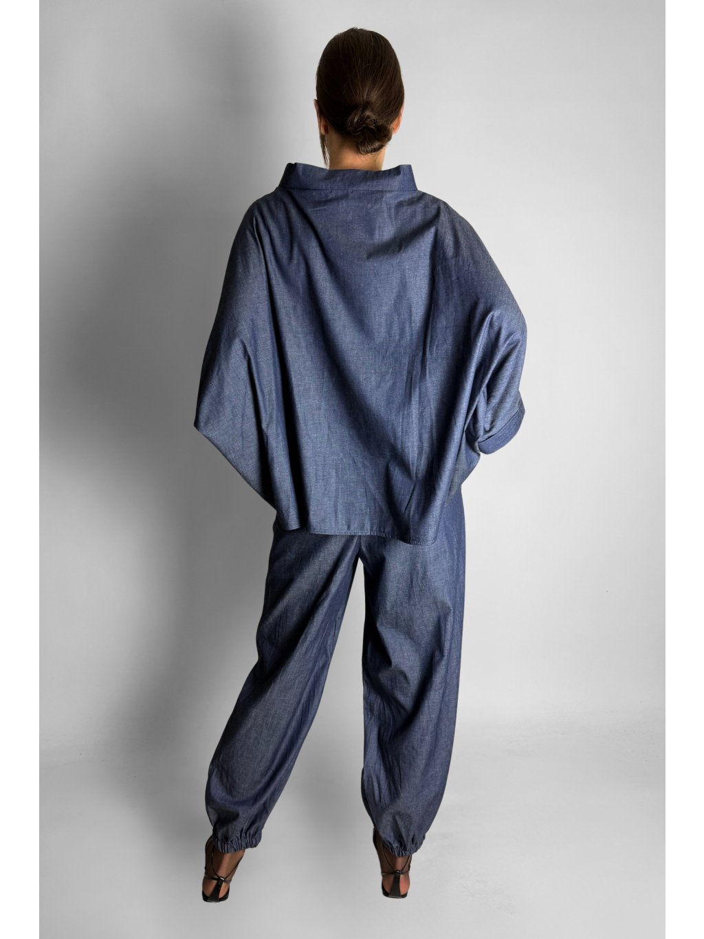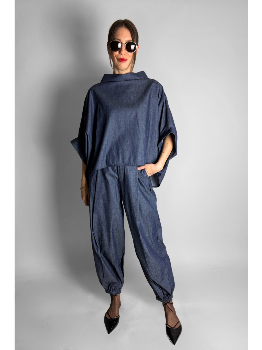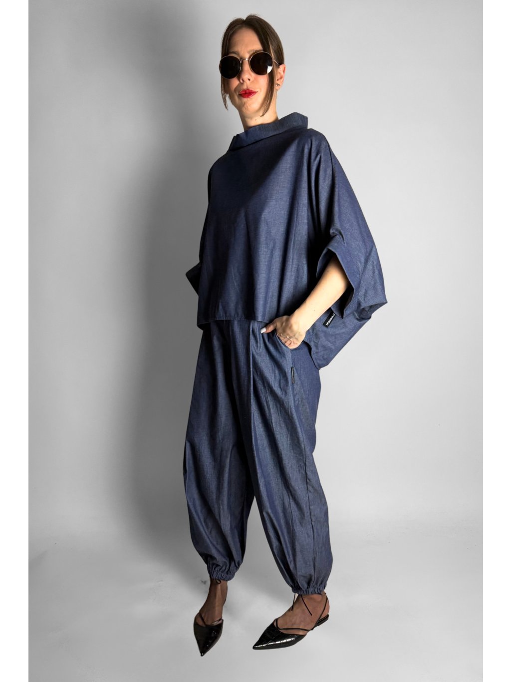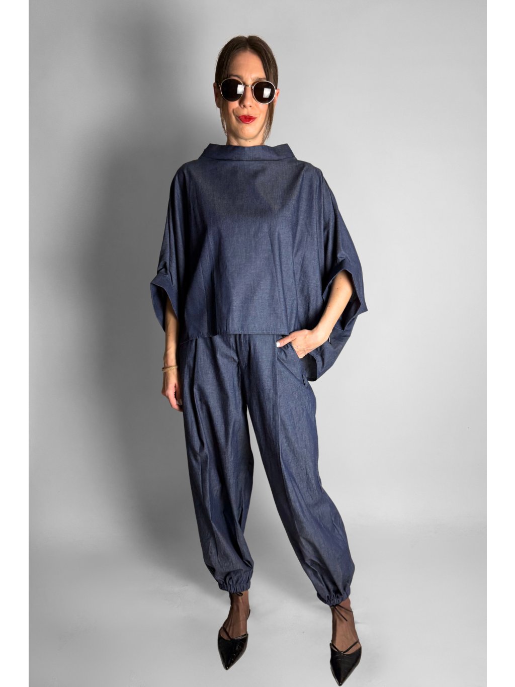 Lehká oversize halenka ve stylu kimona z tenké bavlněné látky v tmavém jeansovém vzhledu, ideální pro pohodlné každodenní nošení.