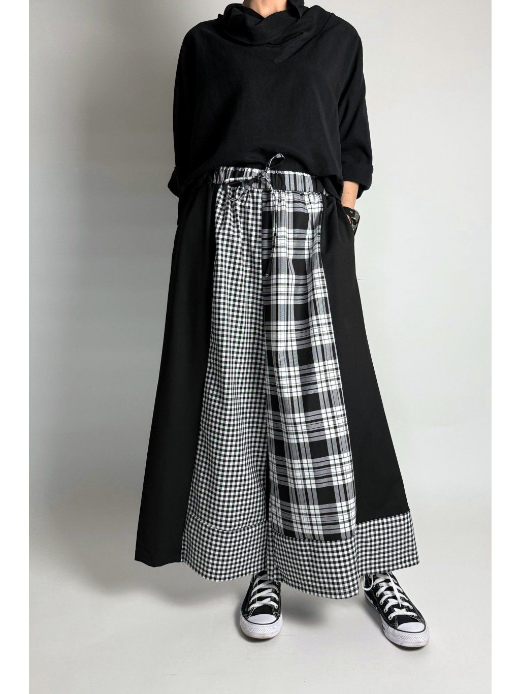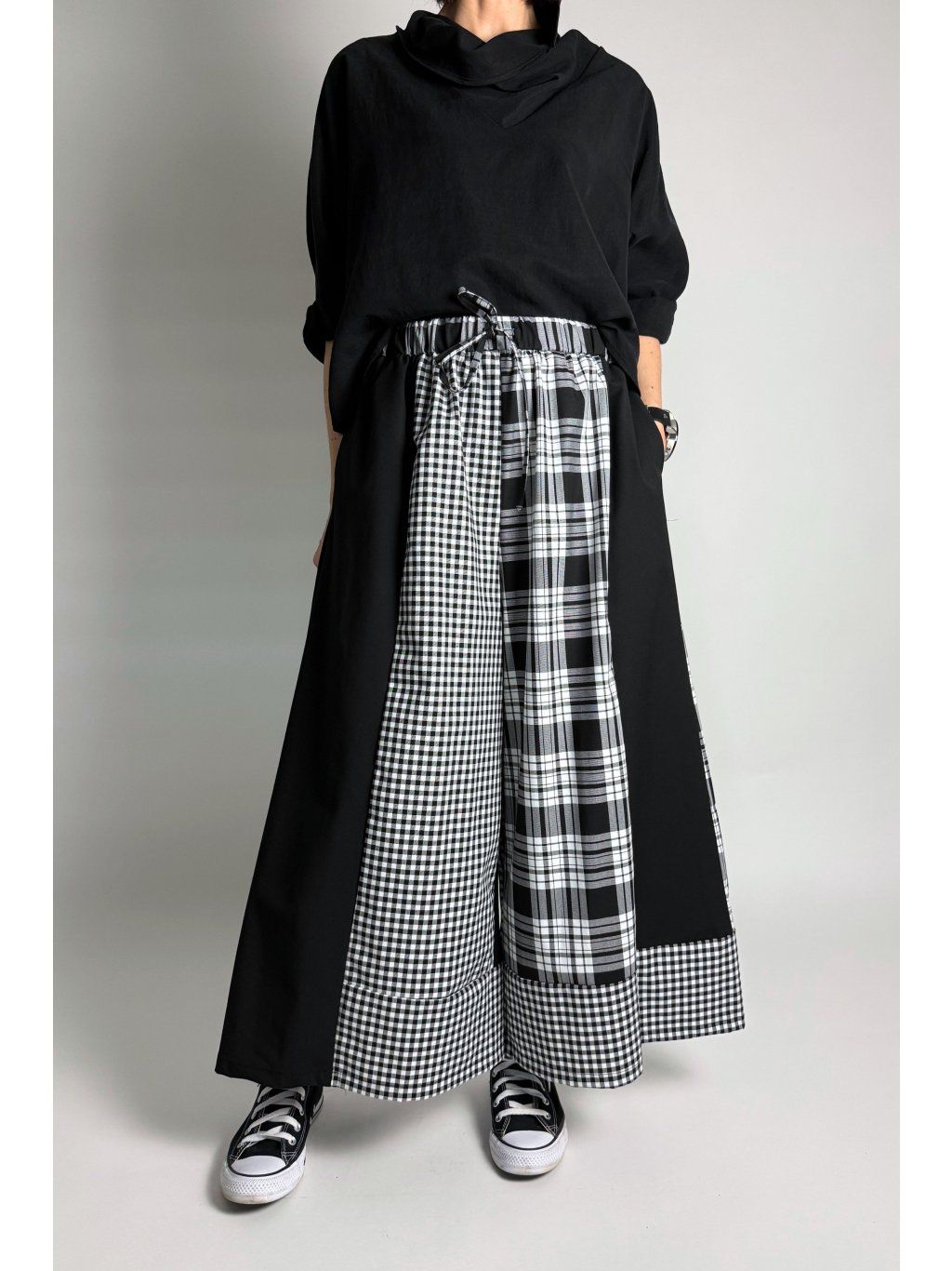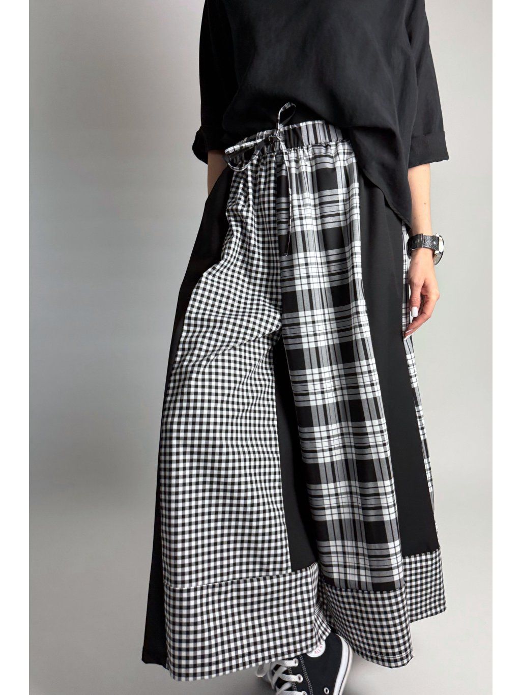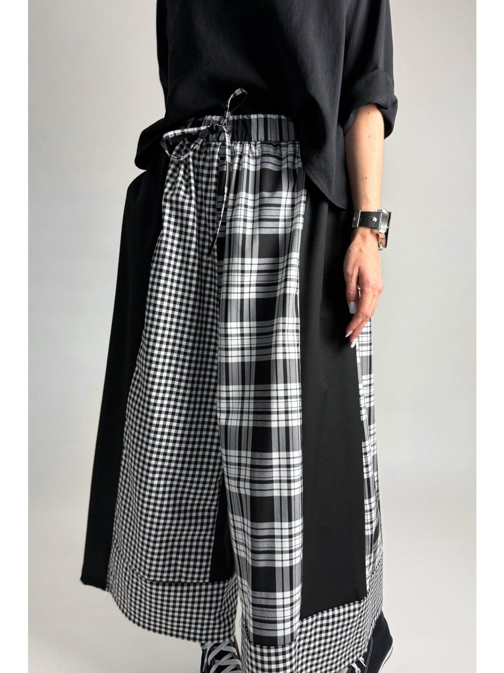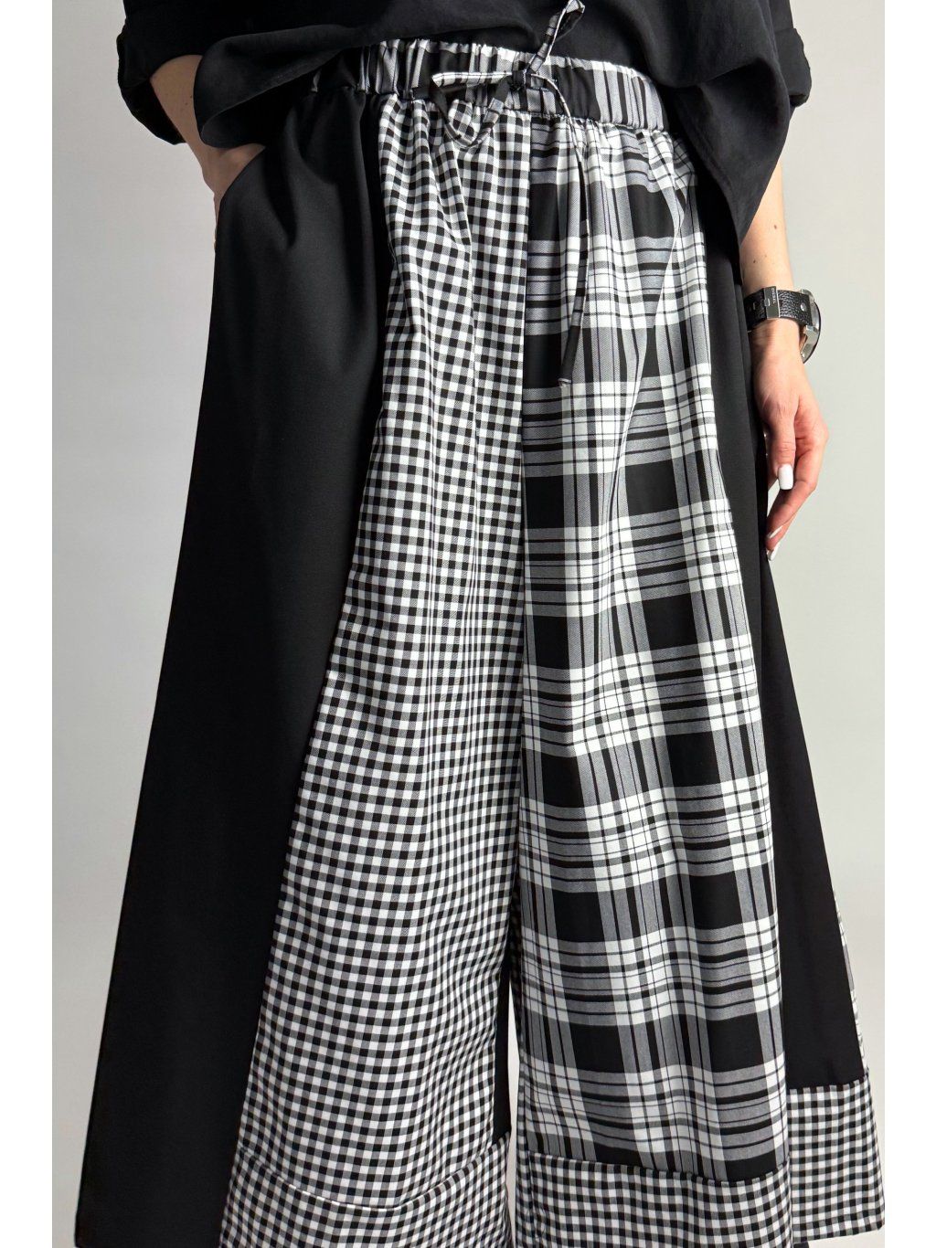 Originální kalhoty kombinované z různých kostkovaných vzorů v odstínech světle šedé, bílé a černé. Každá část kalhot je z jiného vzoru, což vytváří výrazný a jedinečný vzhled.