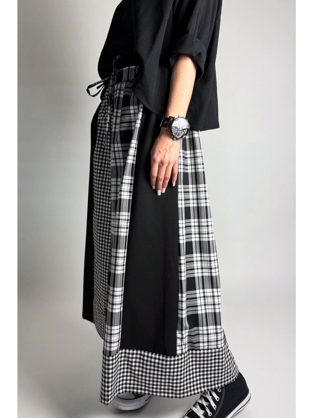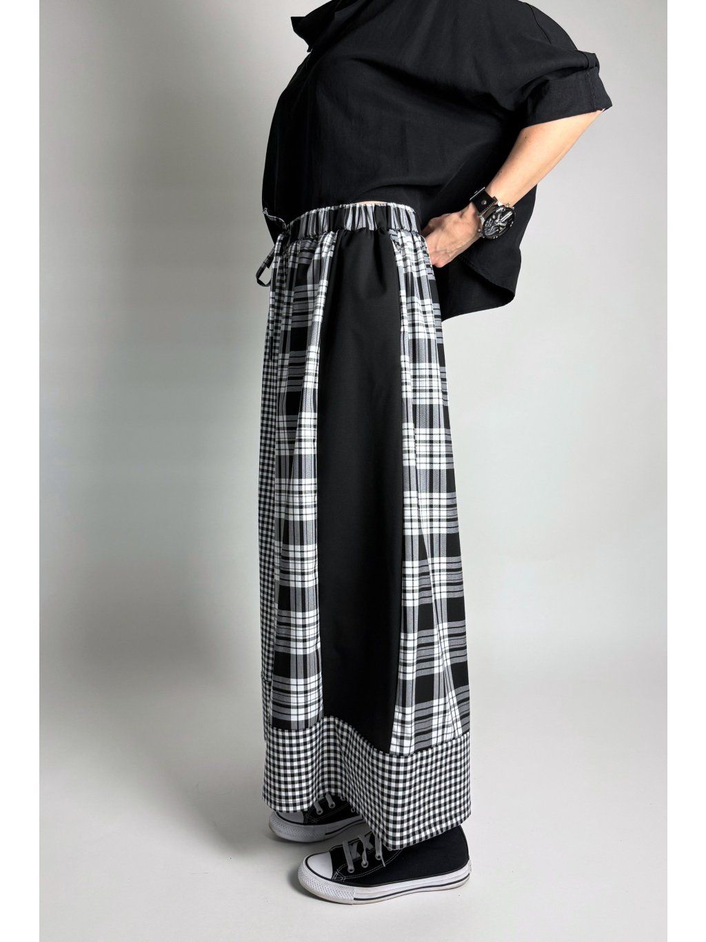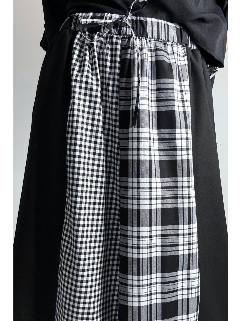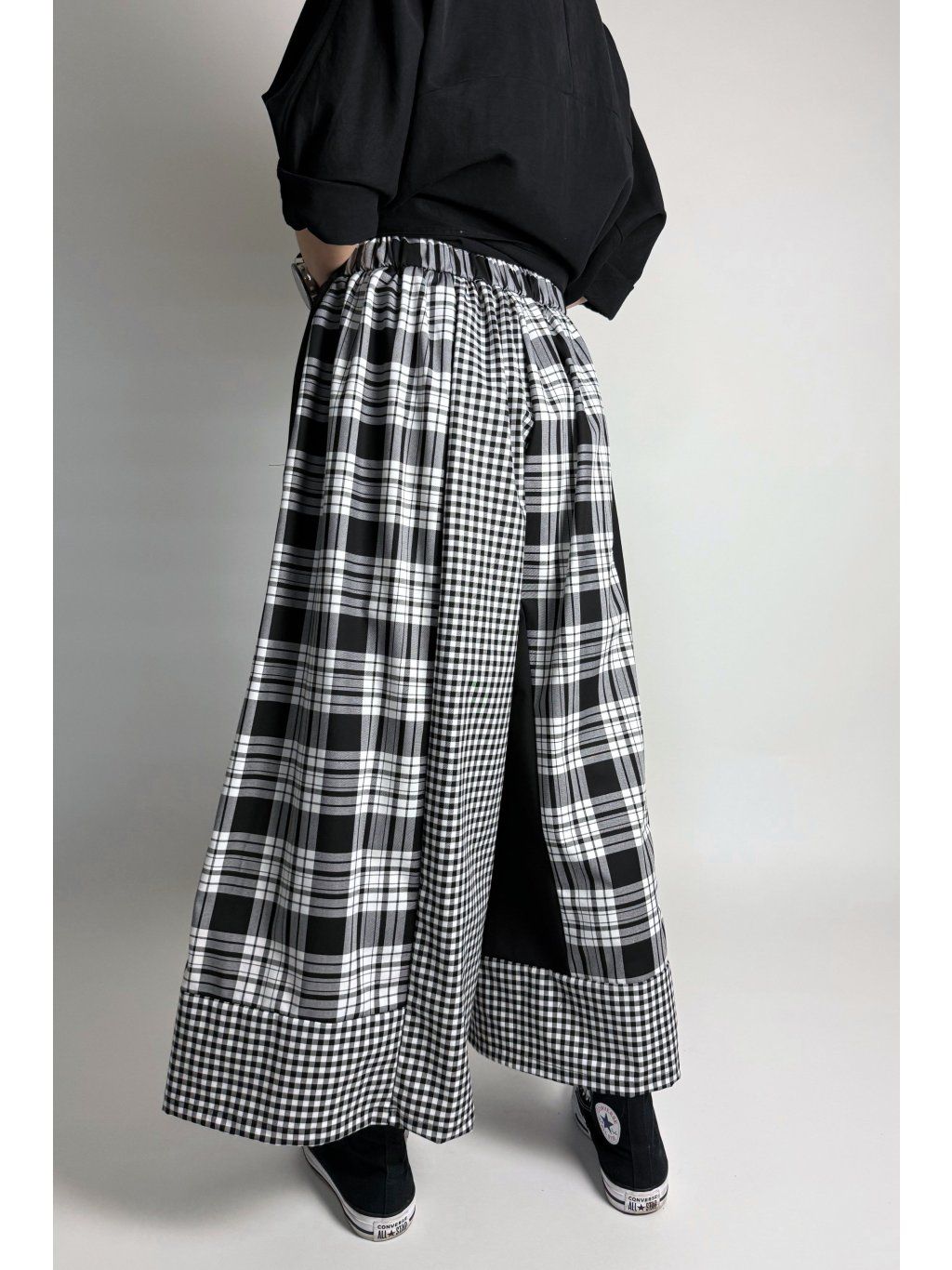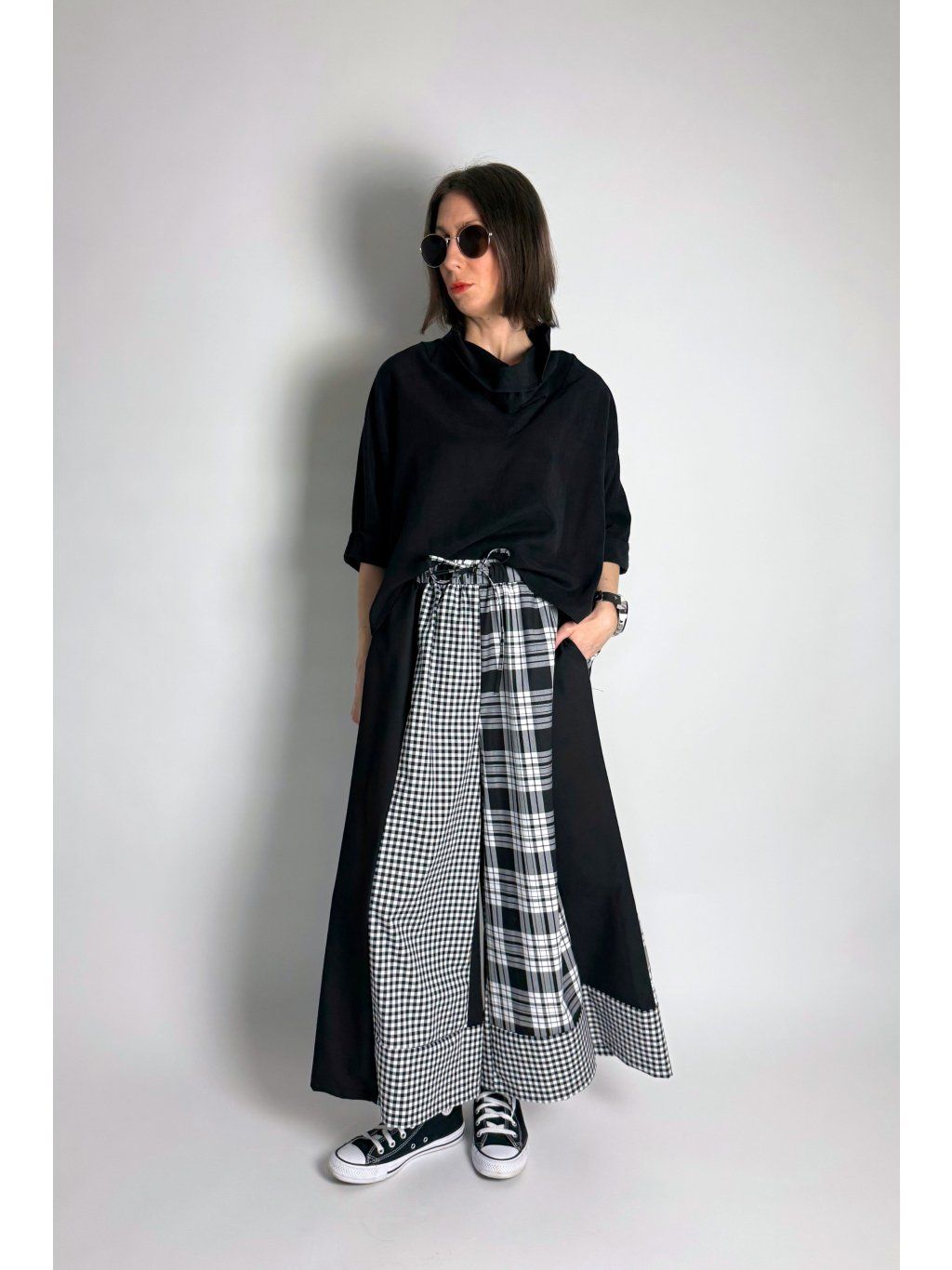 Originální kalhoty kombinované z různých kostkovaných vzorů v odstínech světle šedé, bílé a černé. Každá část kalhot je z jiného vzoru, což vytváří výrazný a jedinečný vzhled.