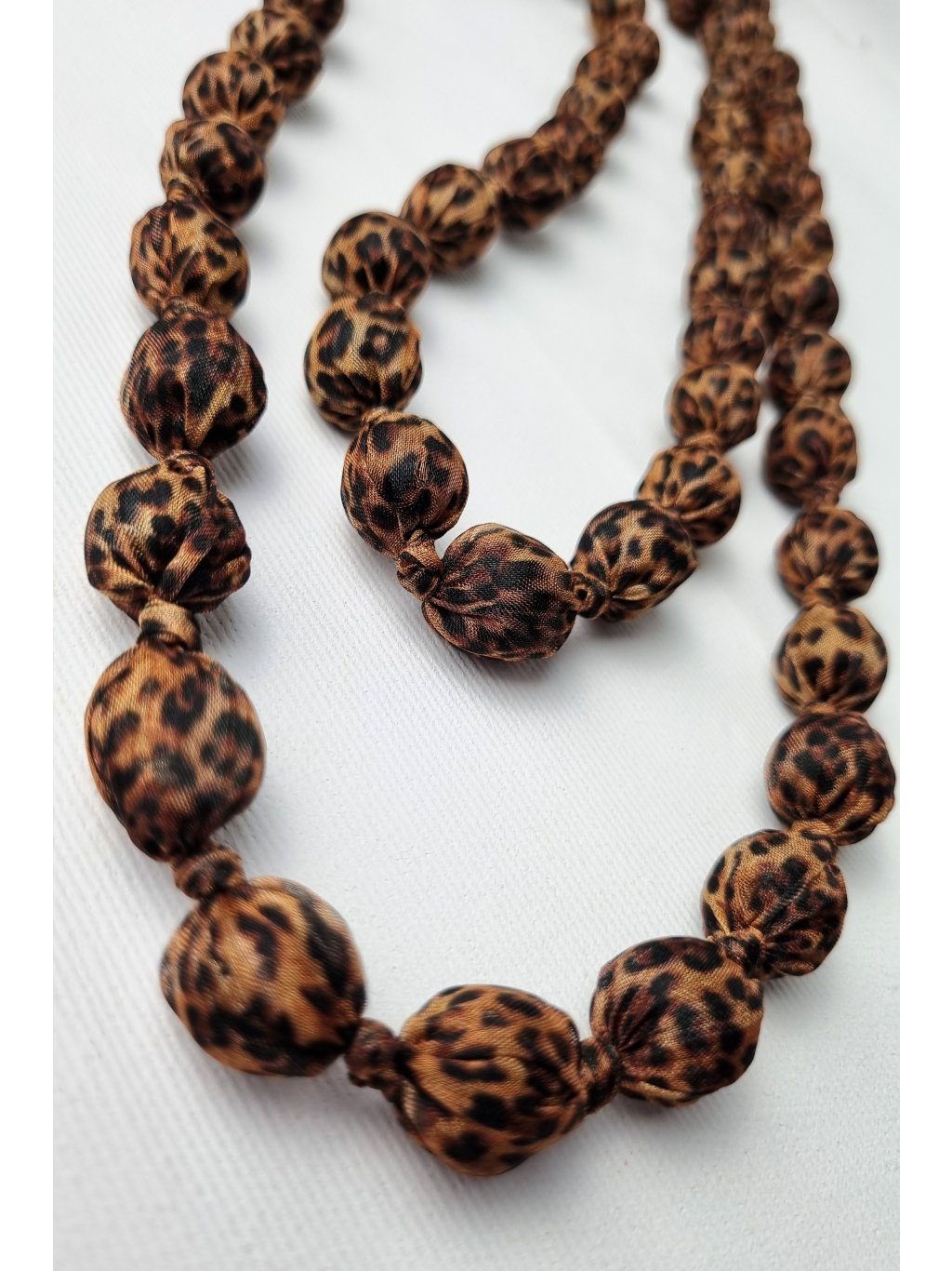 Korálky jsou vloženy v tenkém leopardím látkovém vaku, kde každá korálka je zajištěna drobným uzlem. Tento detail zajišťuje pevné uchycení korálků a zároveň umožňuje flexibilní a přirozený pohyb náhrdelníku.
