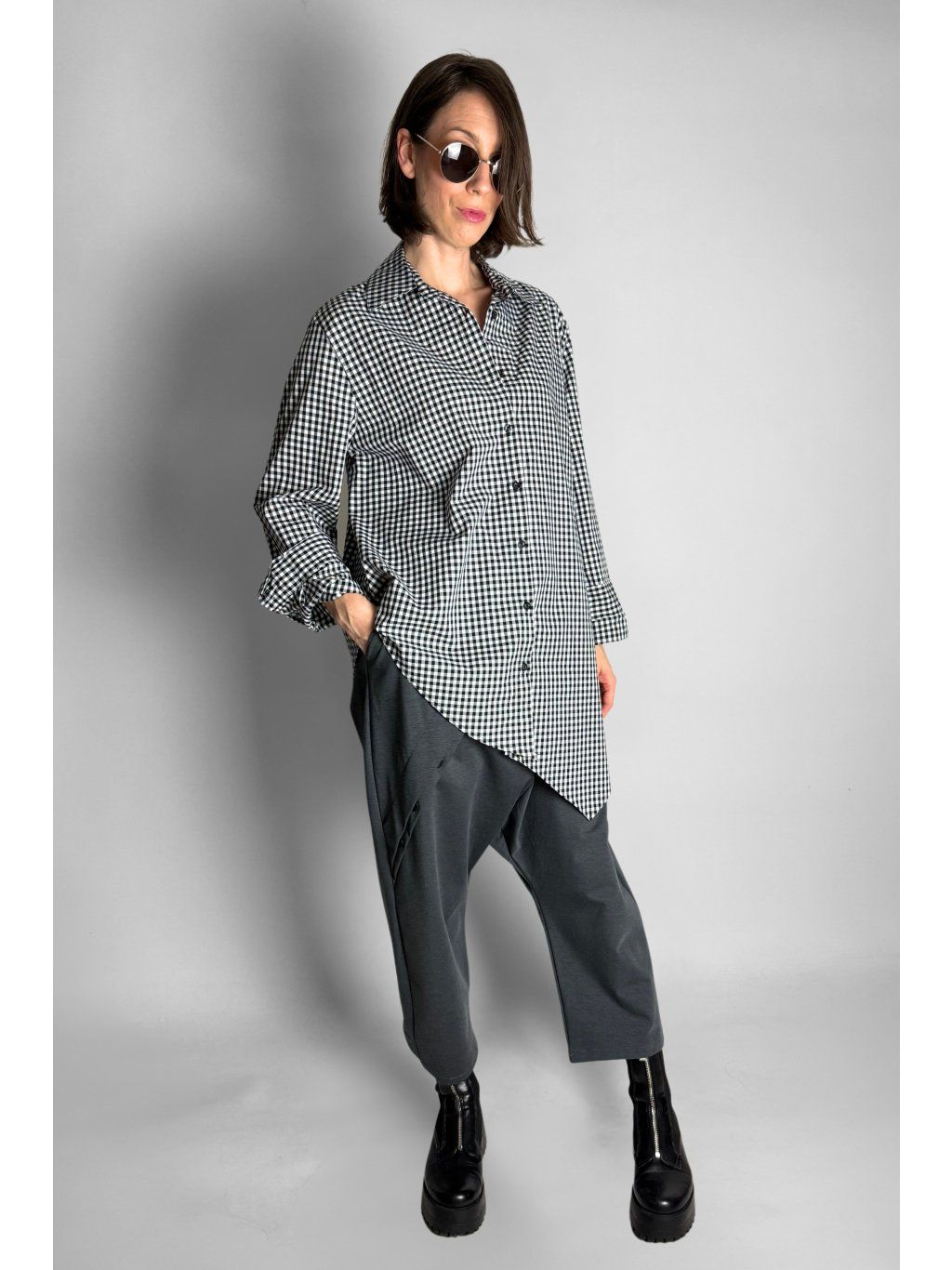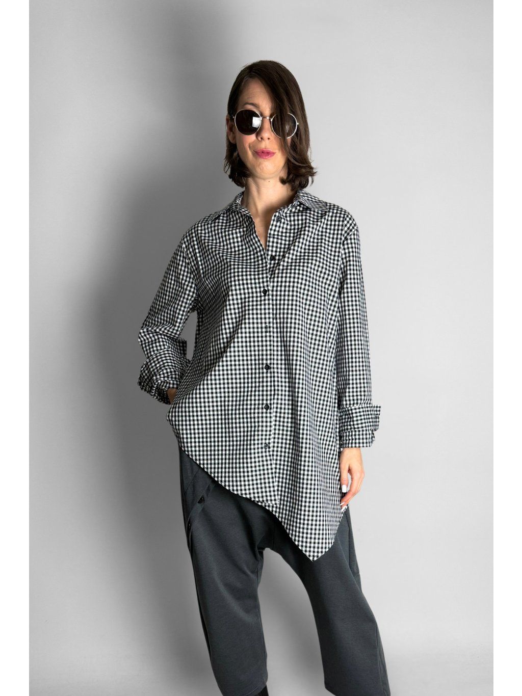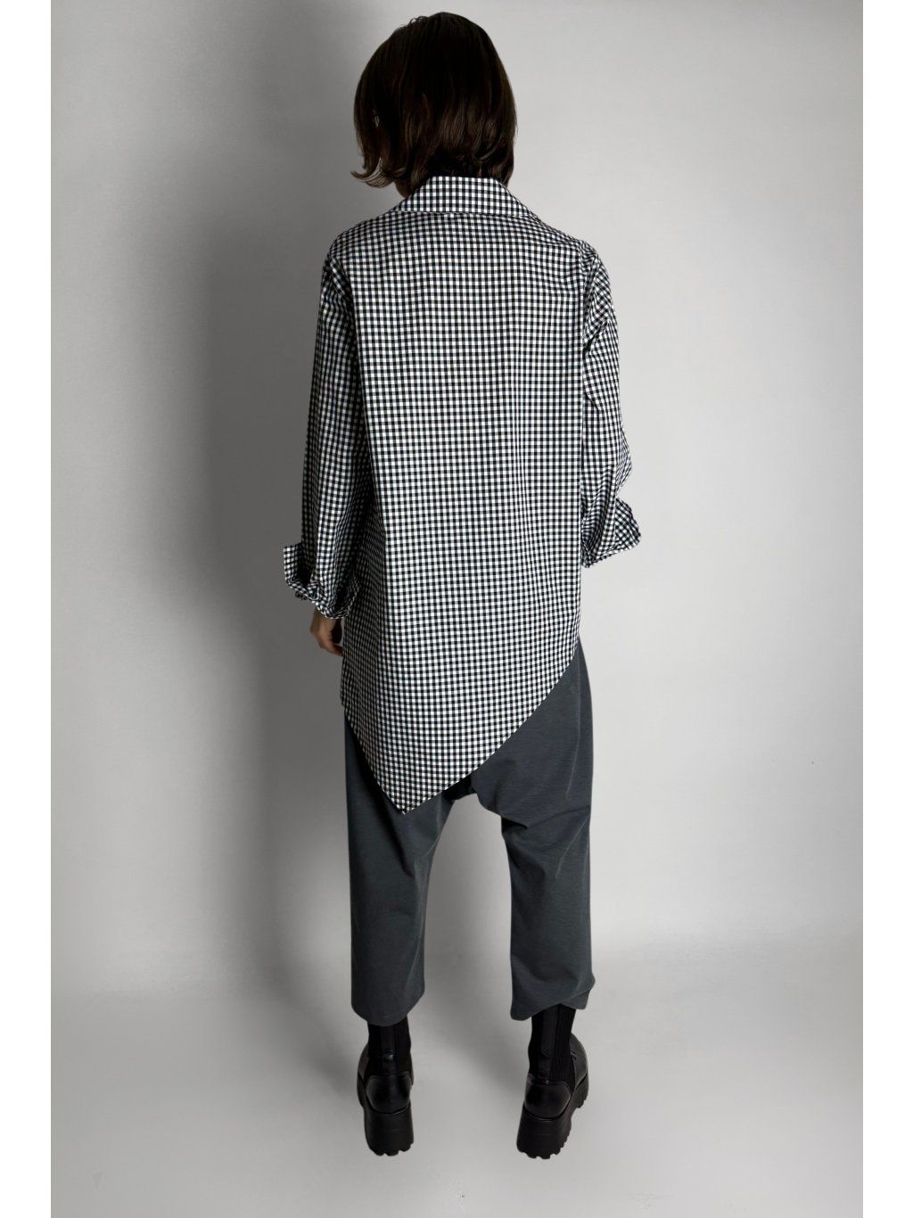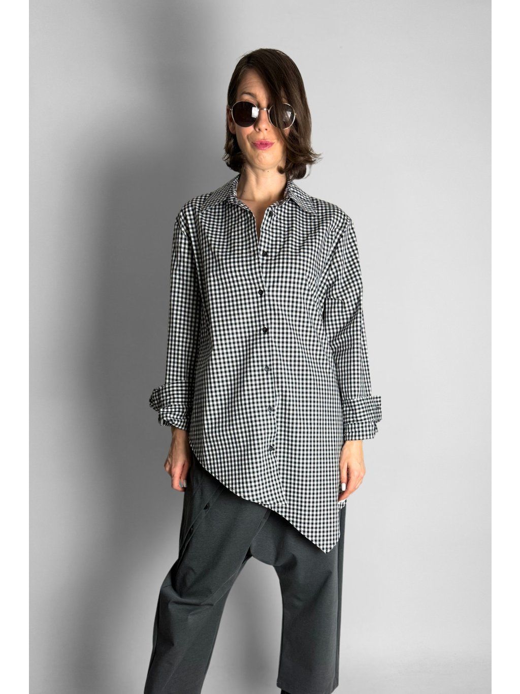 Dlouhá asymetrická košile s kostkovaným vzorem v kombinaci bílé, černé a šedé barvy.