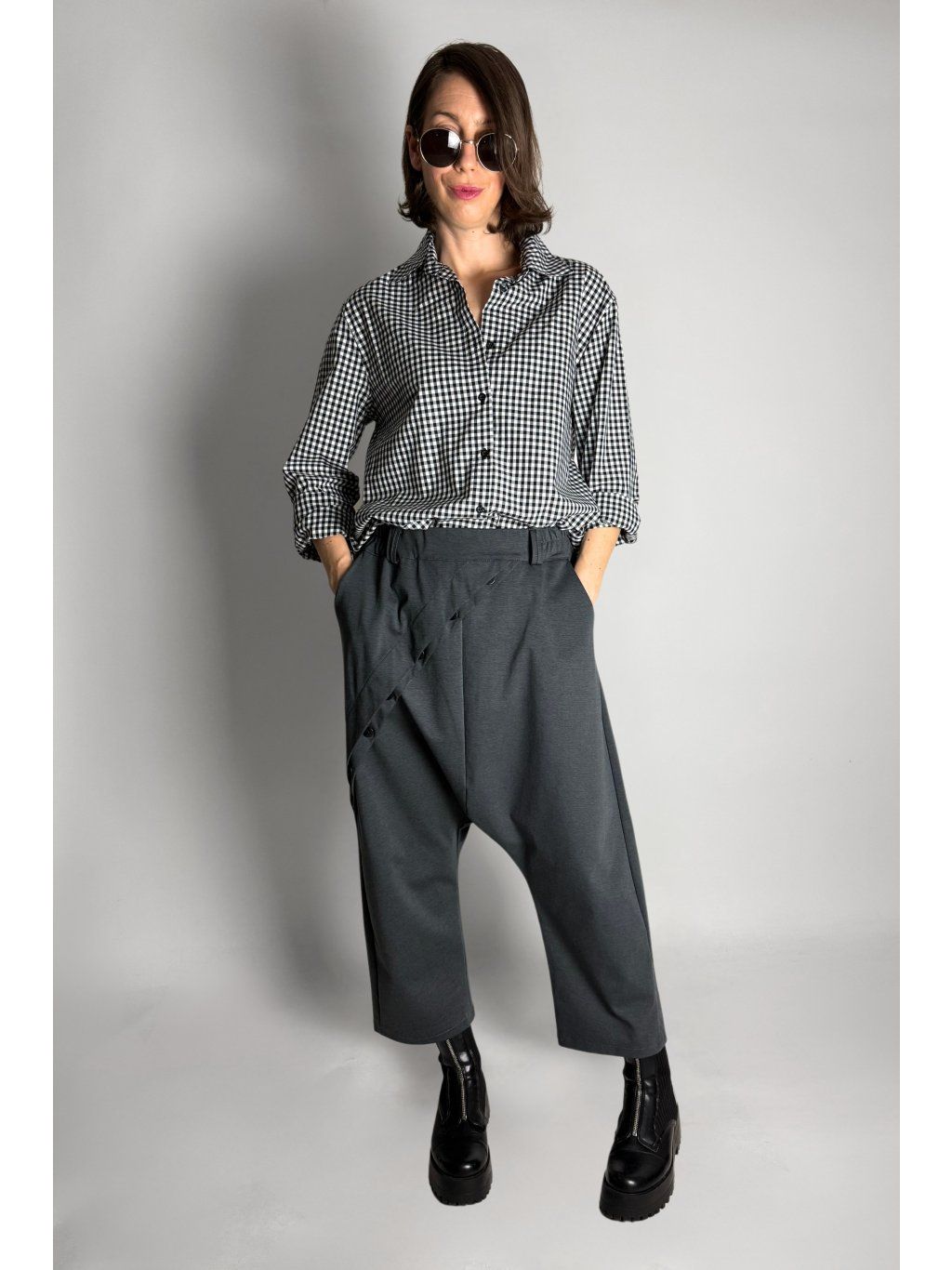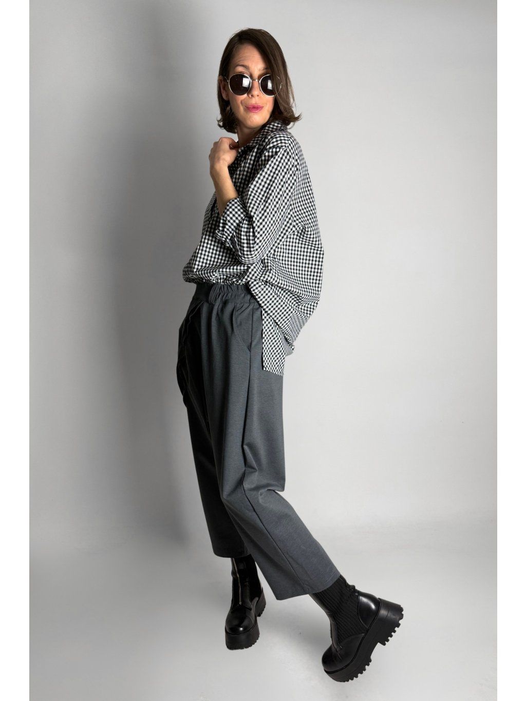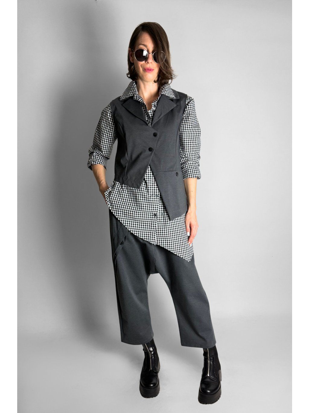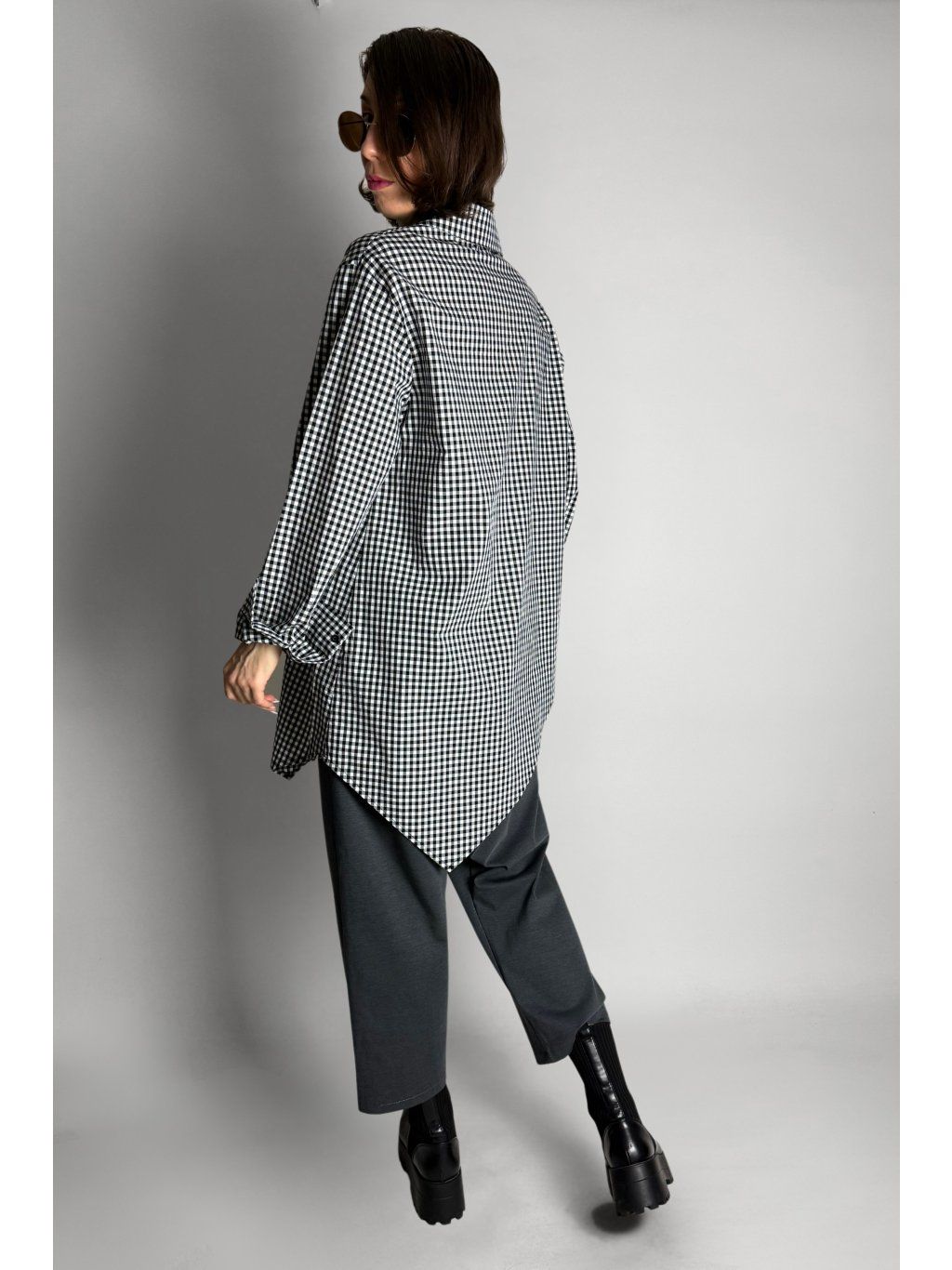 Dlouhá asymetrická košile s kostkovaným vzorem v kombinaci bílé, černé a šedé barvy.