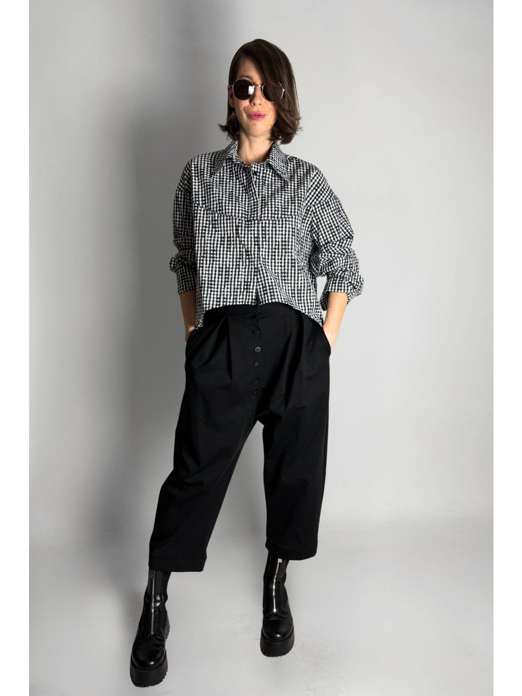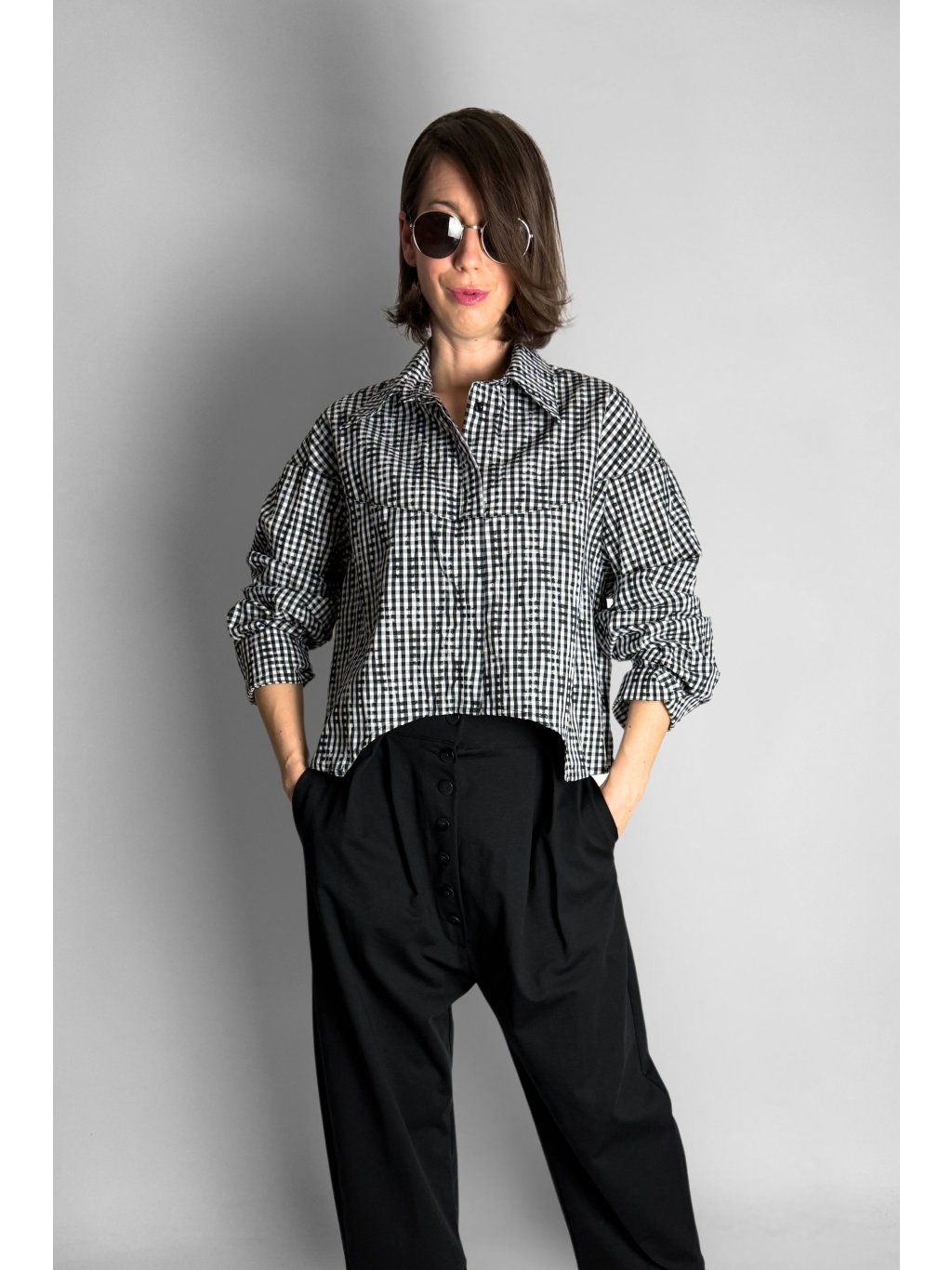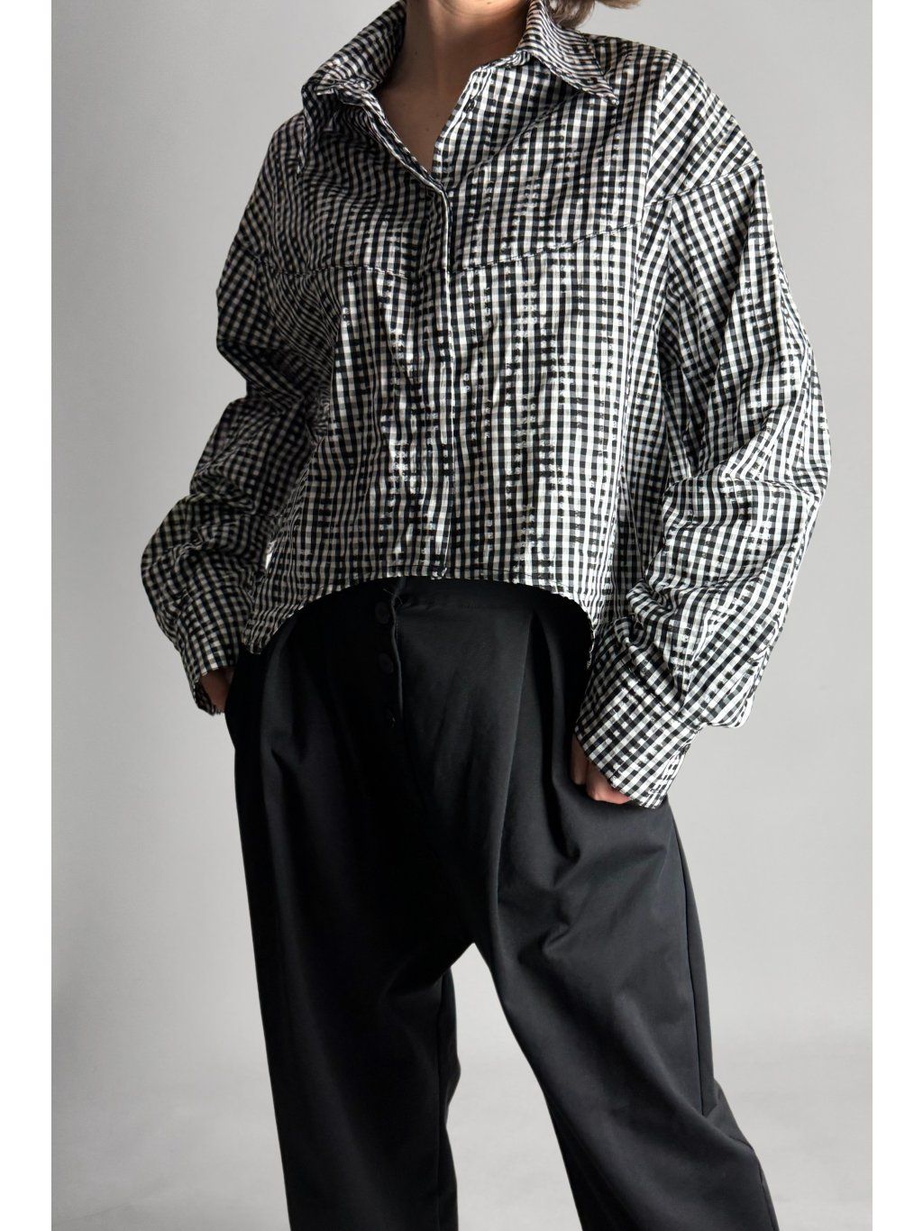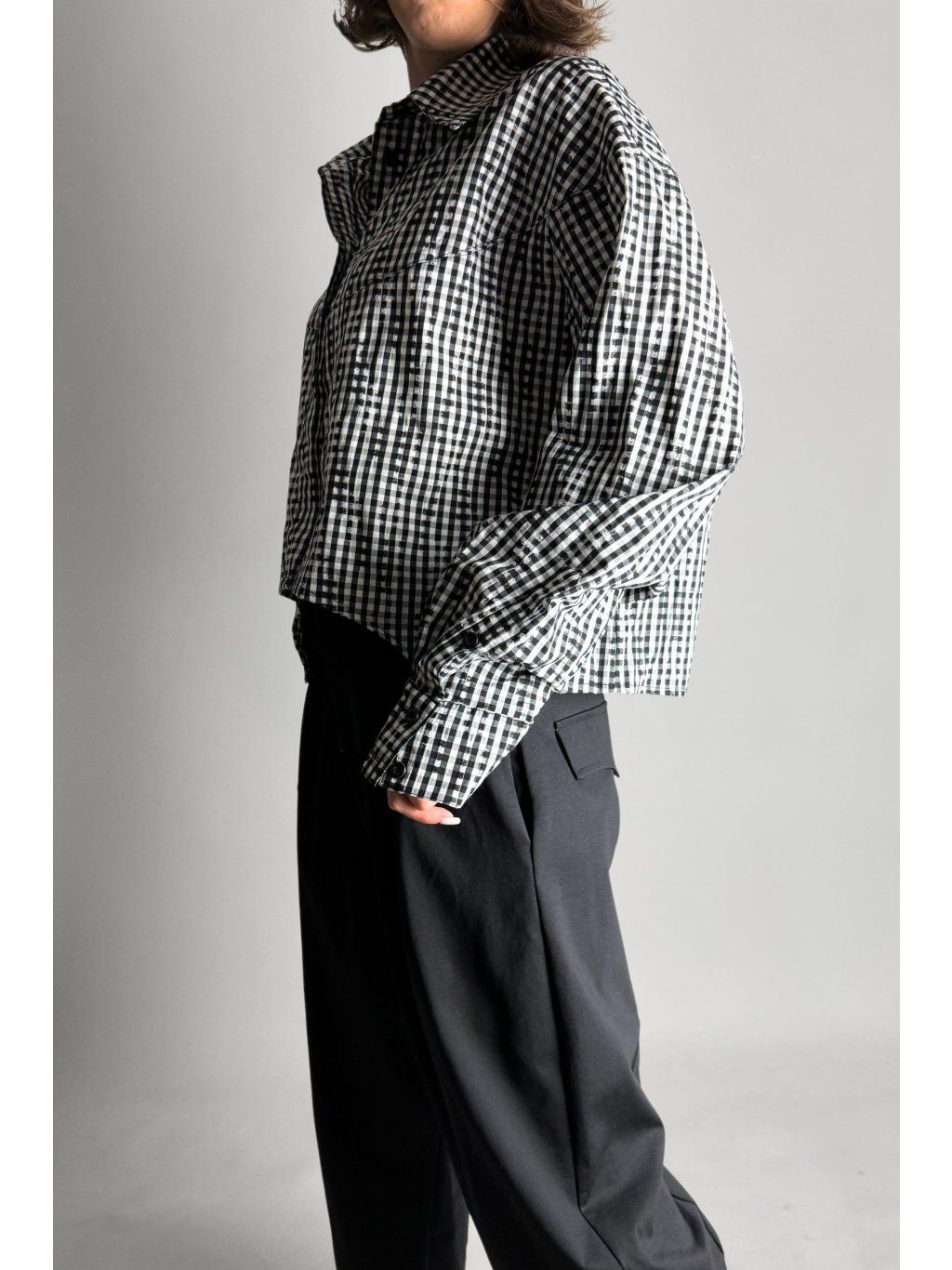 Kostkovaná crop košile se čtvercovým střihem a spadlými rameny. Má klasický límec a zapínání na knoflíky, které jsou skryté pod klopou.
