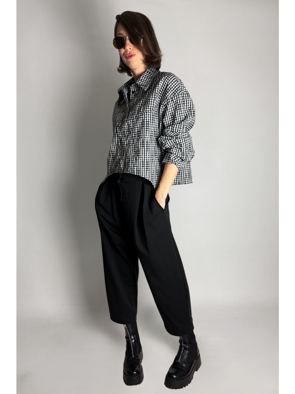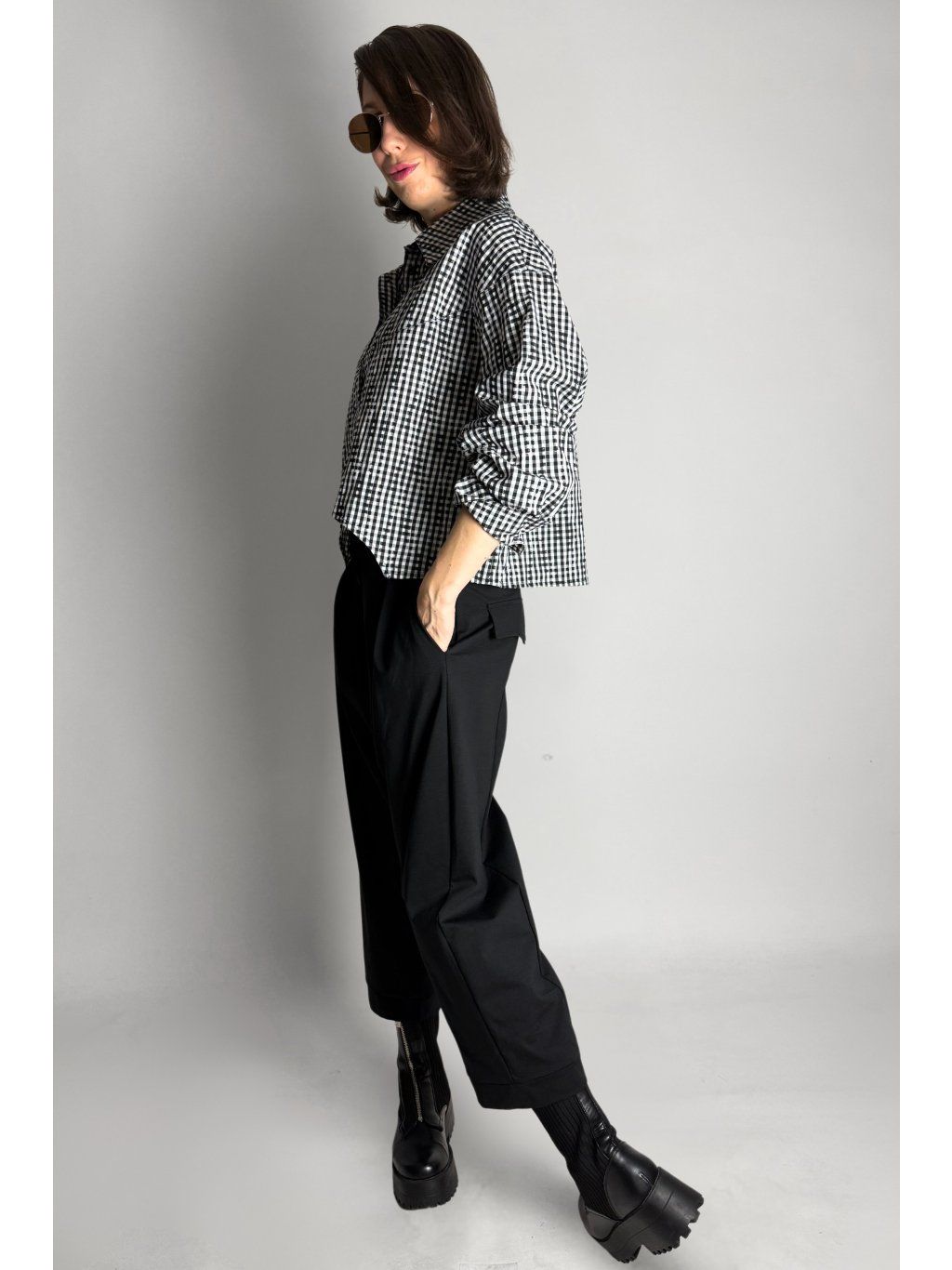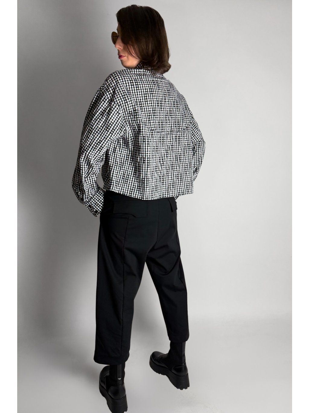 Kostkovaná crop košile se čtvercovým střihem a spadlými rameny. Má klasický límec a zapínání na knoflíky, které jsou skryté pod klopou.