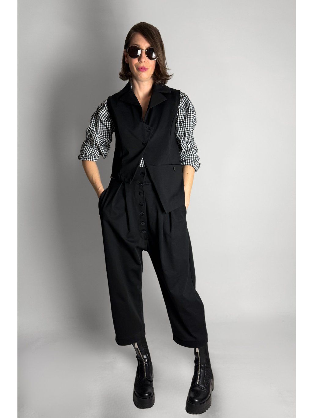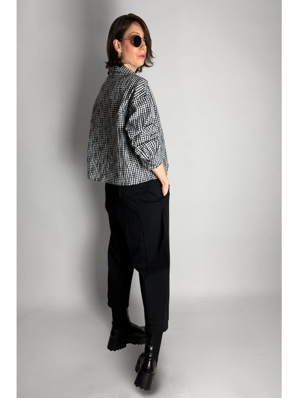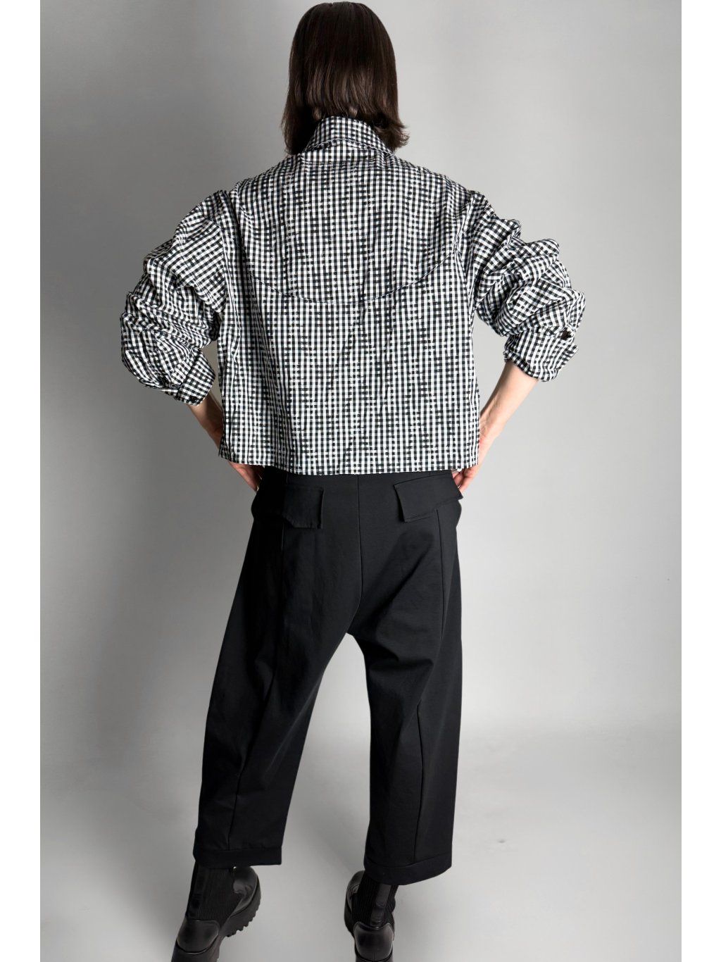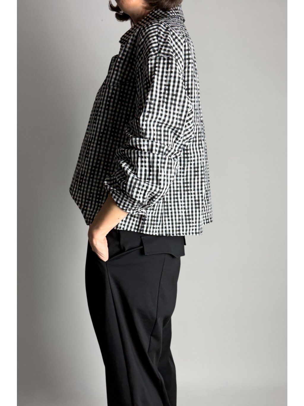 Kostkovaná crop košile se čtvercovým střihem a spadlými rameny. Má klasický límec a zapínání na knoflíky, které jsou skryté pod klopou.