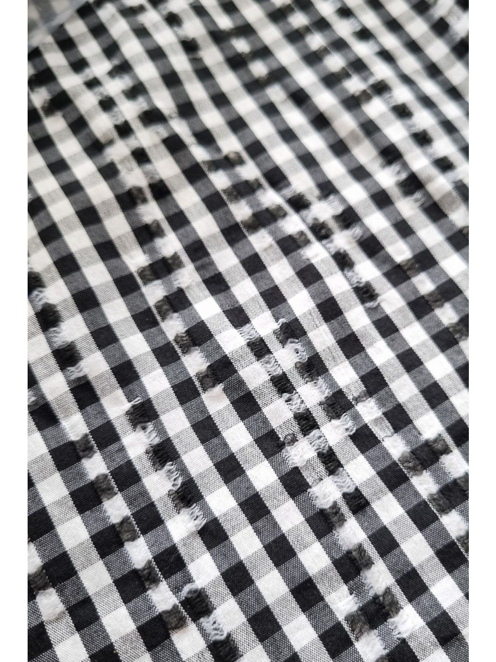Vzor tvoří jemné čtverečky v šedo-černo-bílé kombinaci s narušeným efektem.