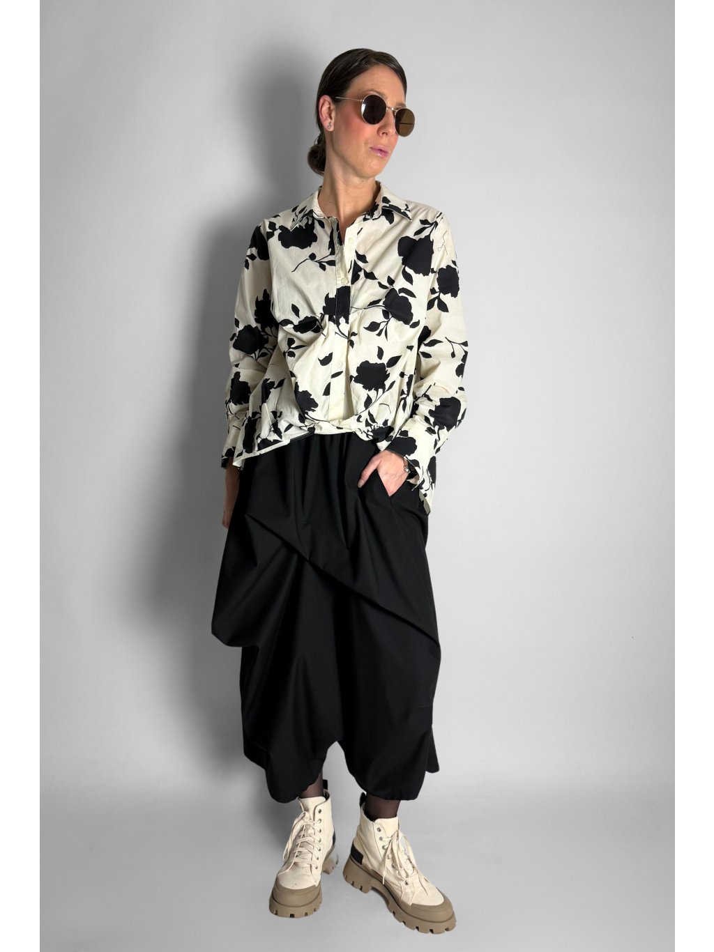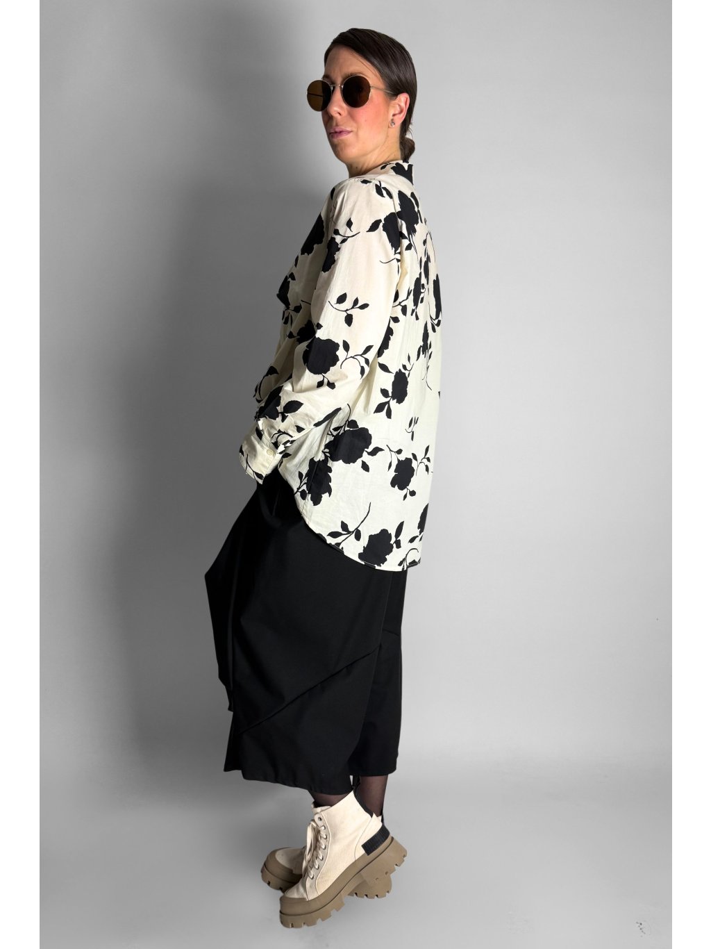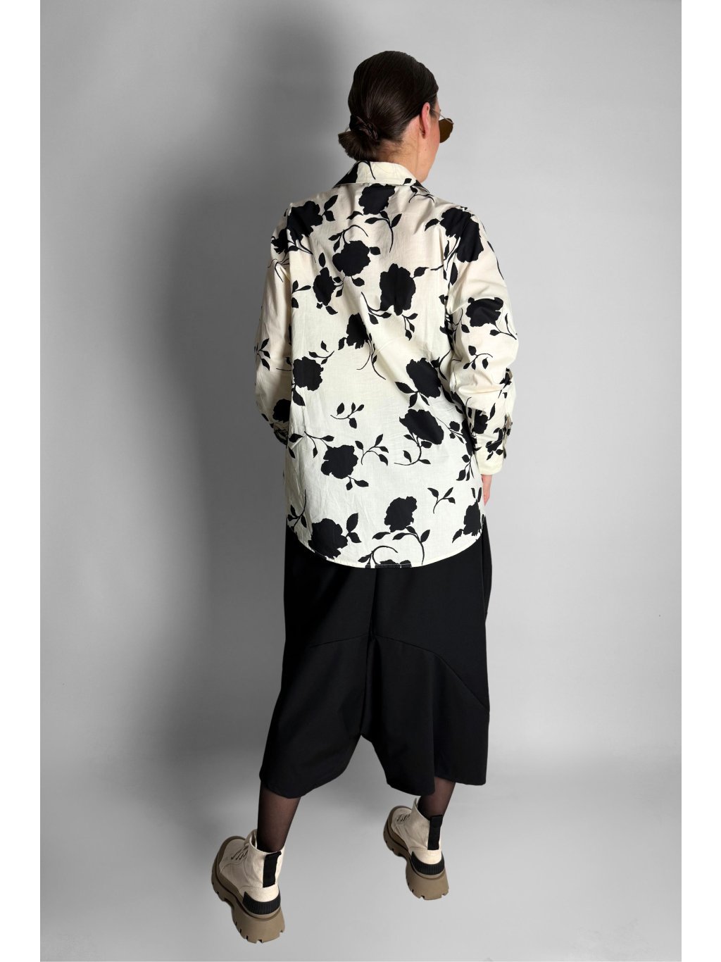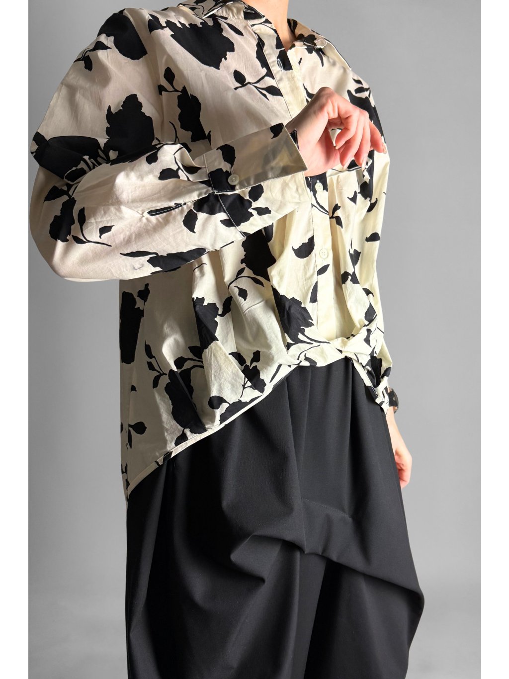 Košile s řaseným spodním lemem Crema / Black Flowers