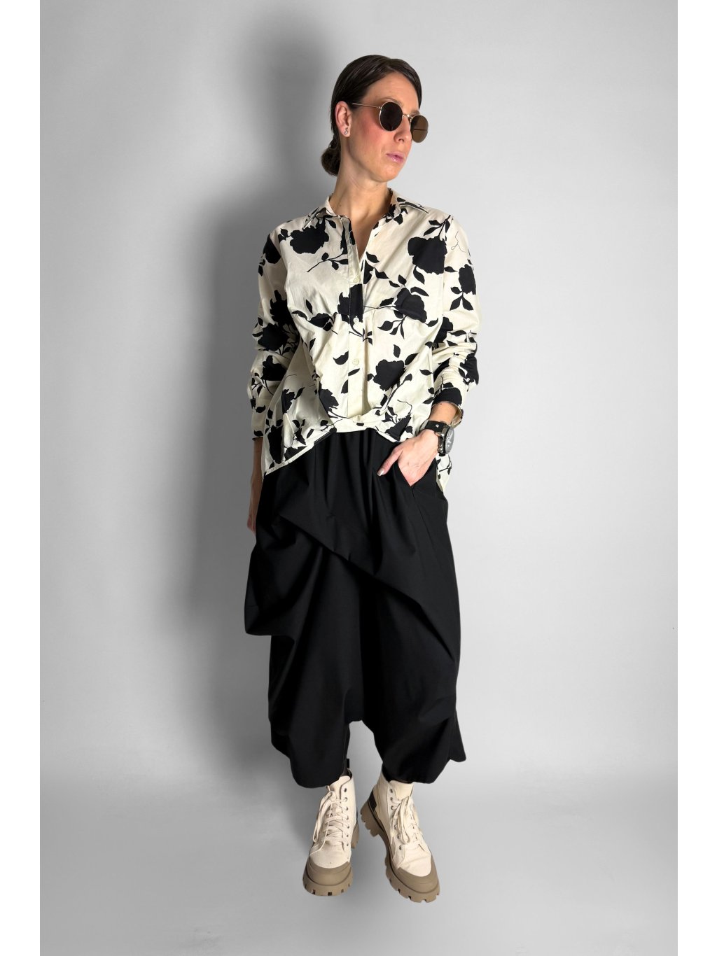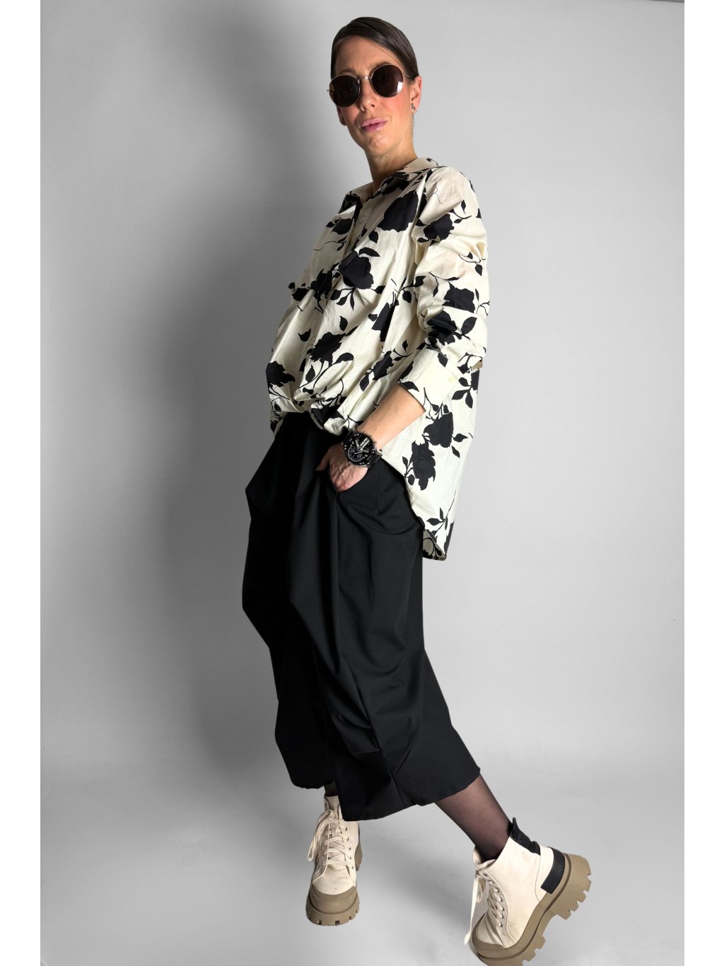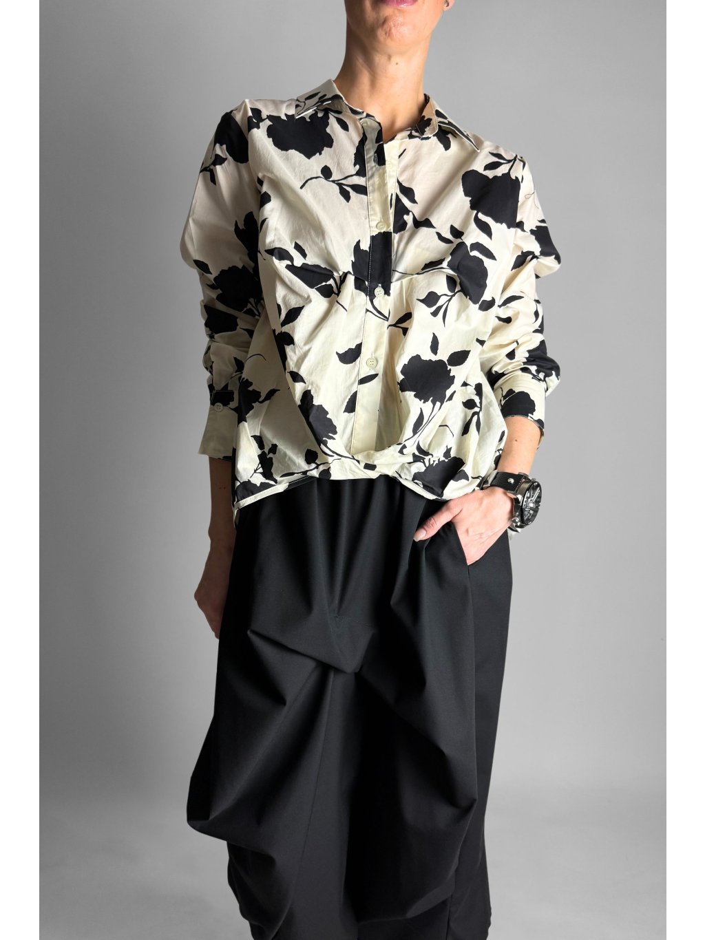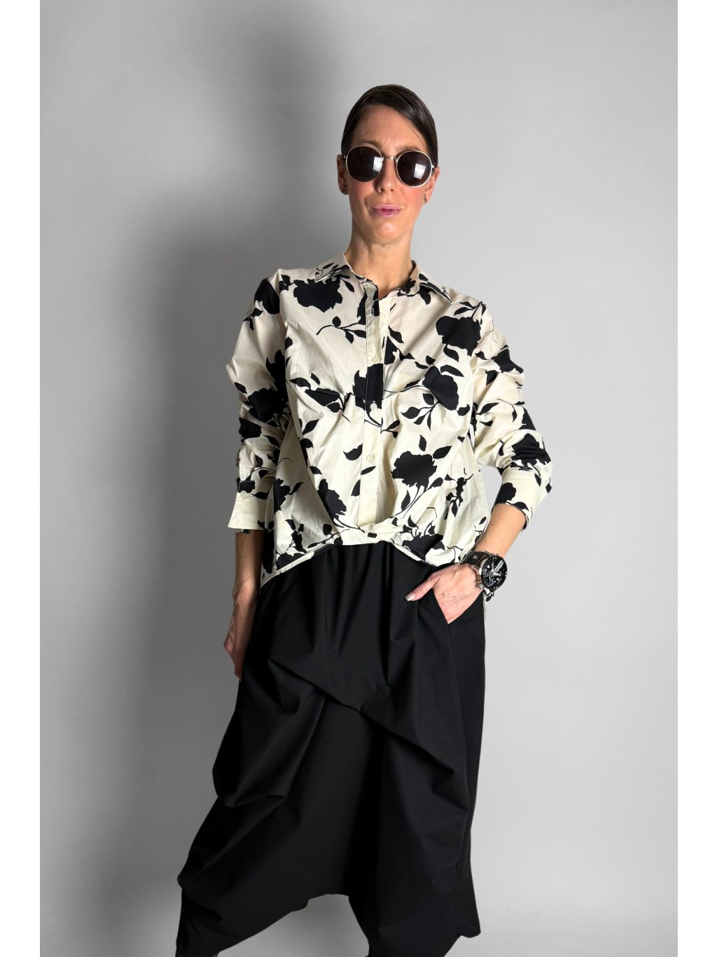 Košile s řaseným spodním lemem Crema / Black Flowers