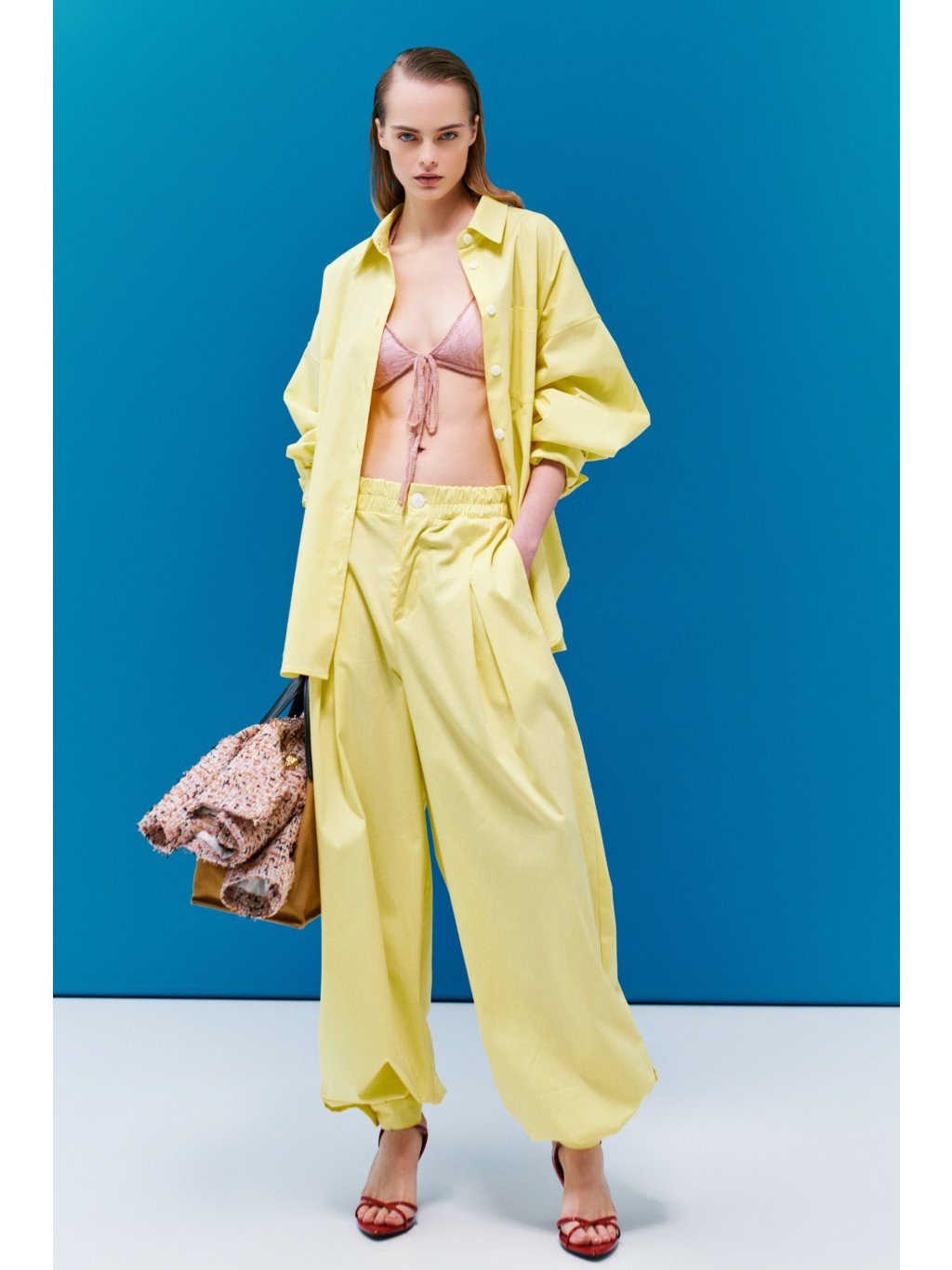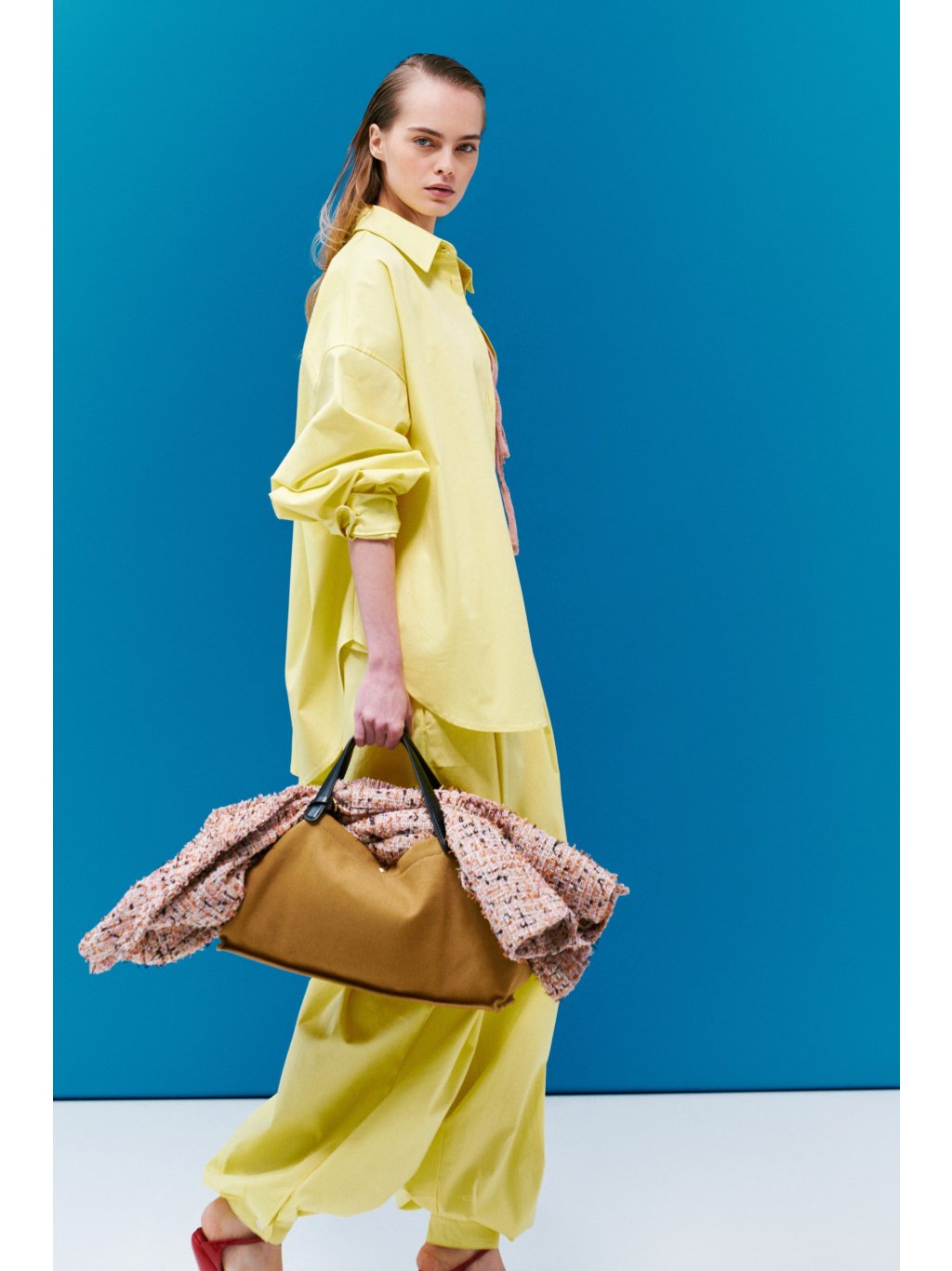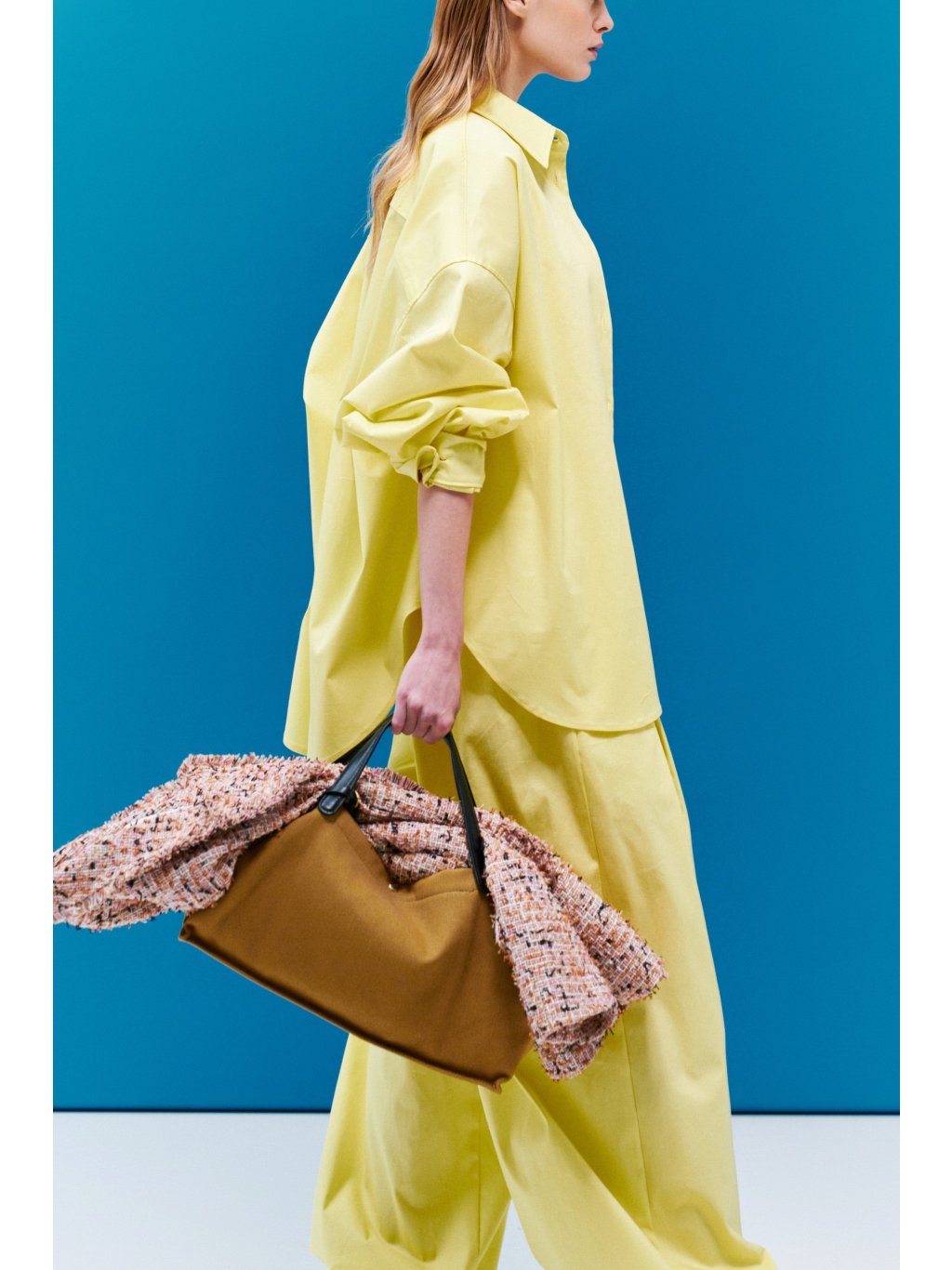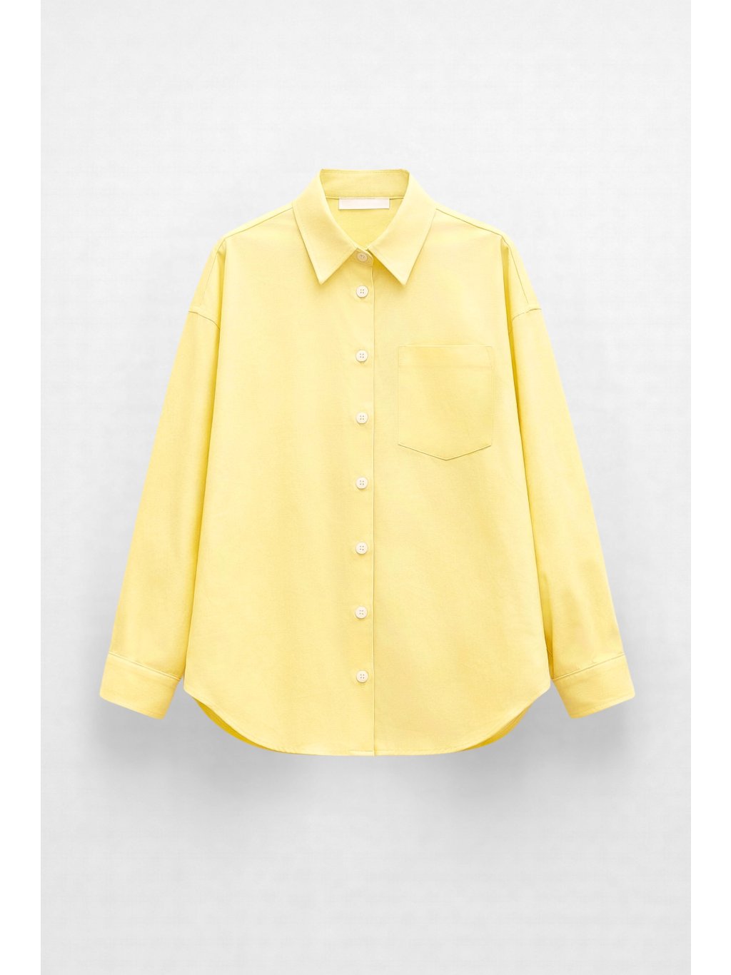 Elegantní žlutá košile vyrobená z velmi kvalitní a pevné bavlny s mírným podílem elastanu. Materiál je strukturovaný a natolik pevný, že košile působí téměř jako lehká bunda. Má klasický límeček, manžety na knoflík a obloučkový spodní lem. Díky spadlým ramenům nabízí moderní, uvolněný střih, který kombinuje eleganci s maximálním komfortem.