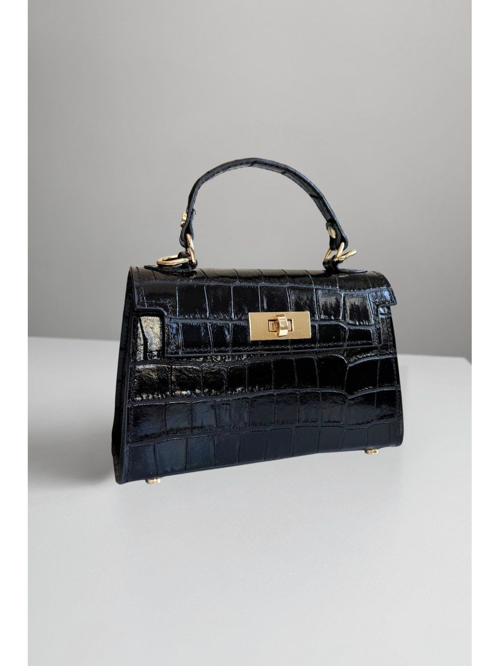 Elegantní malá kabelka ve stylu kufříku z pravé kůže, doplněná zlatými detaily a ozdobným zámkem.
