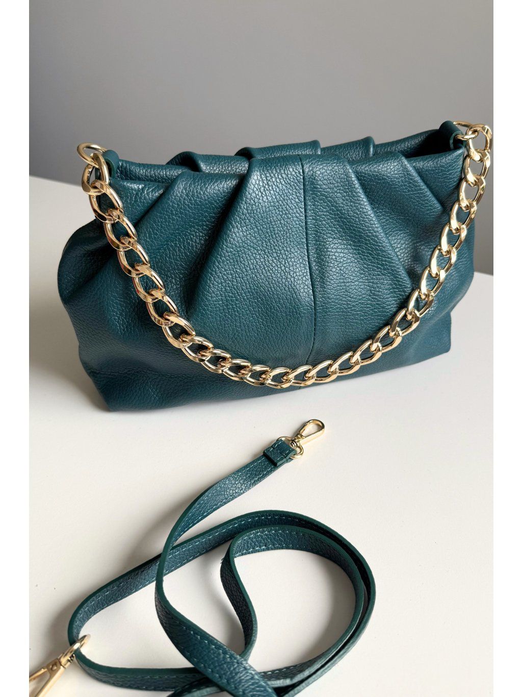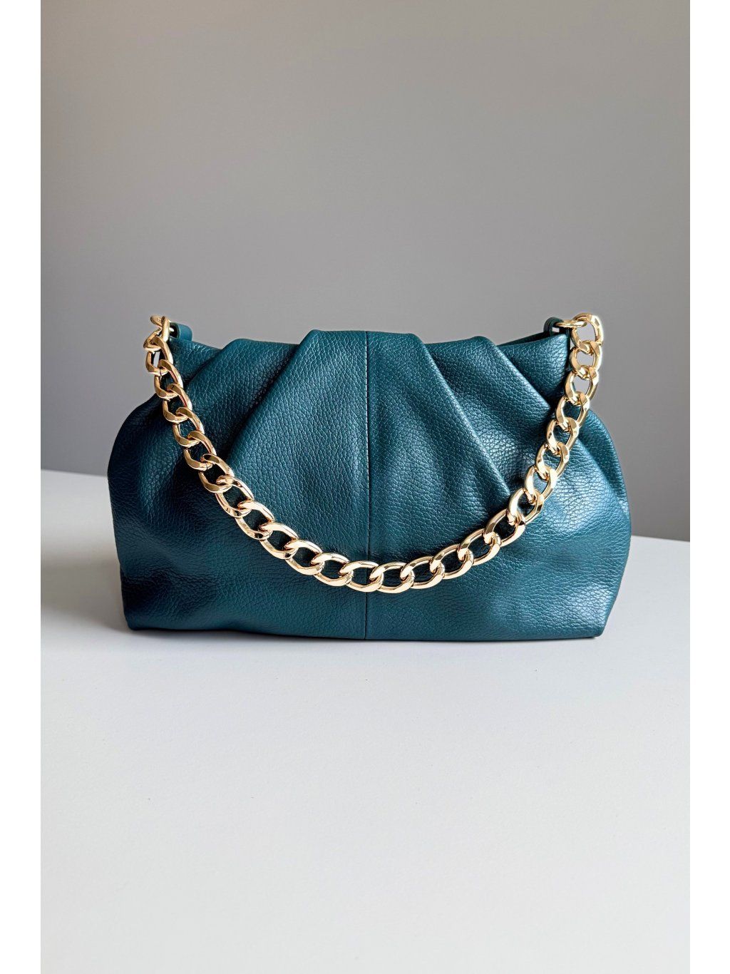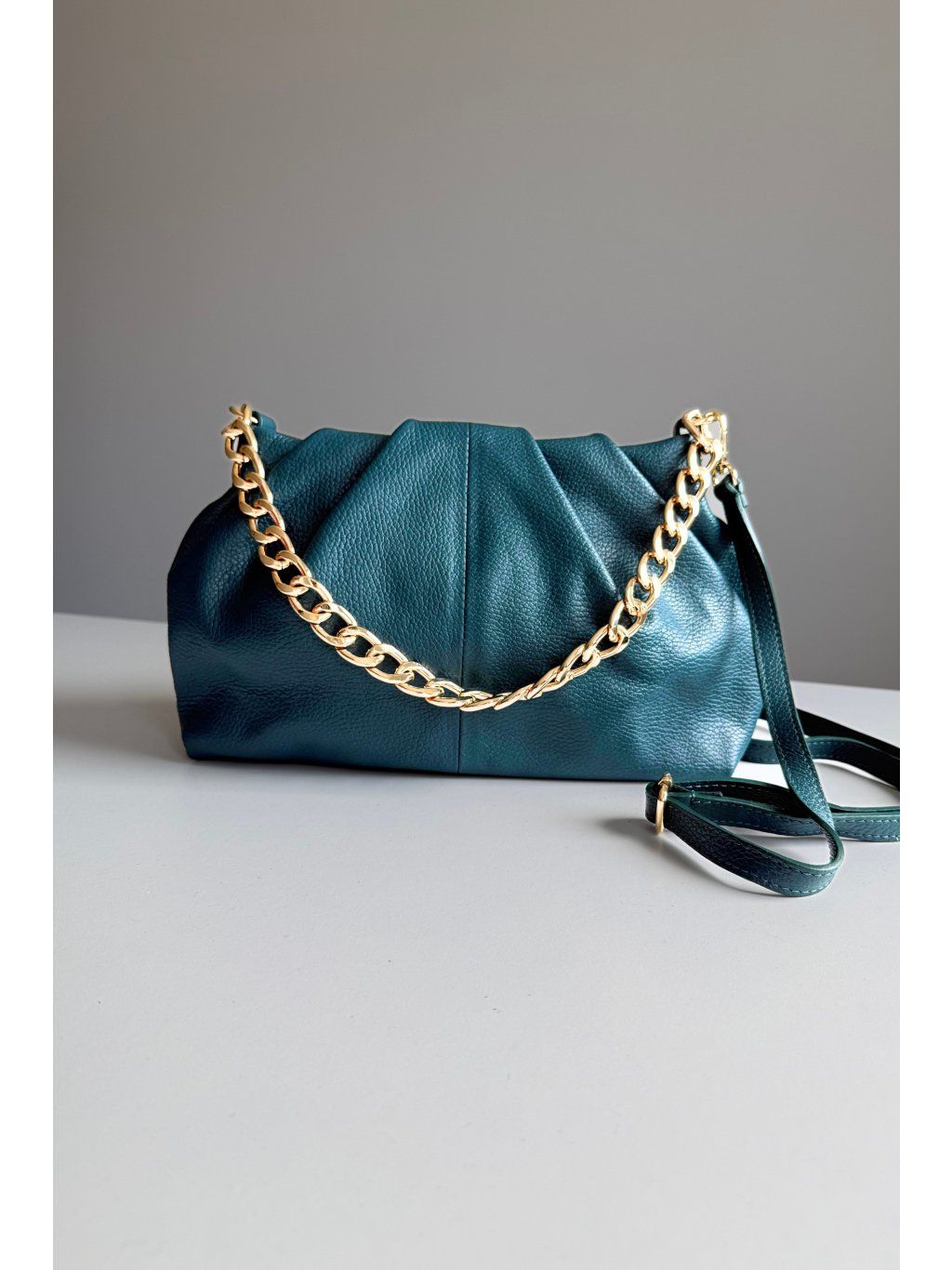Elegantní kabelka střední velikosti z pravé kůže, která kombinuje praktický design s výrazným detailem zlatého řetězu.