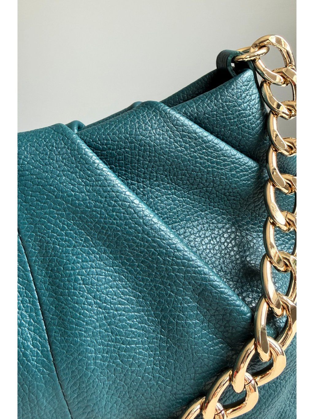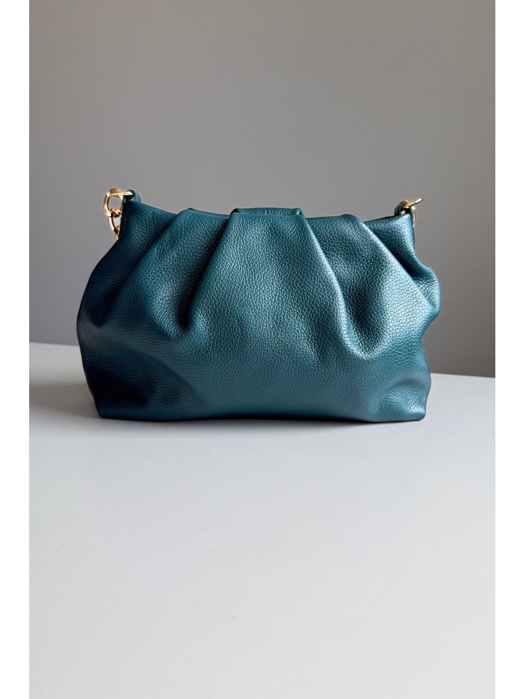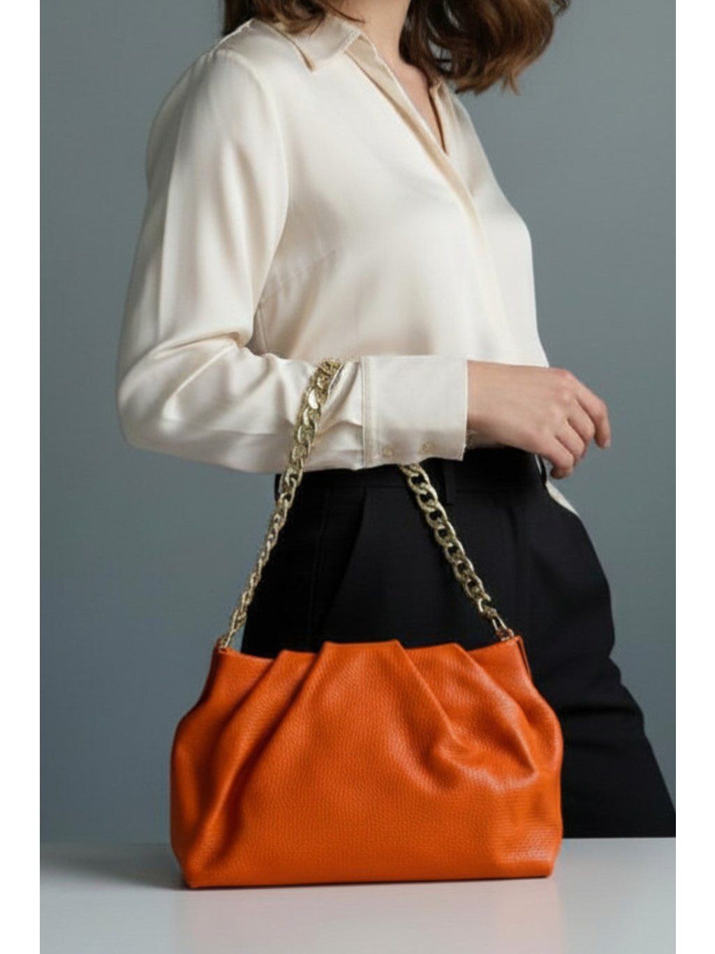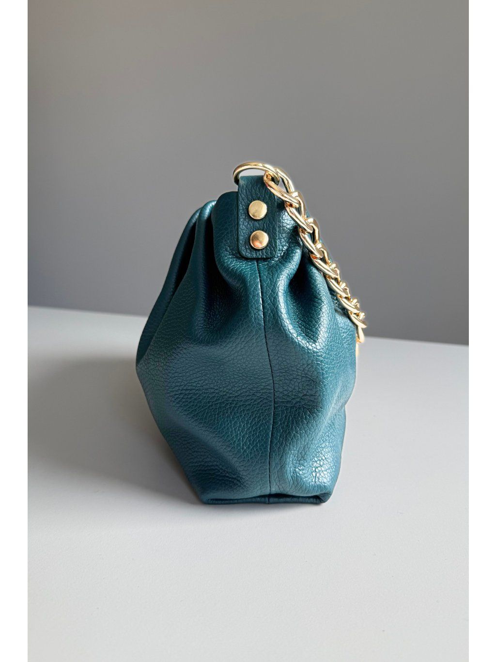 Elegantní kabelka střední velikosti z pravé kůže, která kombinuje praktický design s výrazným detailem zlatého řetězu.